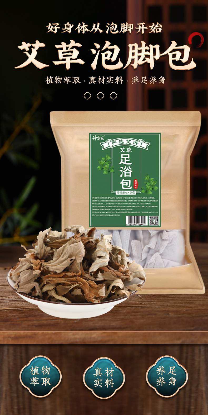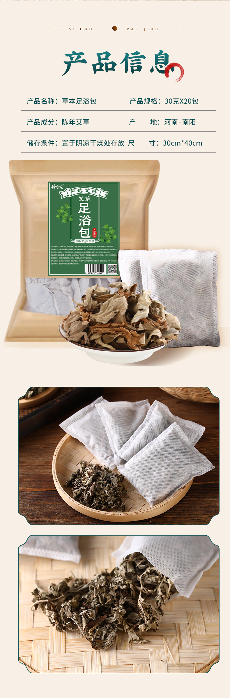 神农宛纯艾叶足浴包 泡脚泡澡皆可 四季可用 30g*20包/袋