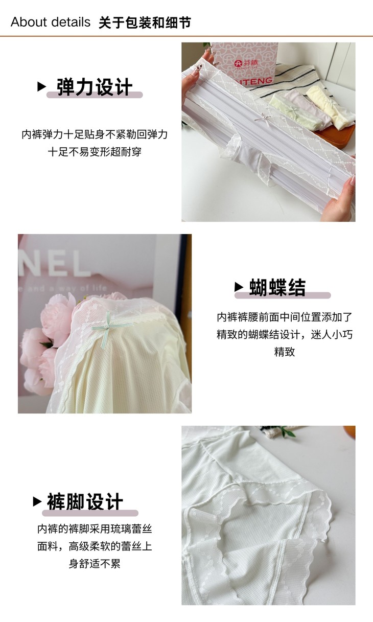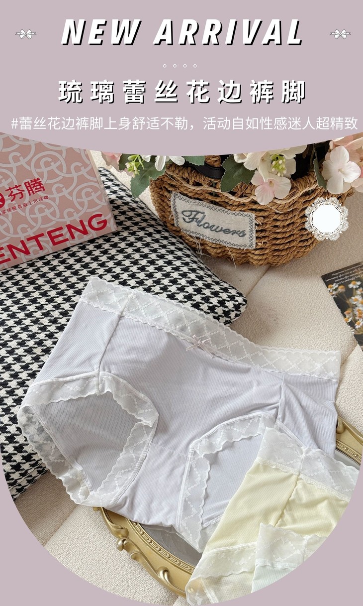 精致的琉璃蕾丝花边与蝴蝶结装饰,增添了一份优雅与浪漫,让内裤不仅是日常穿着的必需品,更是展现女性魅力的时尚单品!