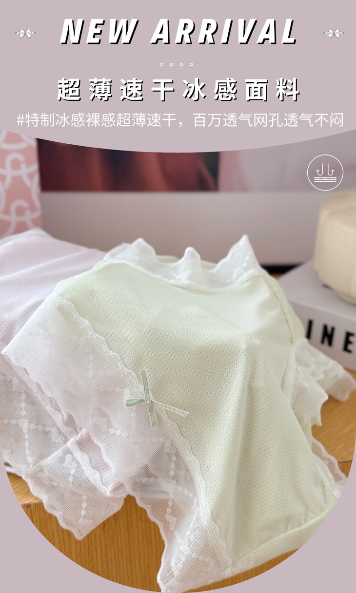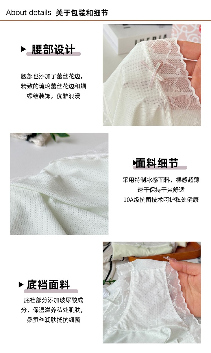 冰感裸感超薄面料百万透气网孔,保持干爽舒适 10A级高效抗菌技术,玻尿酸桑蚕丝底裆呵护私处健康