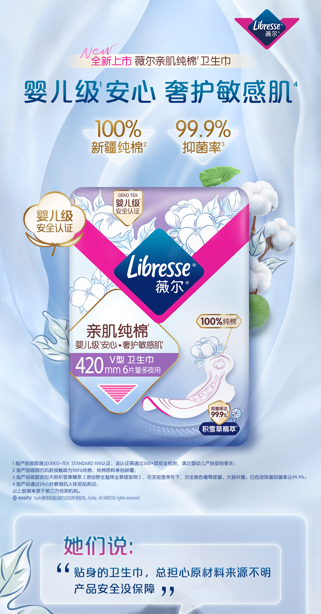 Libresse薇尔亲肌纯棉420mm夜用6片4包共24片 新疆纯棉 积雪草精萃抑菌 防漏