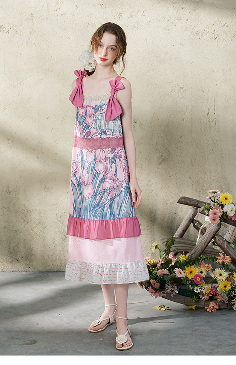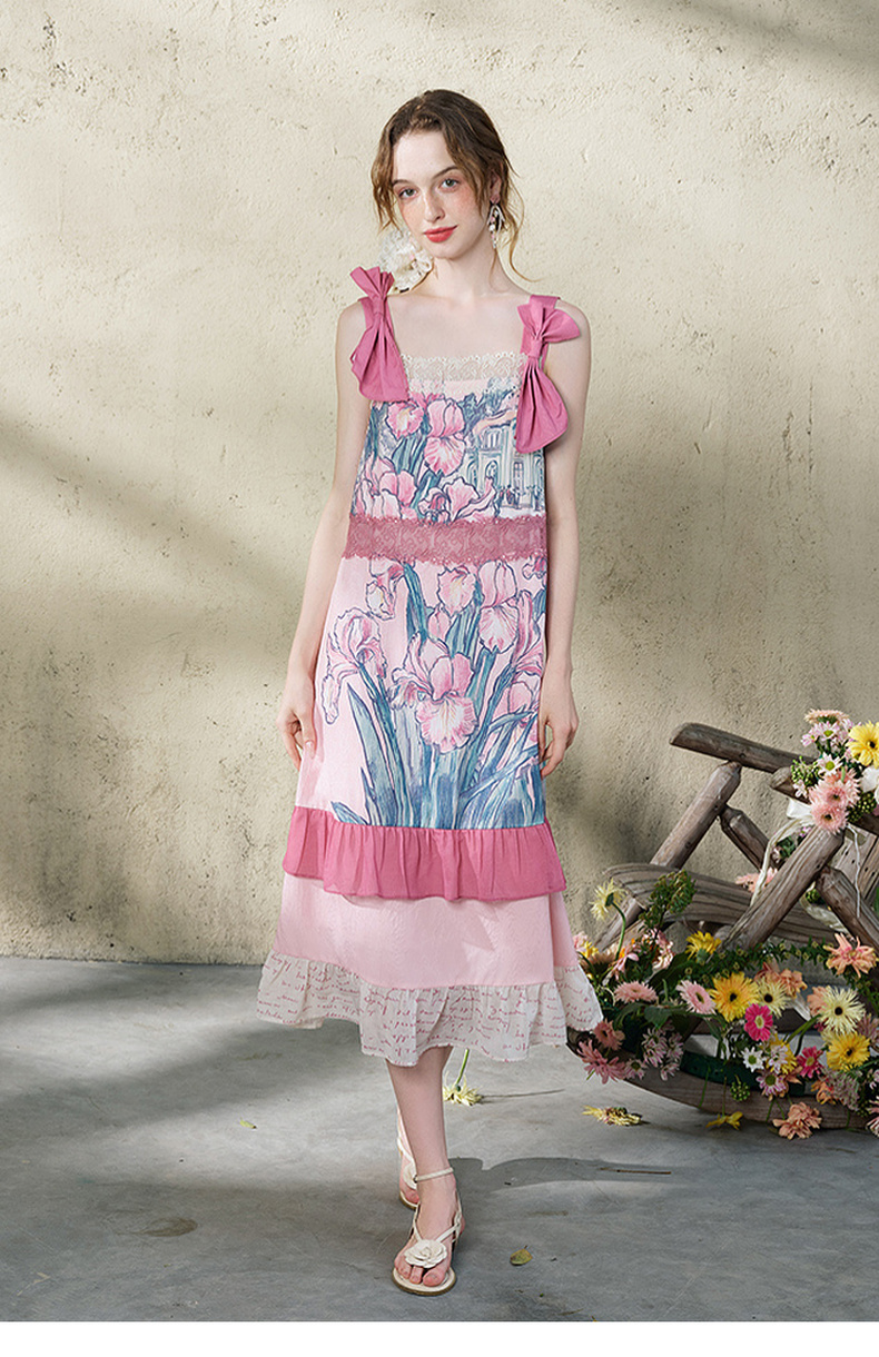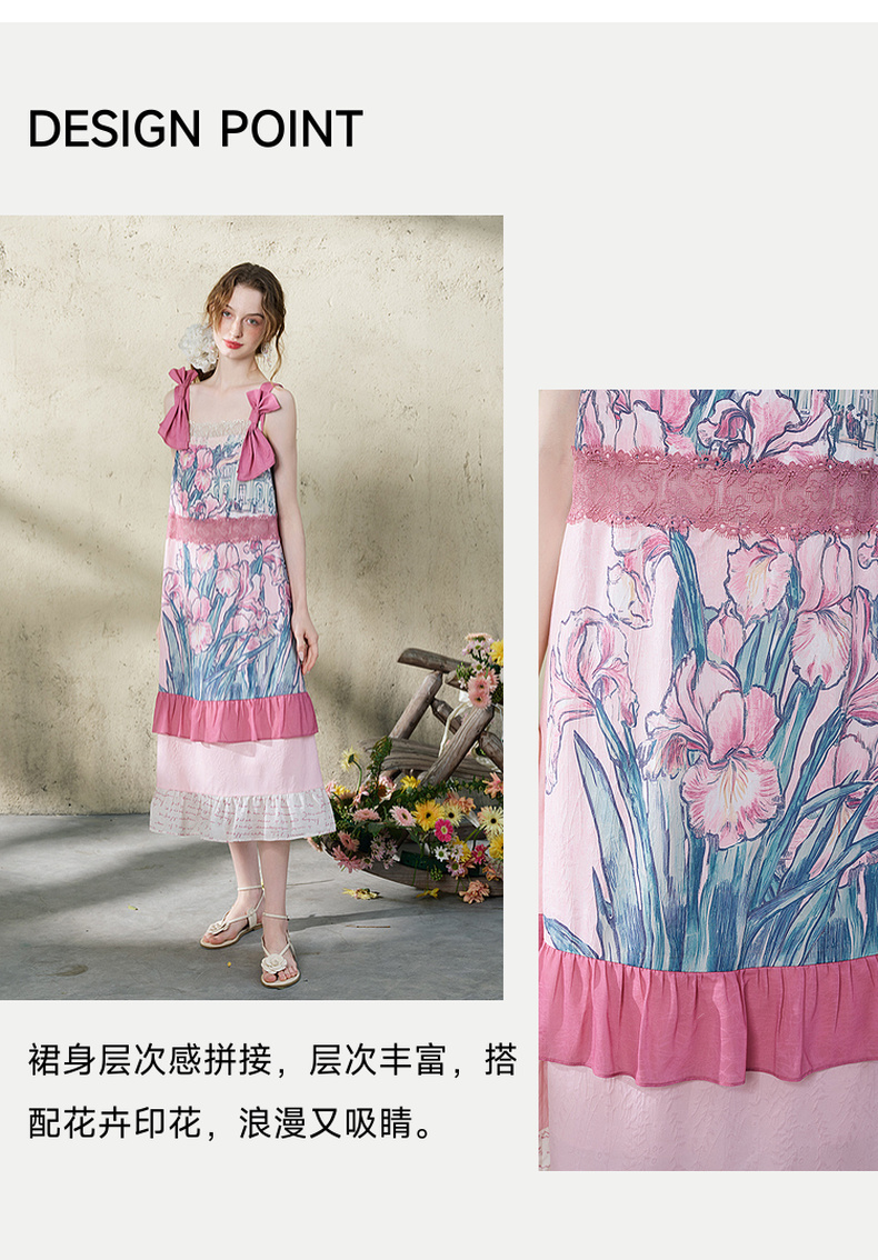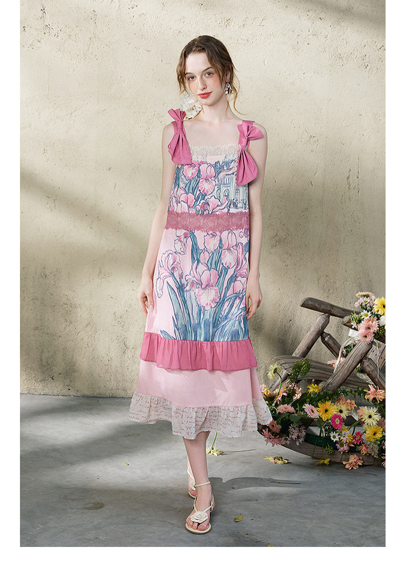 两三事 蝶舞霓裳 2025夏季新款复古蕾丝拼接立体蝴蝶结印花连衣裙
