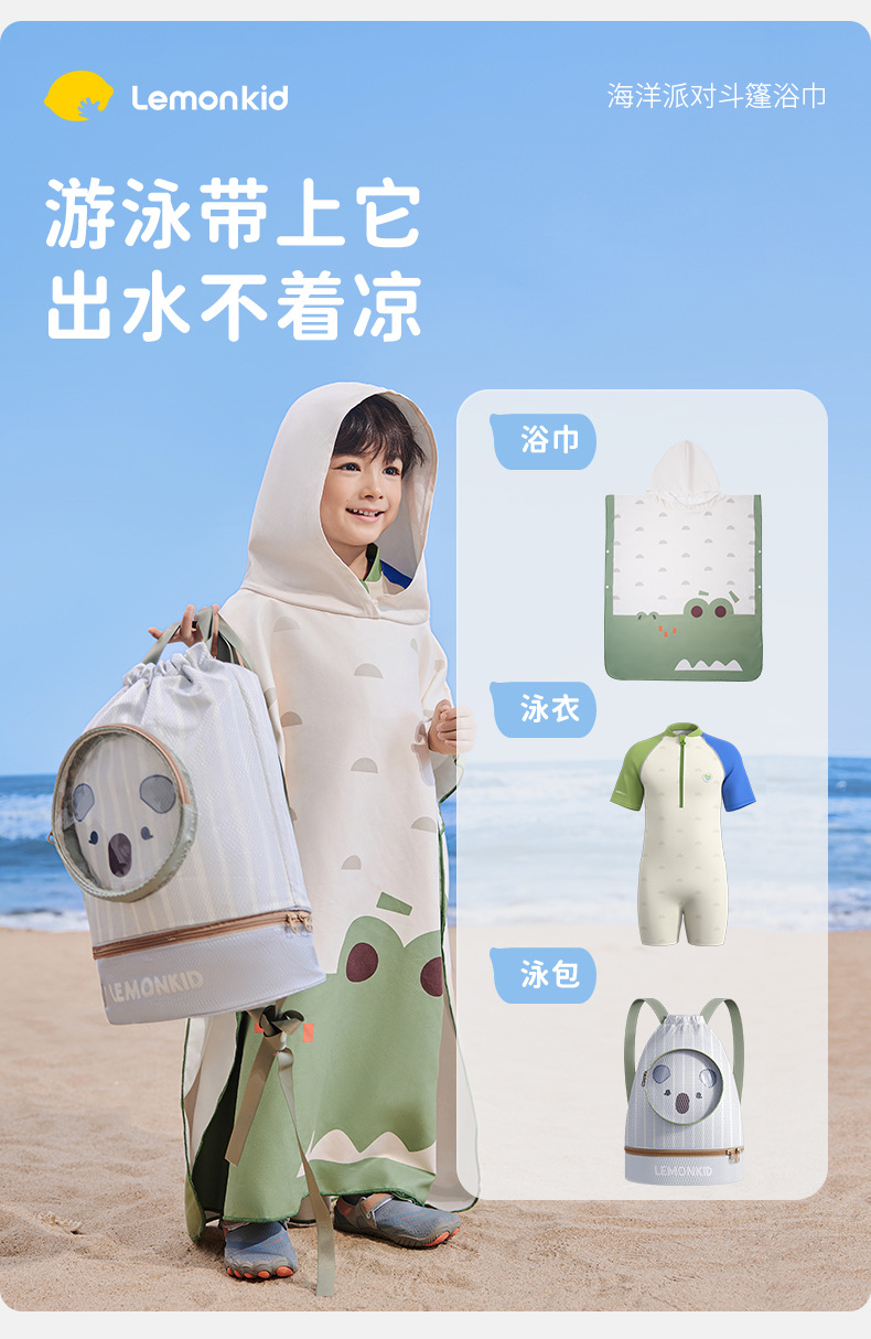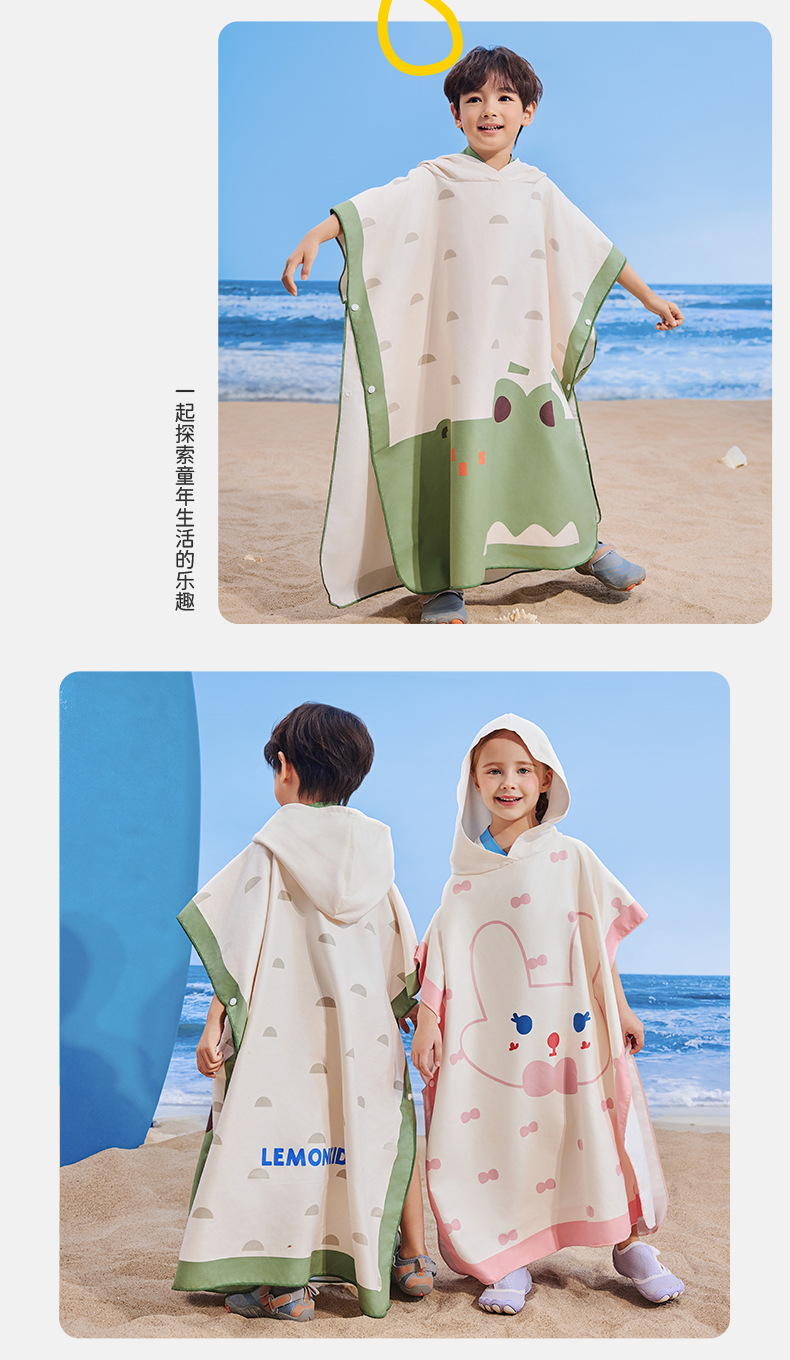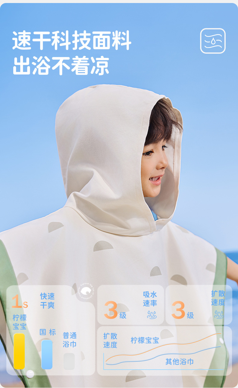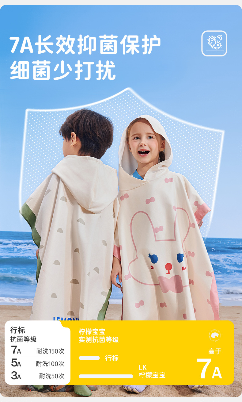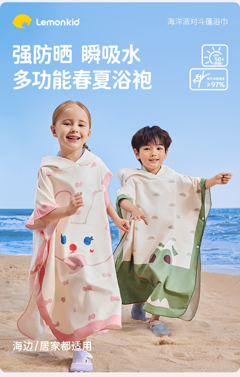 【强防晒,瞬吸水,多功能春夏浴袍】柠檬宝宝儿童游泳速干浴巾 斗篷浴袍 男女童吸水快干 沙滩温泉浴衣巾