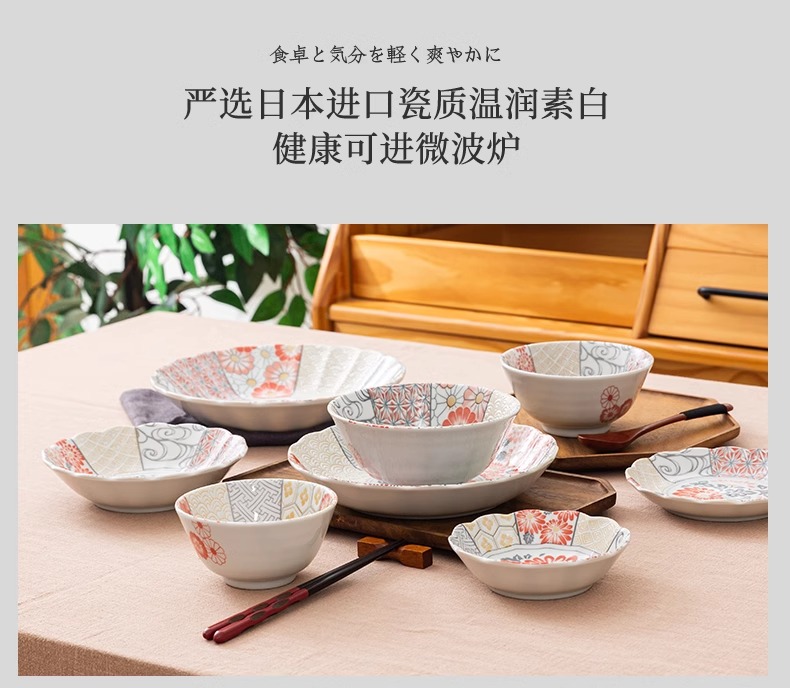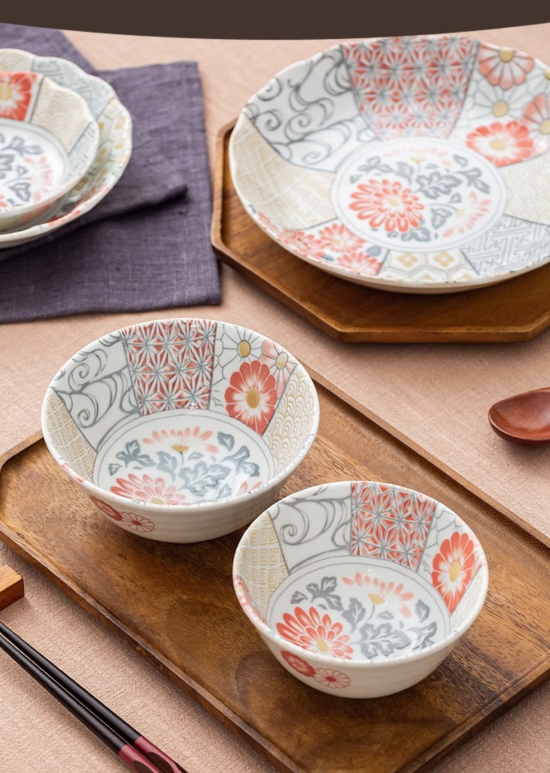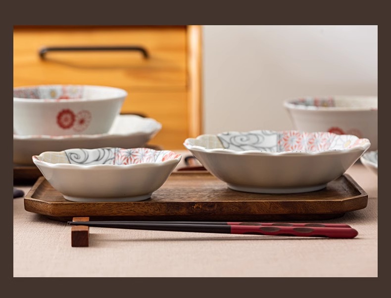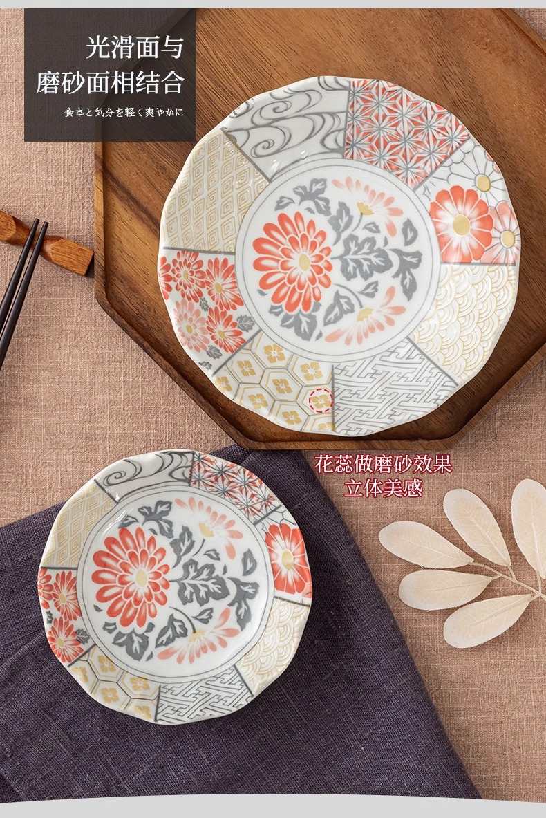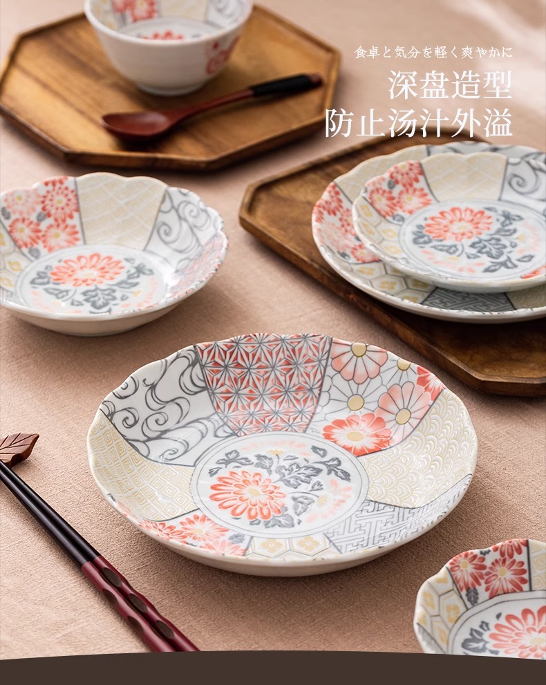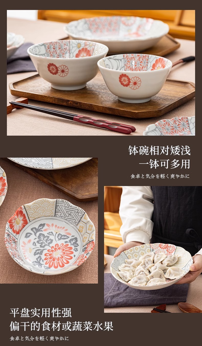 有古窑碗盘子菜盘家用高级米饭碗 日式釉下彩面碗高颜值平盘浅盘12件套