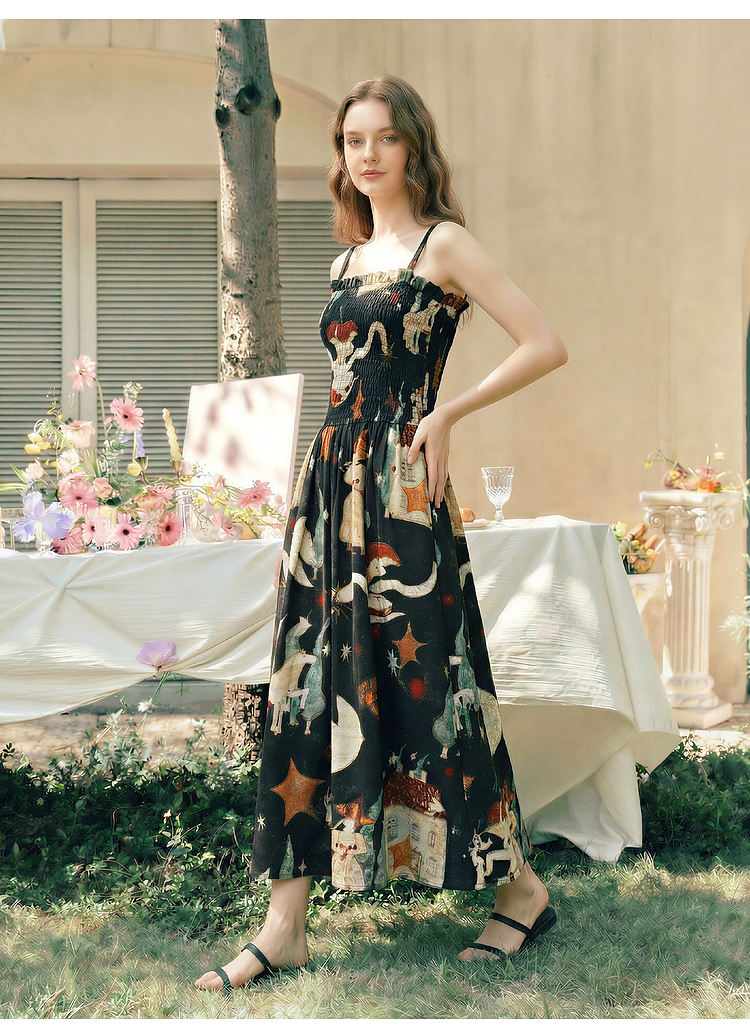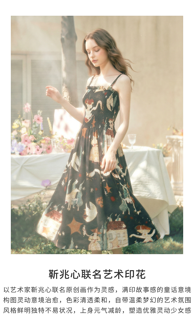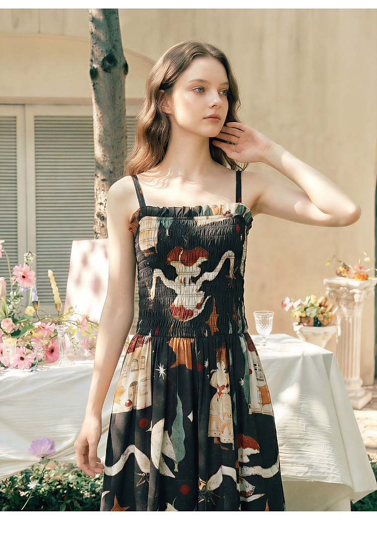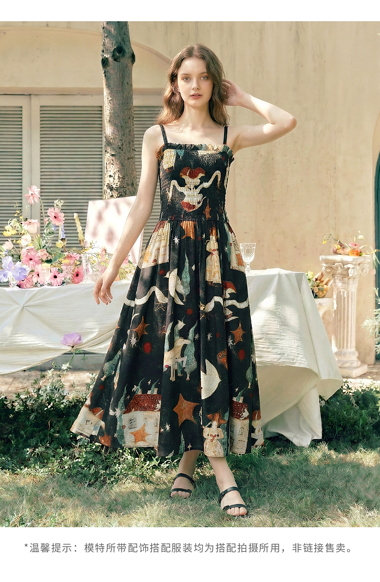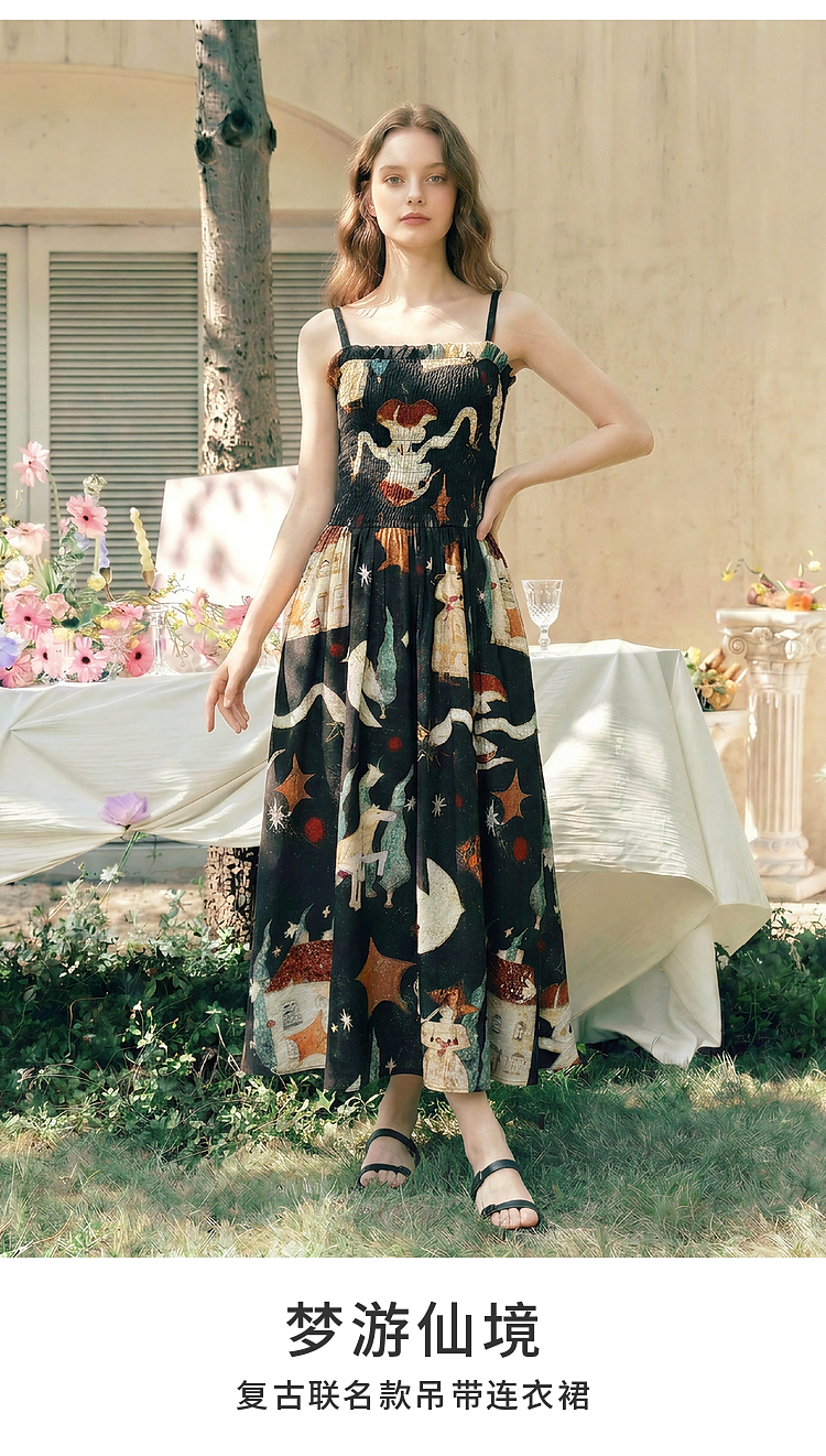 两三事 梦游仙境 2026夏季新款复古艺术风印花吊带裙连衣裙