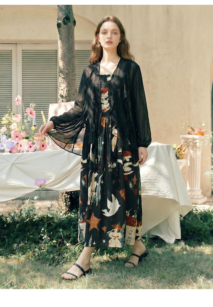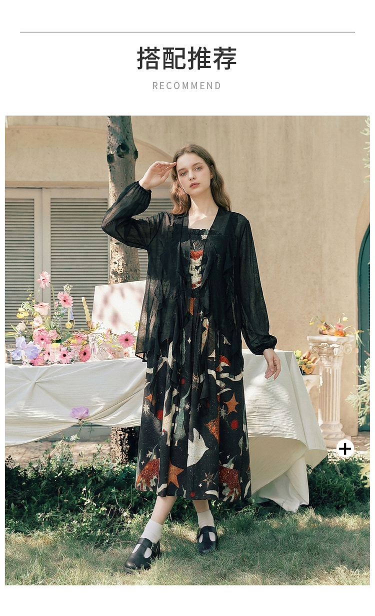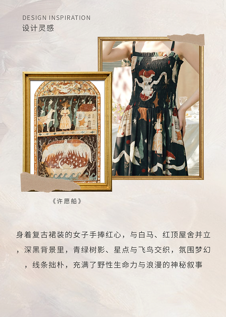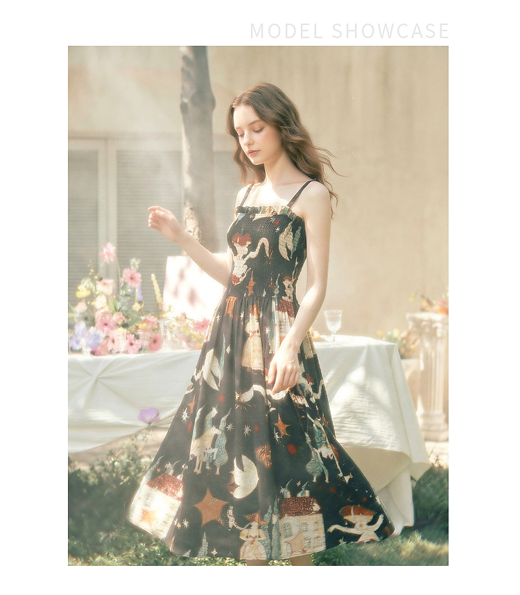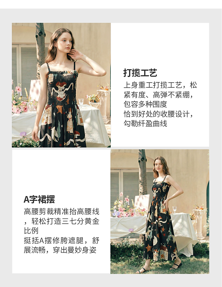 两三事 梦游仙境 2026夏季新款复古艺术风印花吊带裙连衣裙