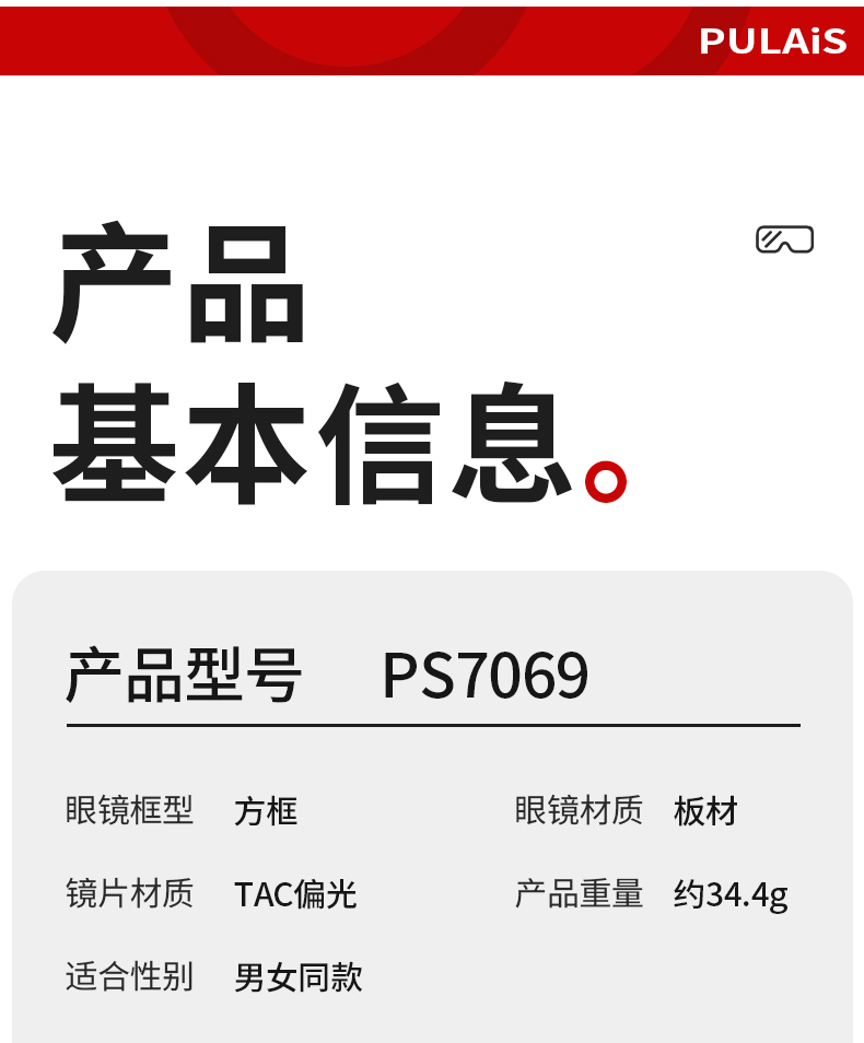普莱斯PS7069太阳镜 潮流方框 复古摩登 TAC偏光镜框 进口板材镜框 双色可选