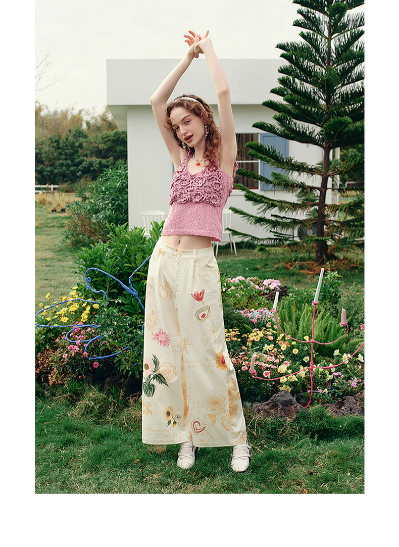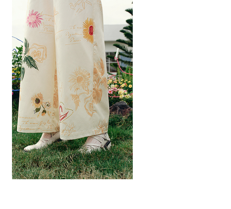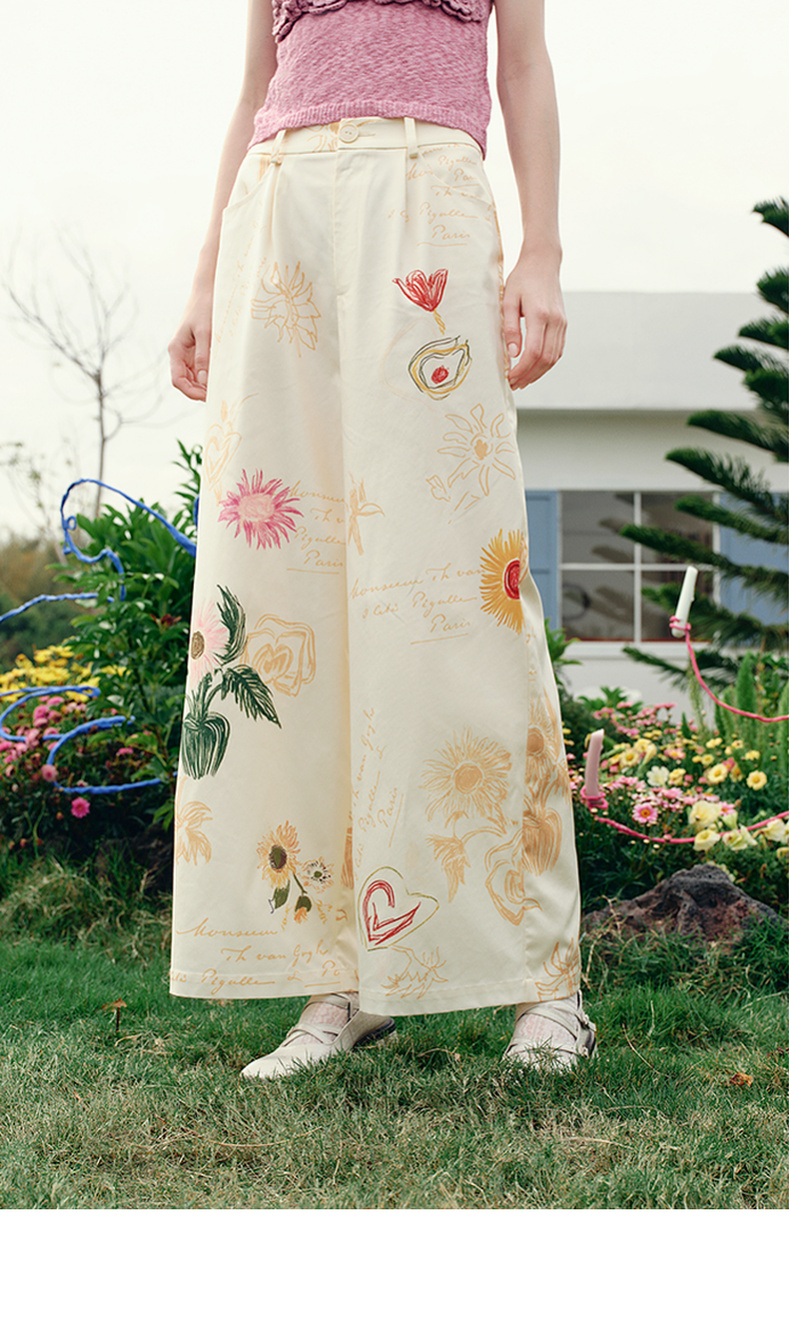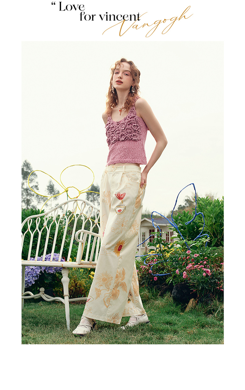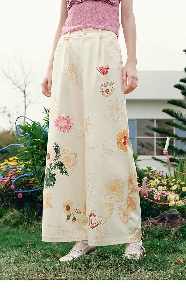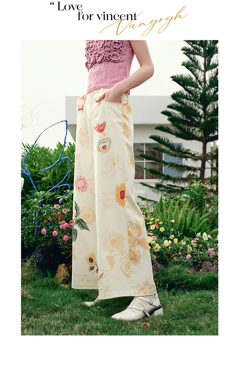 两三事梵高文艺云游芳甸2025夏季新款小清新印花高腰阔腿休闲裤女