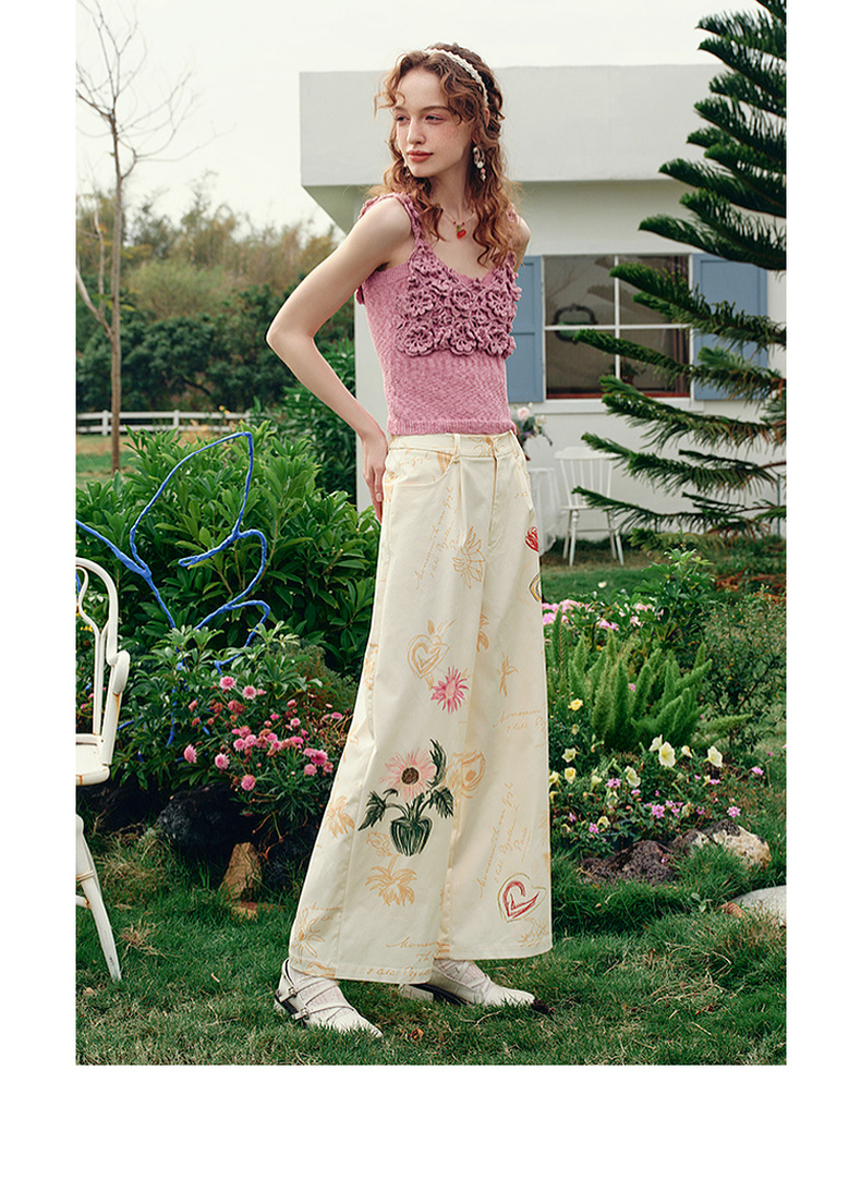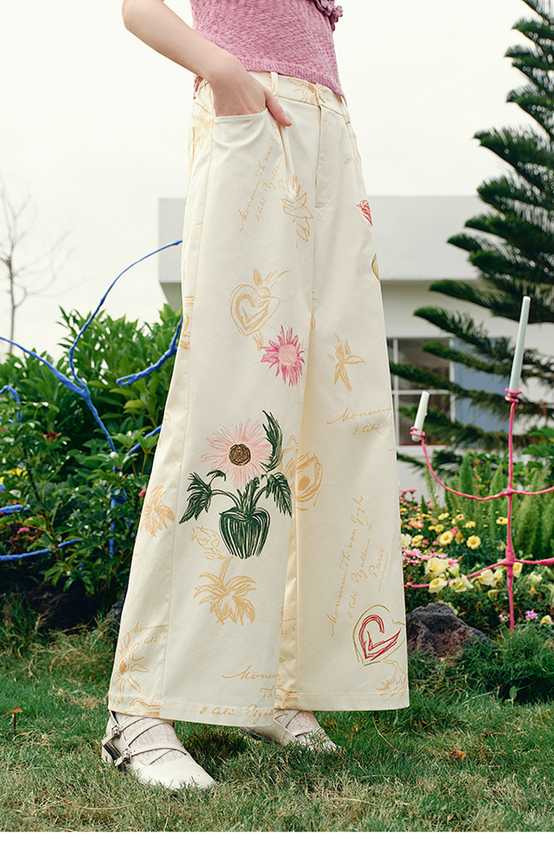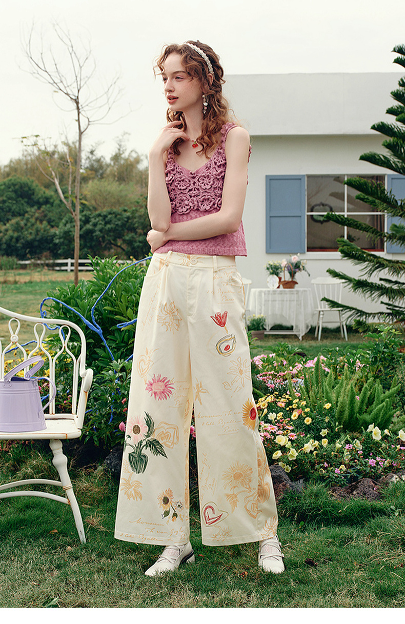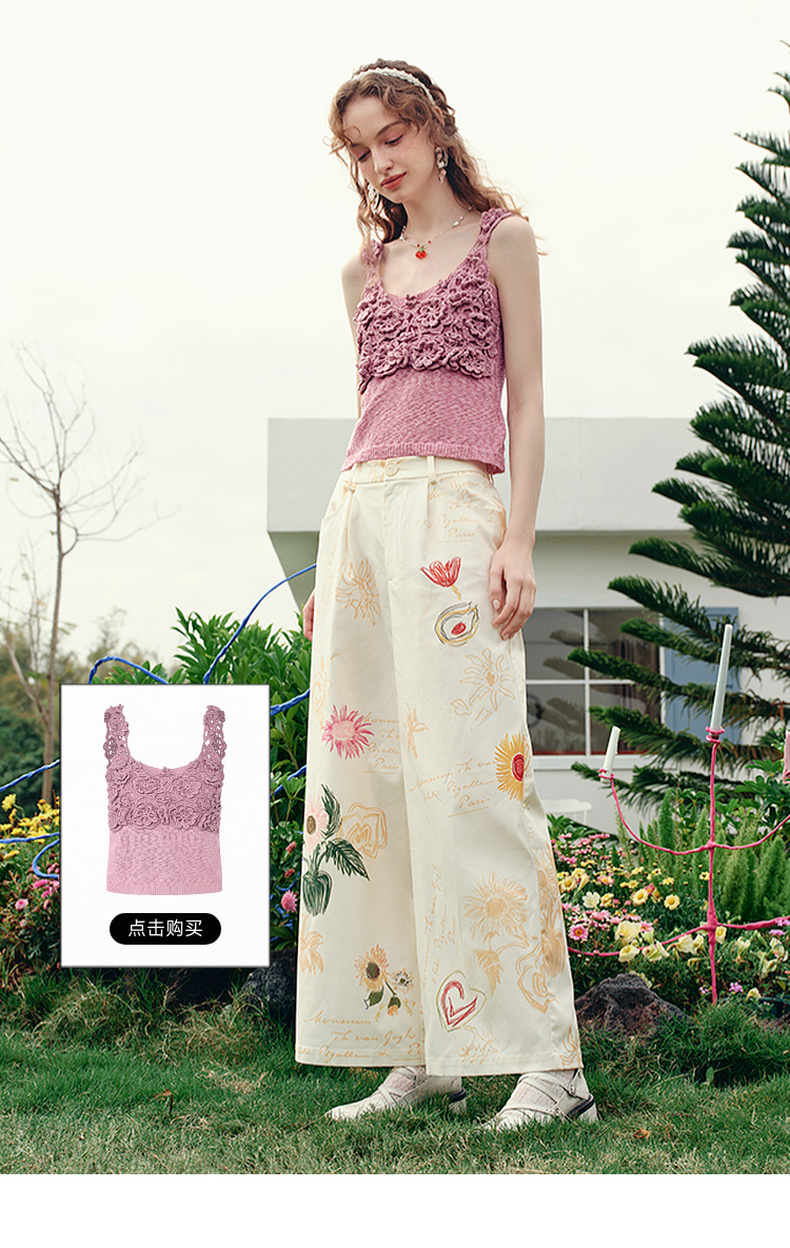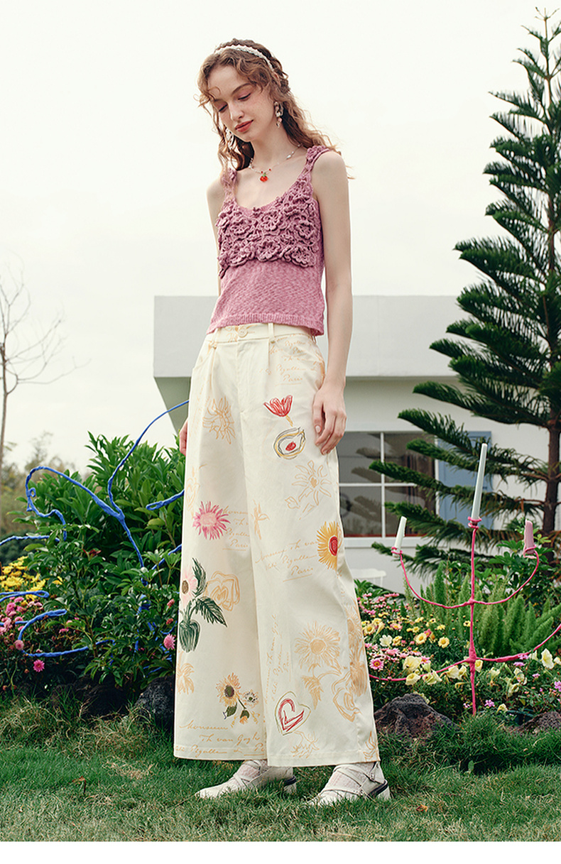 两三事梵高文艺云游芳甸2025夏季新款小清新印花高腰阔腿休闲裤女