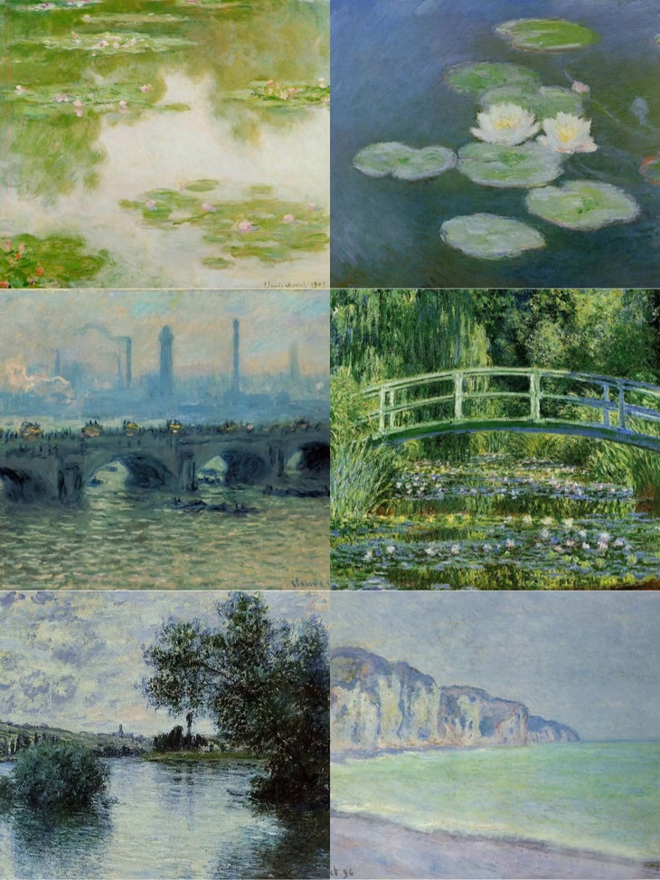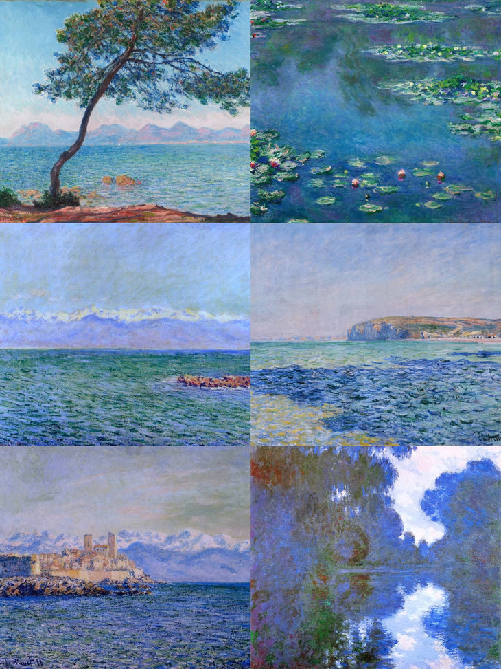 一组莫奈的“蓝”,是海浪的冲击、是天光的舞蹈,还包含植物的绿、花朵的粉和紫,钴蓝、群青、灰蓝...它们是跳跃而无所不包的。