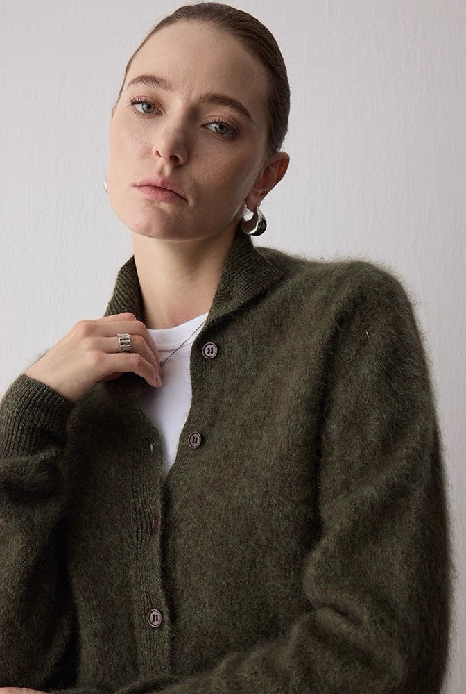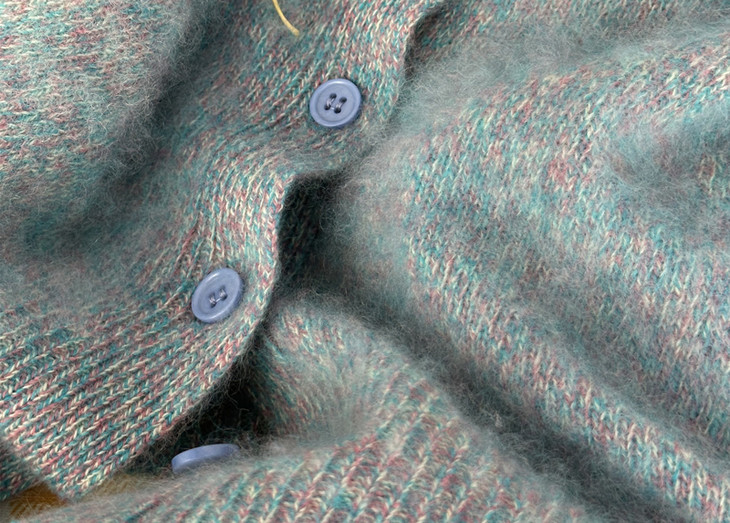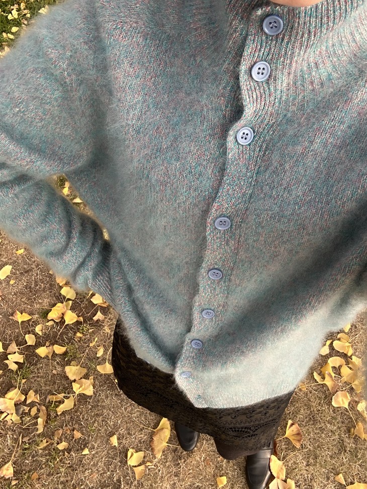 正如这件羊毛衫上的纱线,黄绿、蓝绿捕捉到不同时间的光线,让这件绿色开衫有了温度、湿度和季节感。