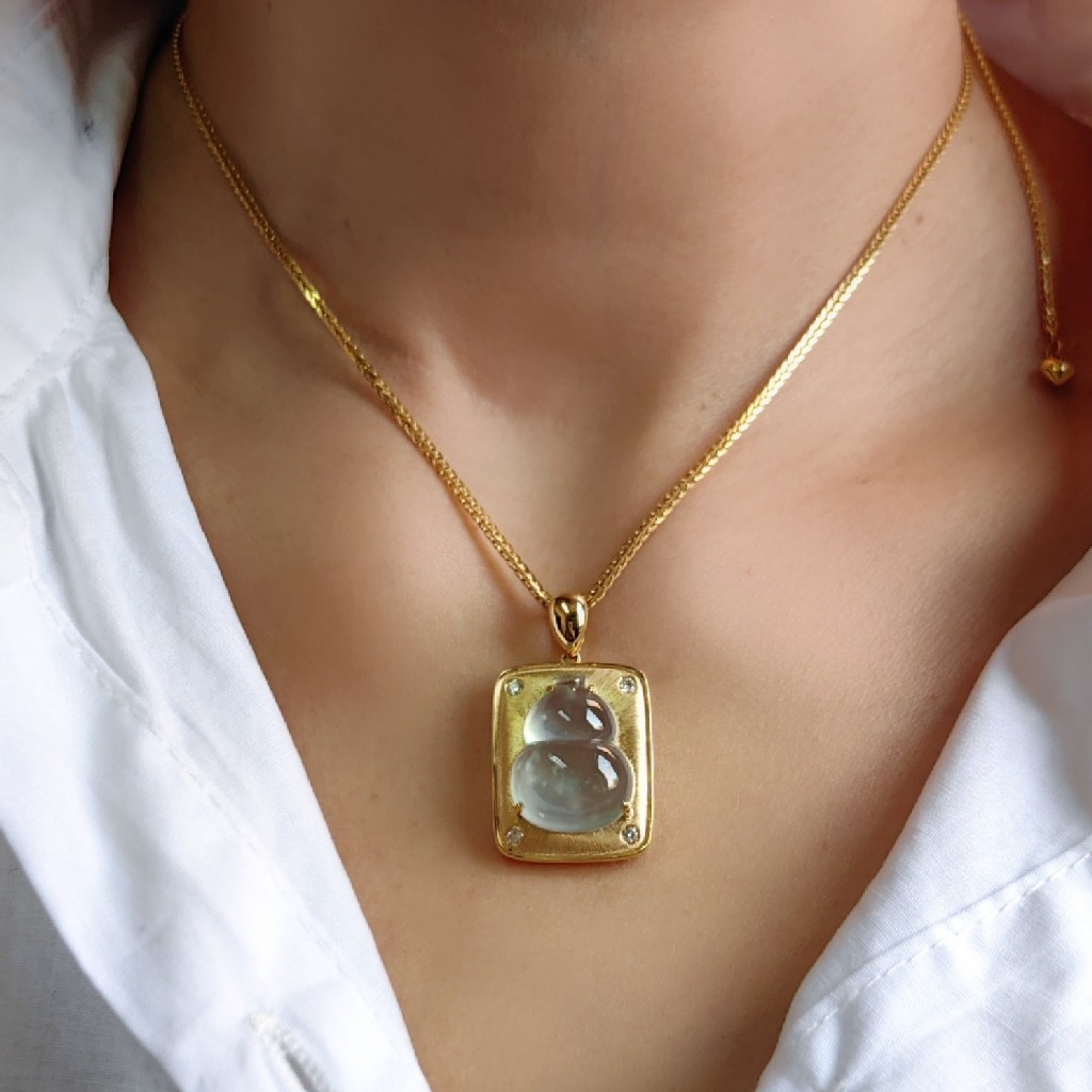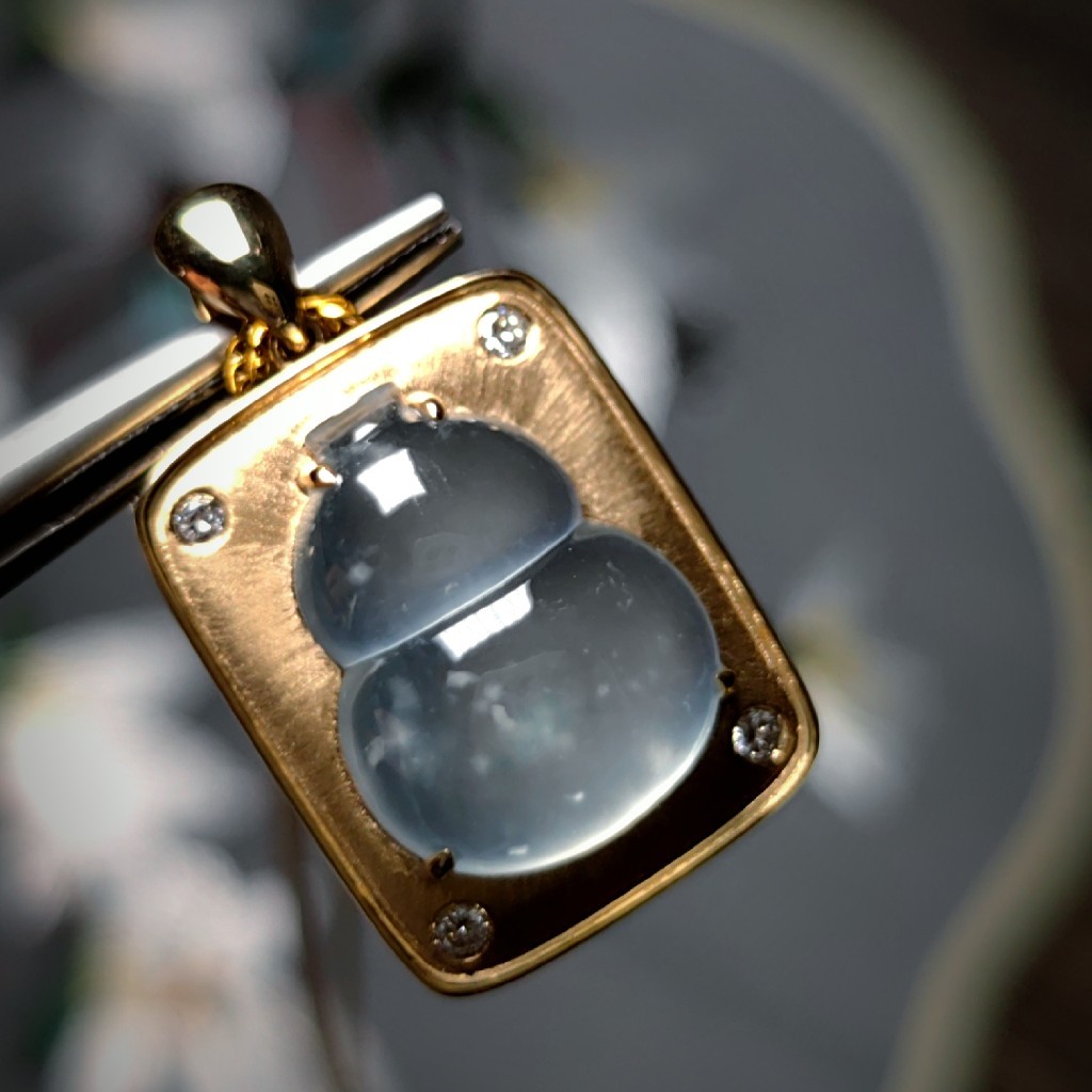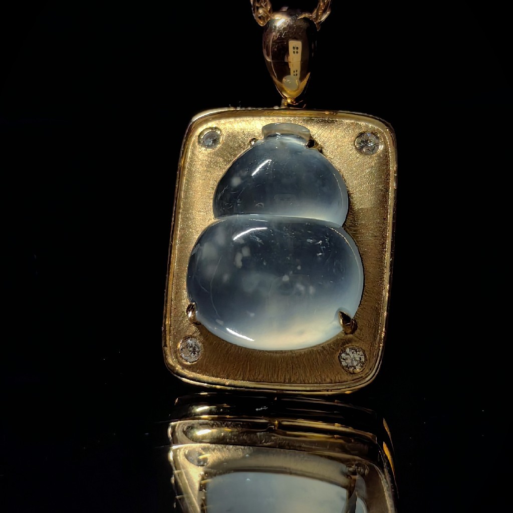 和工厂反复沟通后修改后,最终定款。用18k金拉丝工艺做出平安牌造型,托起玻璃种葫芦,在平安牌的四个角又各自镶嵌了一枚3分的钻石,寓意平平安安走四方。