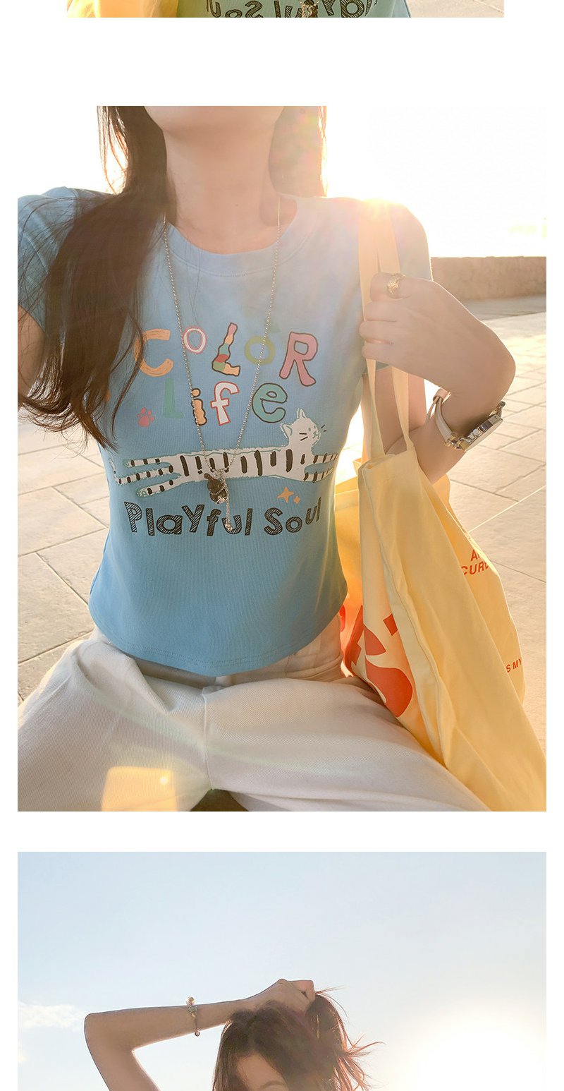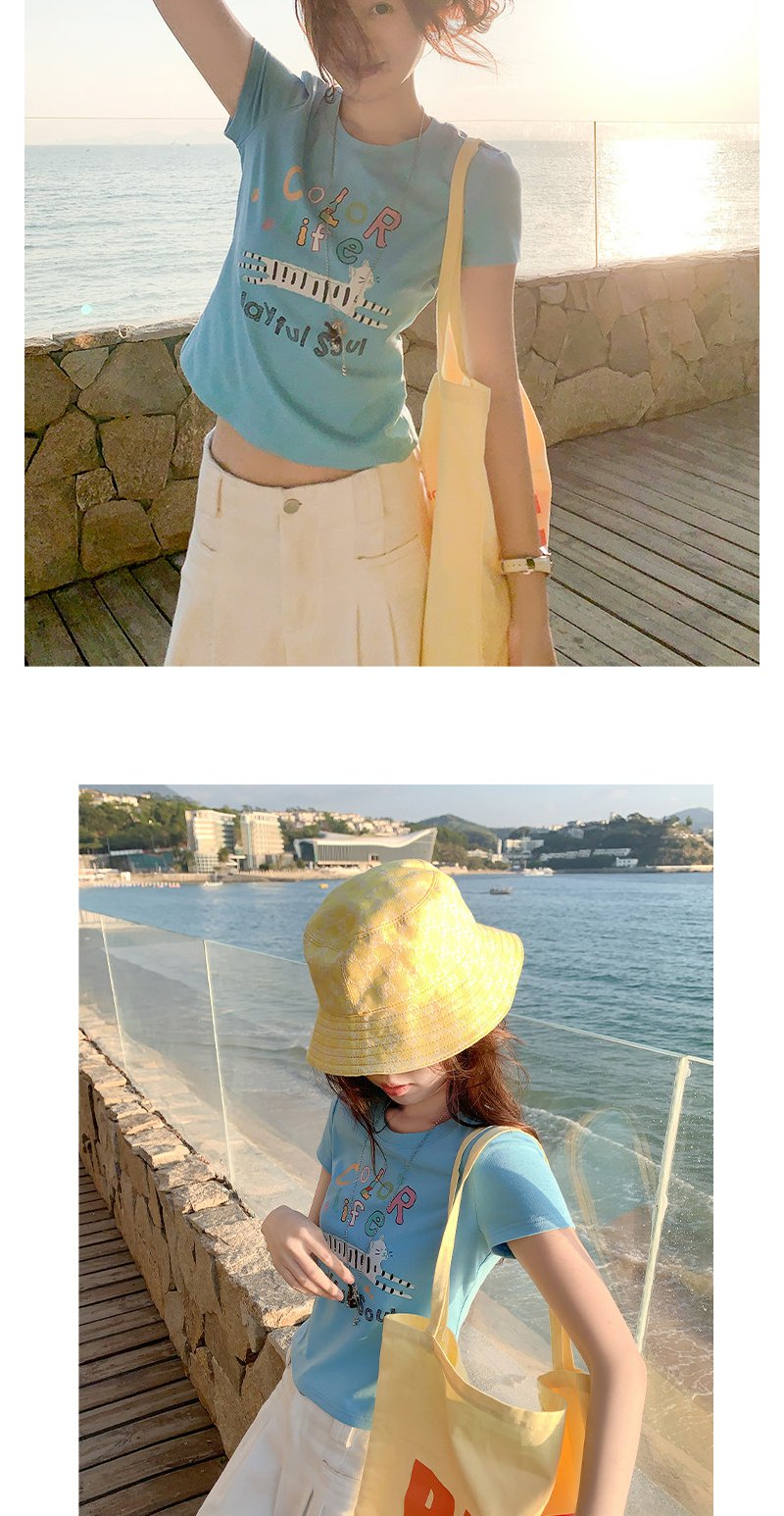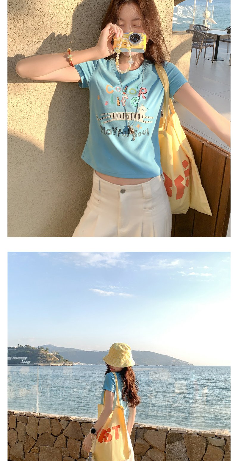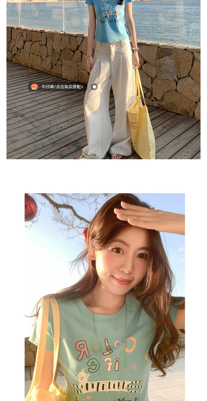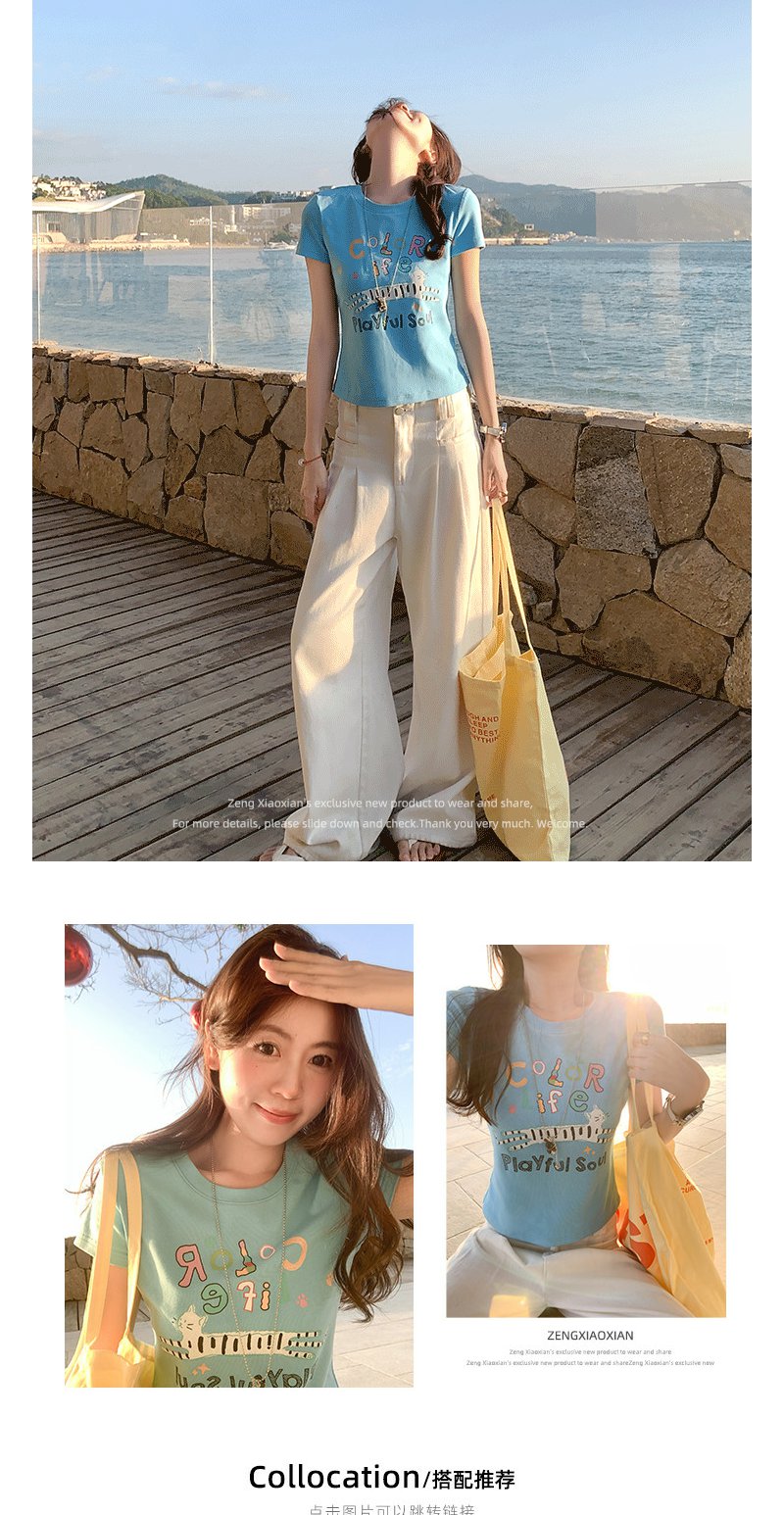 <曾小咸推荐>韩系印花短袖t恤女蓝色上衣