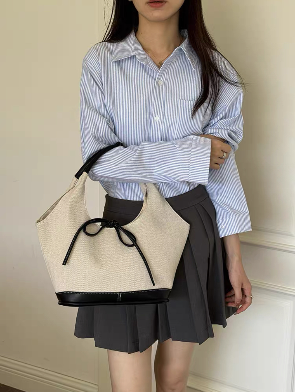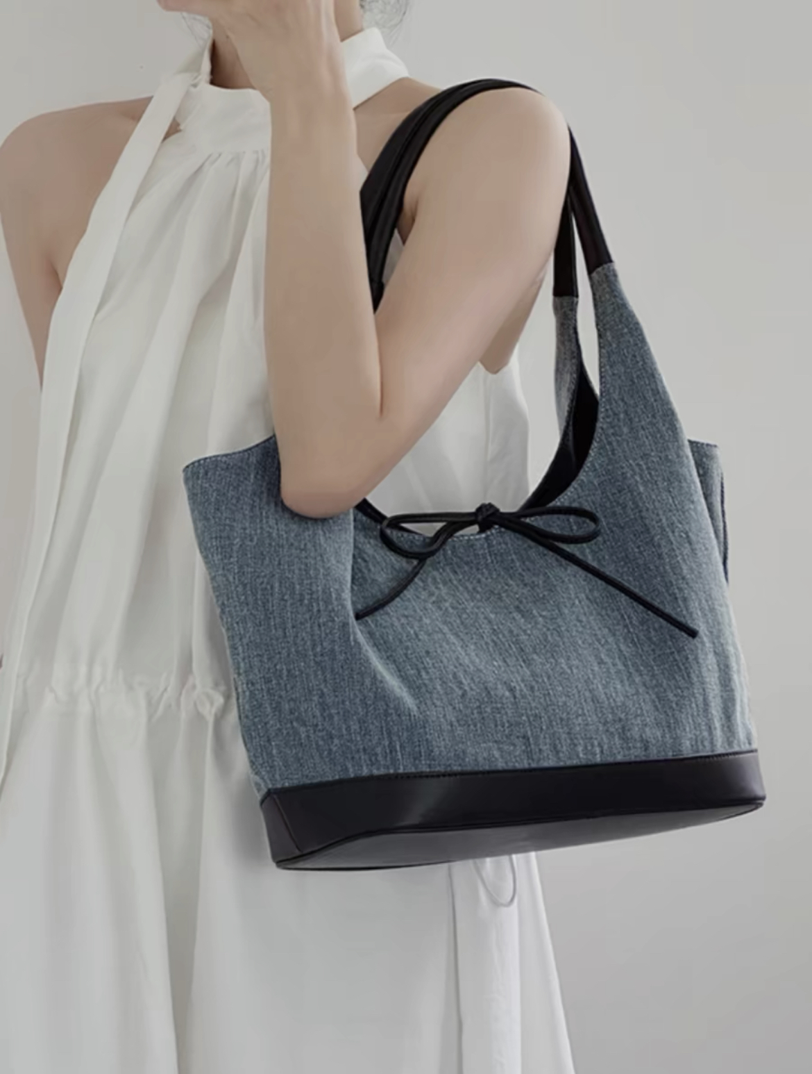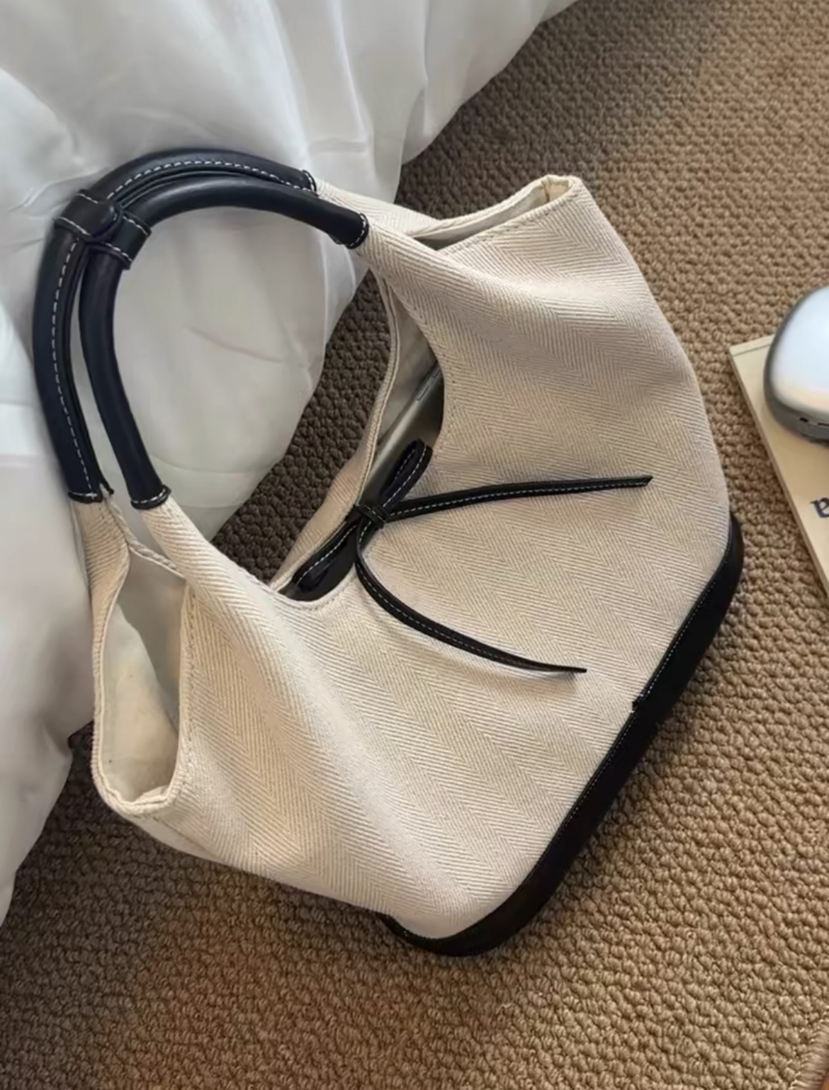 韩系蝴蝶结小众帆布拼接单肩腋下包大容量简约通勤时尚手提托特包