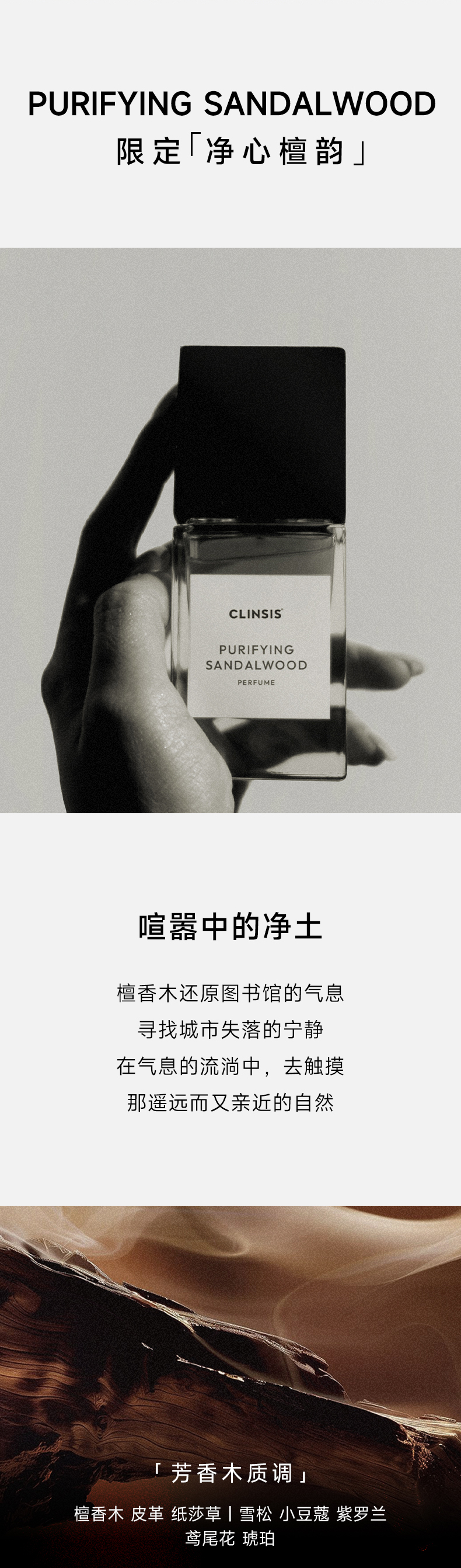 后调木质香裹挟奶感烟熏香,类似“陈年檀木手串”的温润醇厚,雪松延续清冷基底,形成矛盾而平衡的尾韵