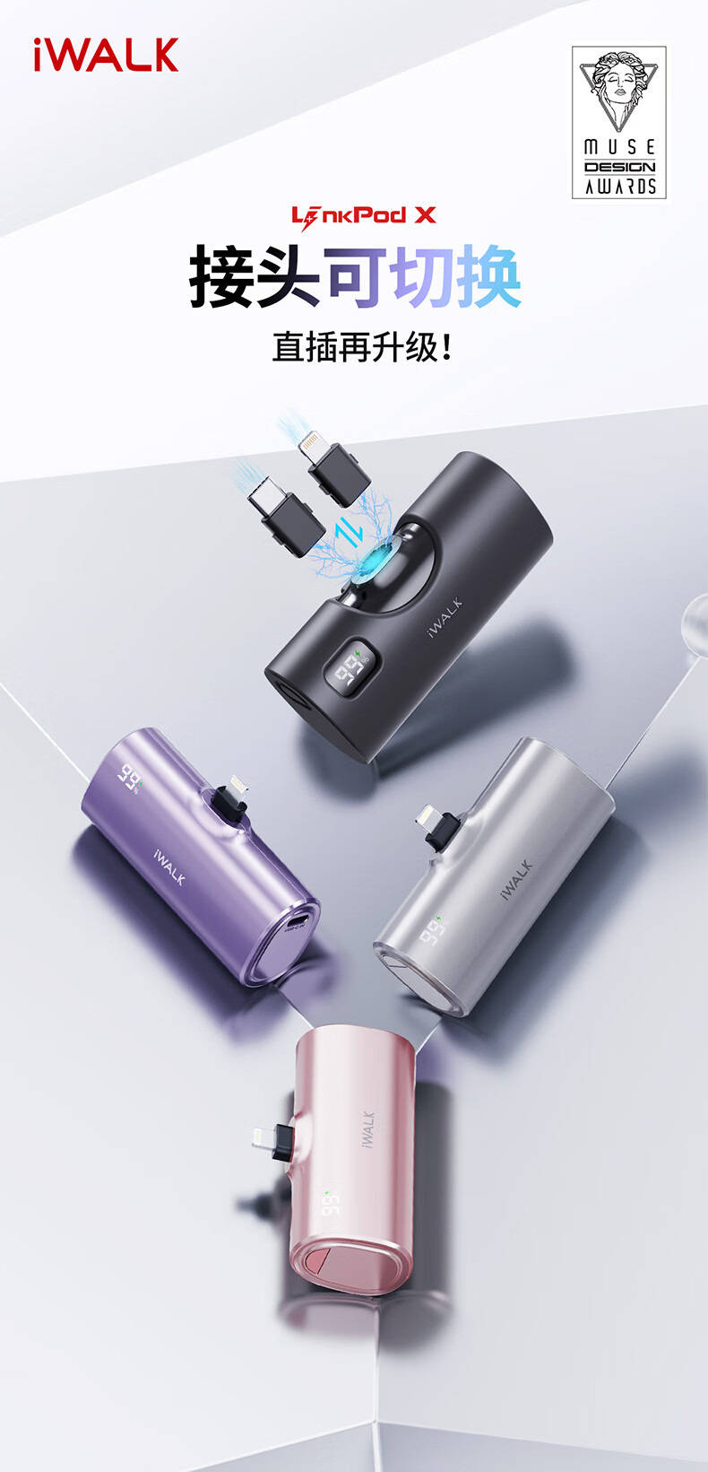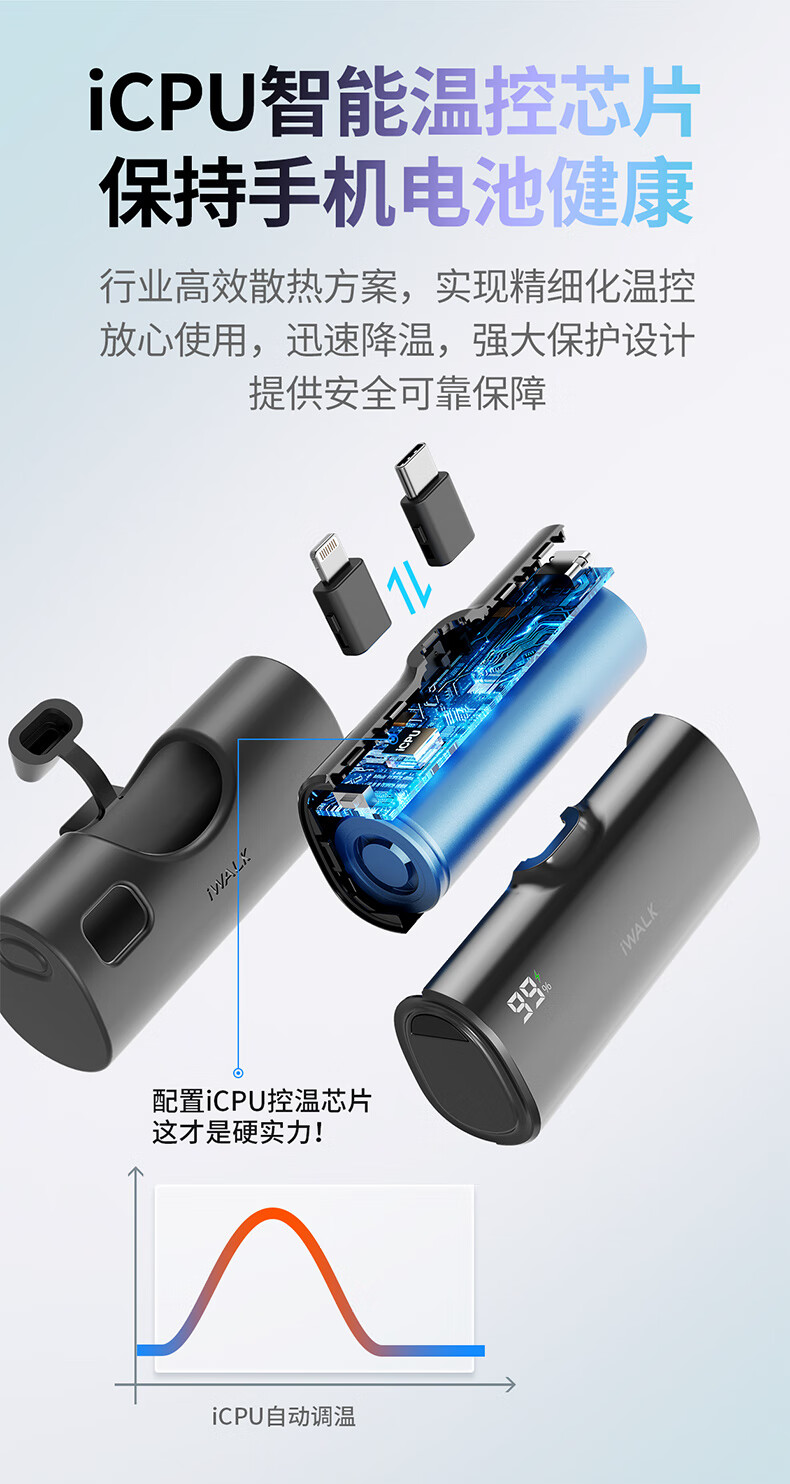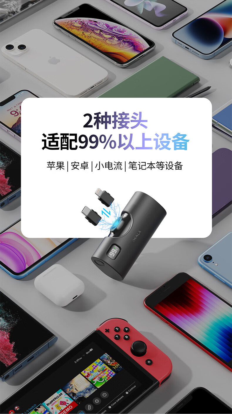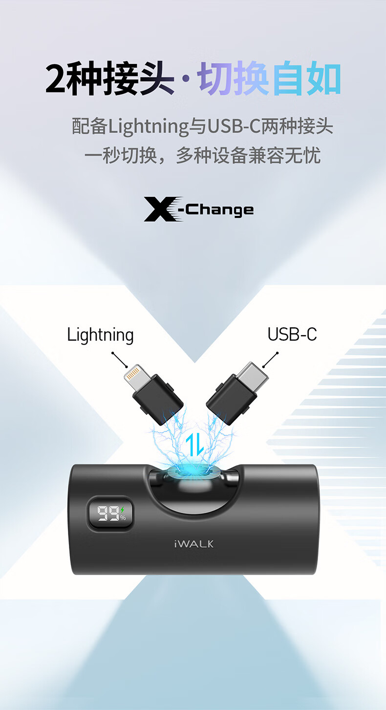 【国家3C认证】爱沃可(iWALK)LPX001胶囊充电宝PD快充20w小巧便携可换接头适用苹果iphone15华为小米安卓迷你便携应急电源