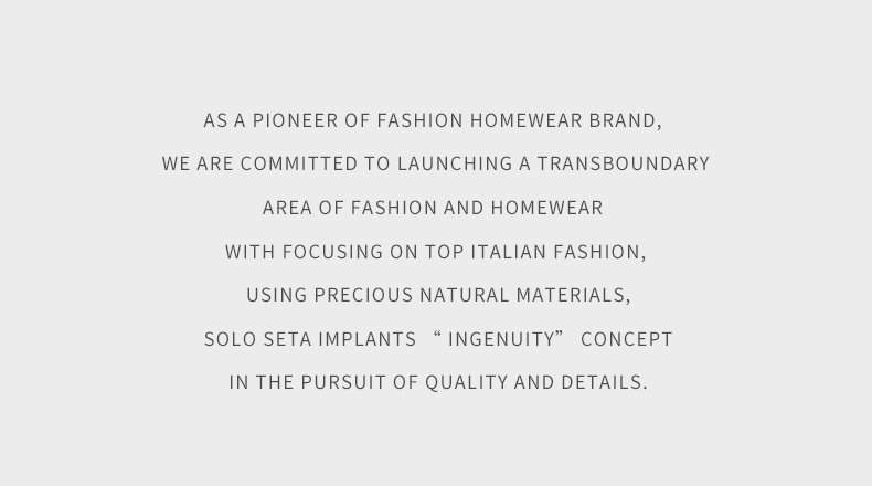 - soloseta专注于真丝织物,灵感源自意大利语,中文含义为“只做真丝”的意思。让睡衣变时尚,居家和外出瞬间切换,使其更具有出街,度假,参加宴会等功能。