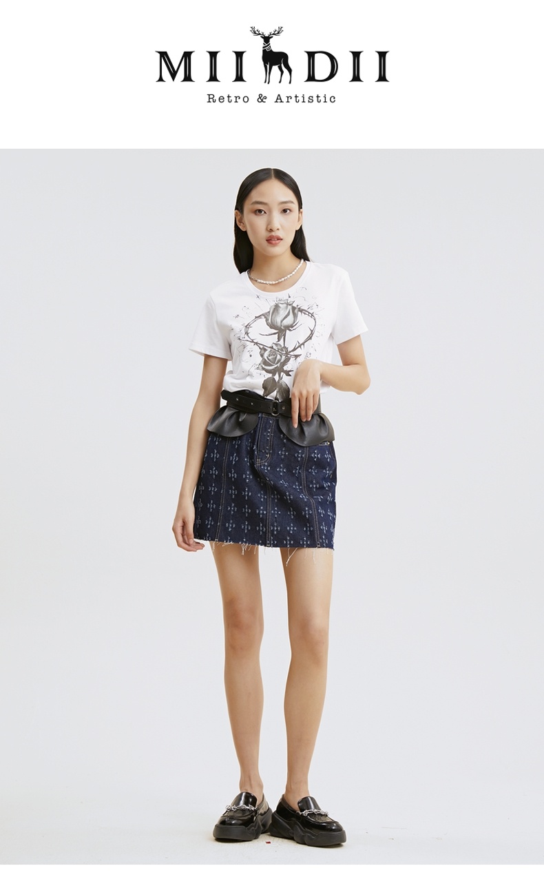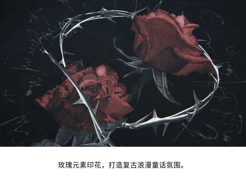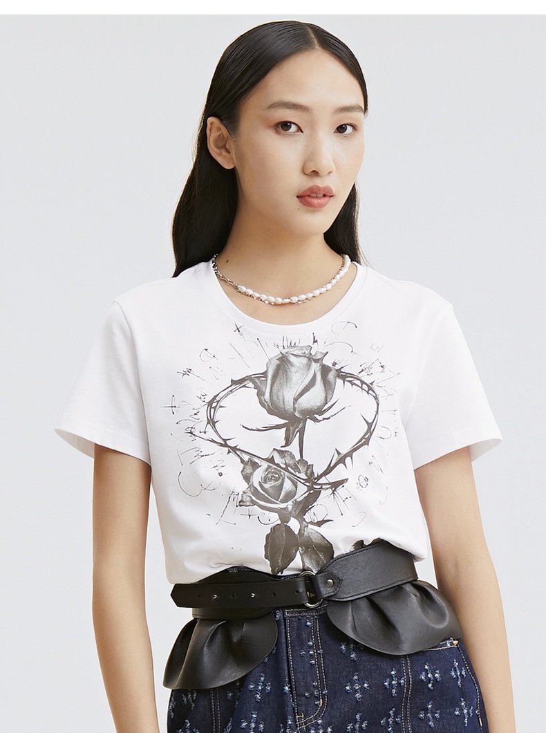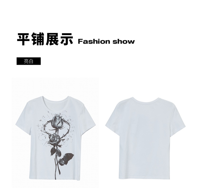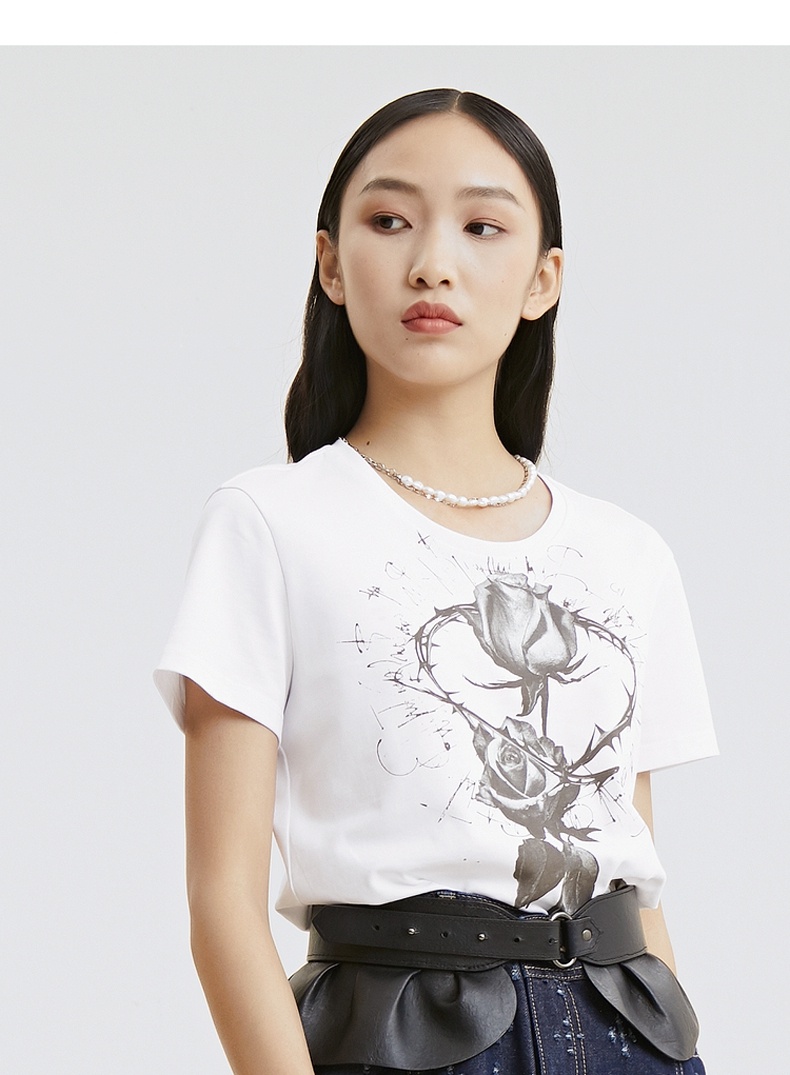 谜底2021秋季新款玫瑰花图案印花圆领短袖合体纯棉T恤女213MT1749