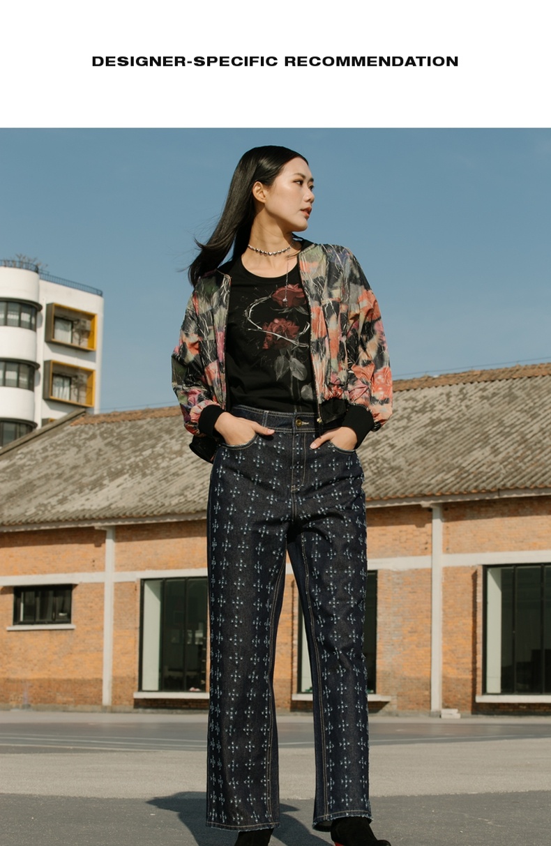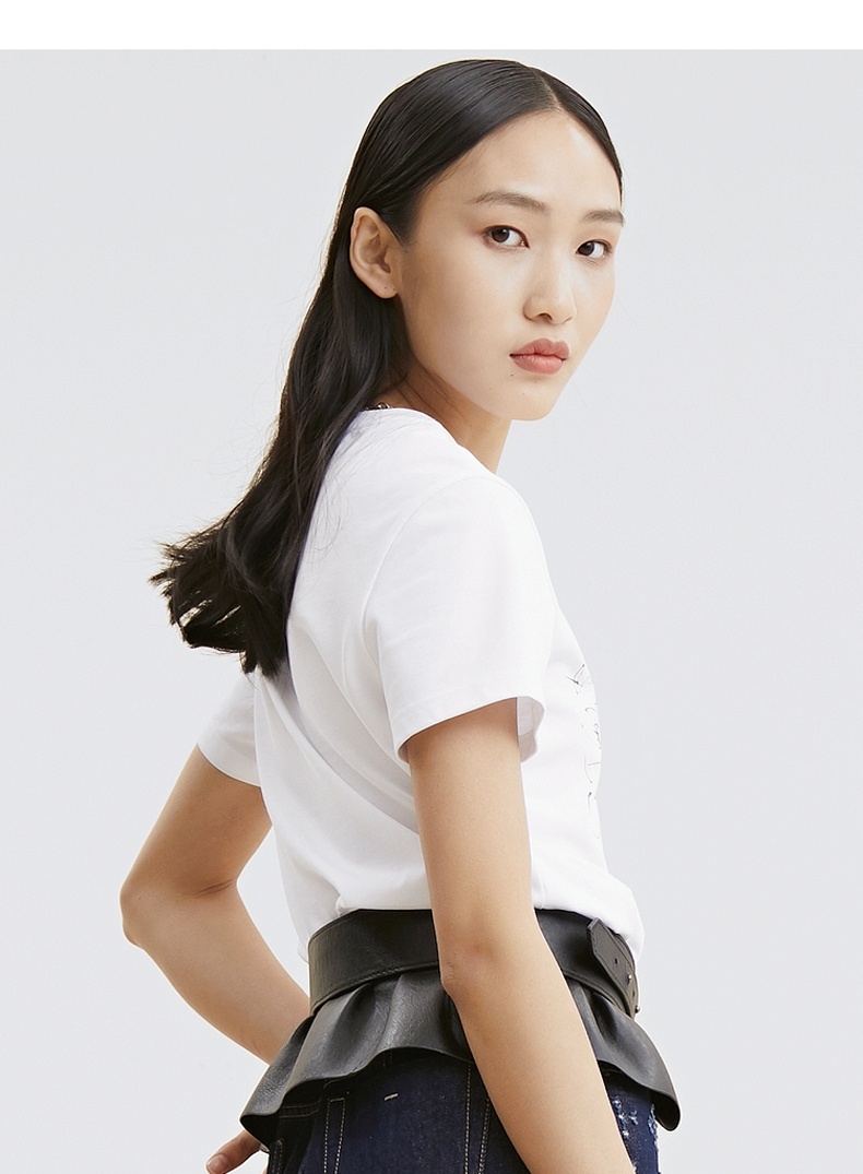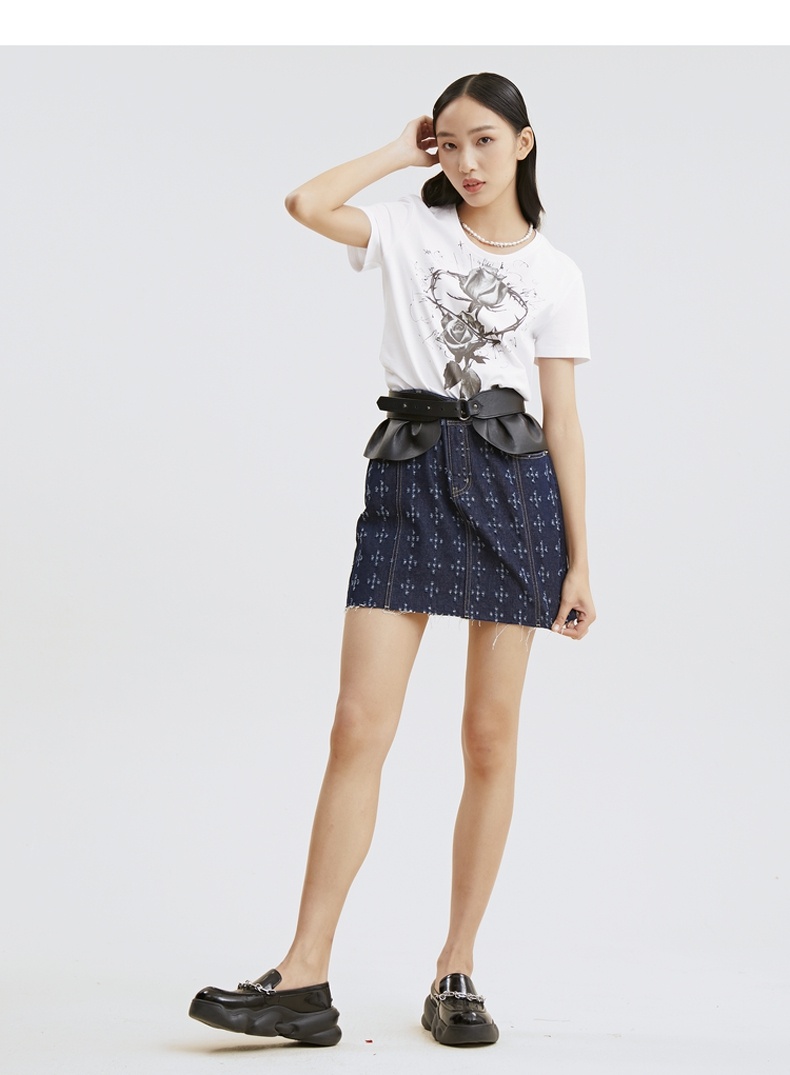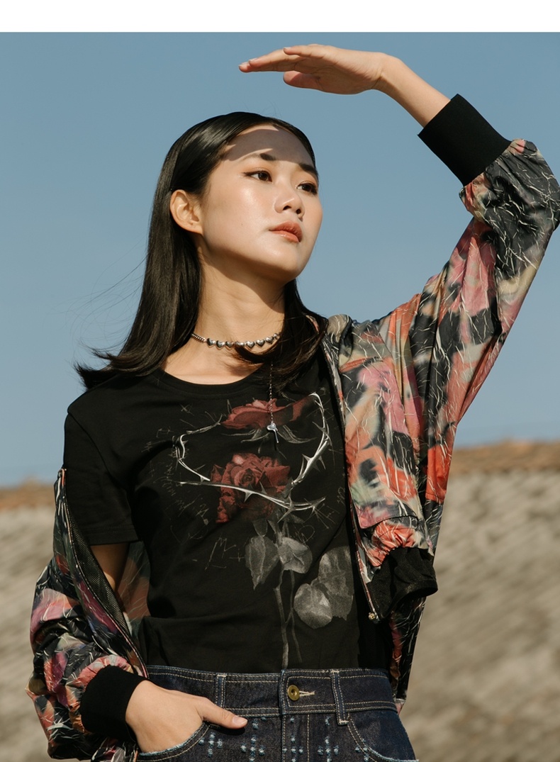 谜底2021秋季新款玫瑰花图案印花圆领短袖合体纯棉T恤女213MT1749