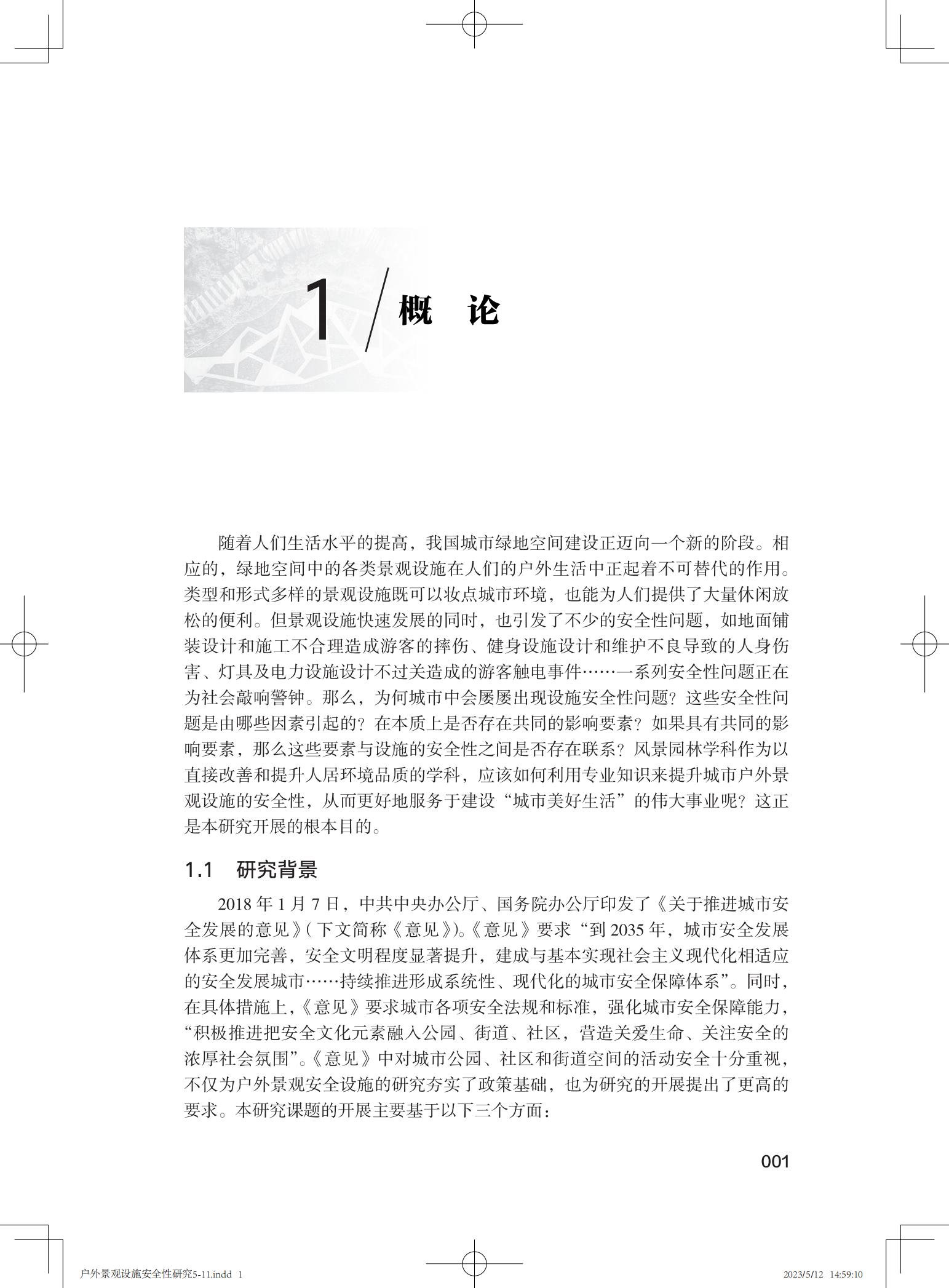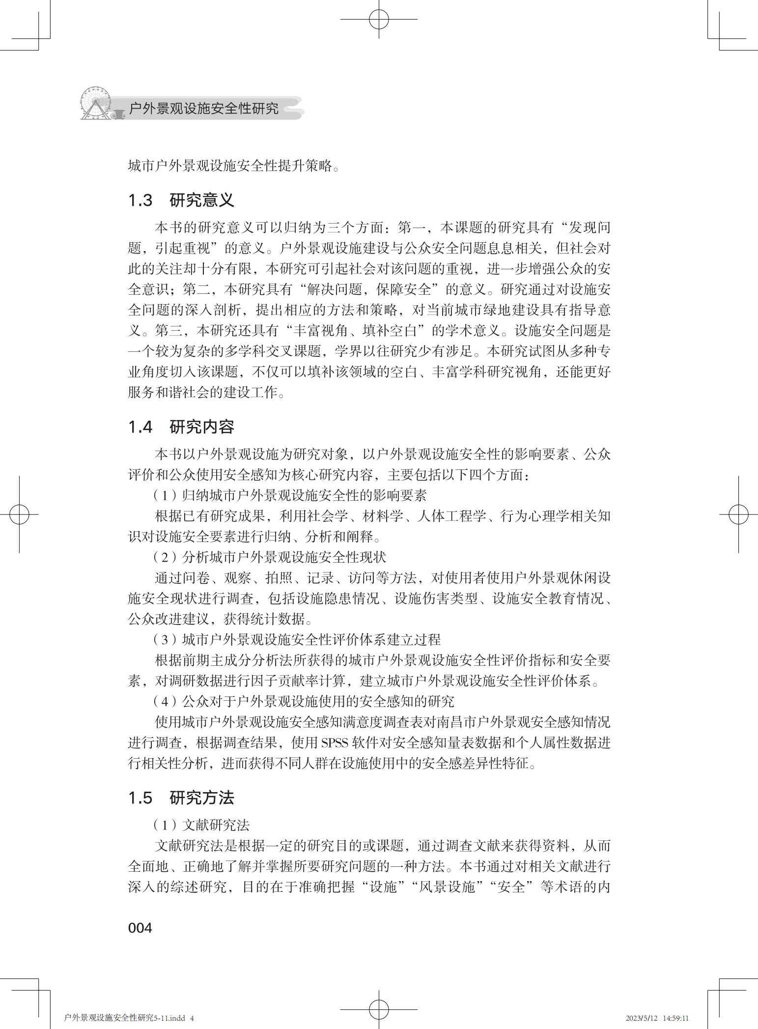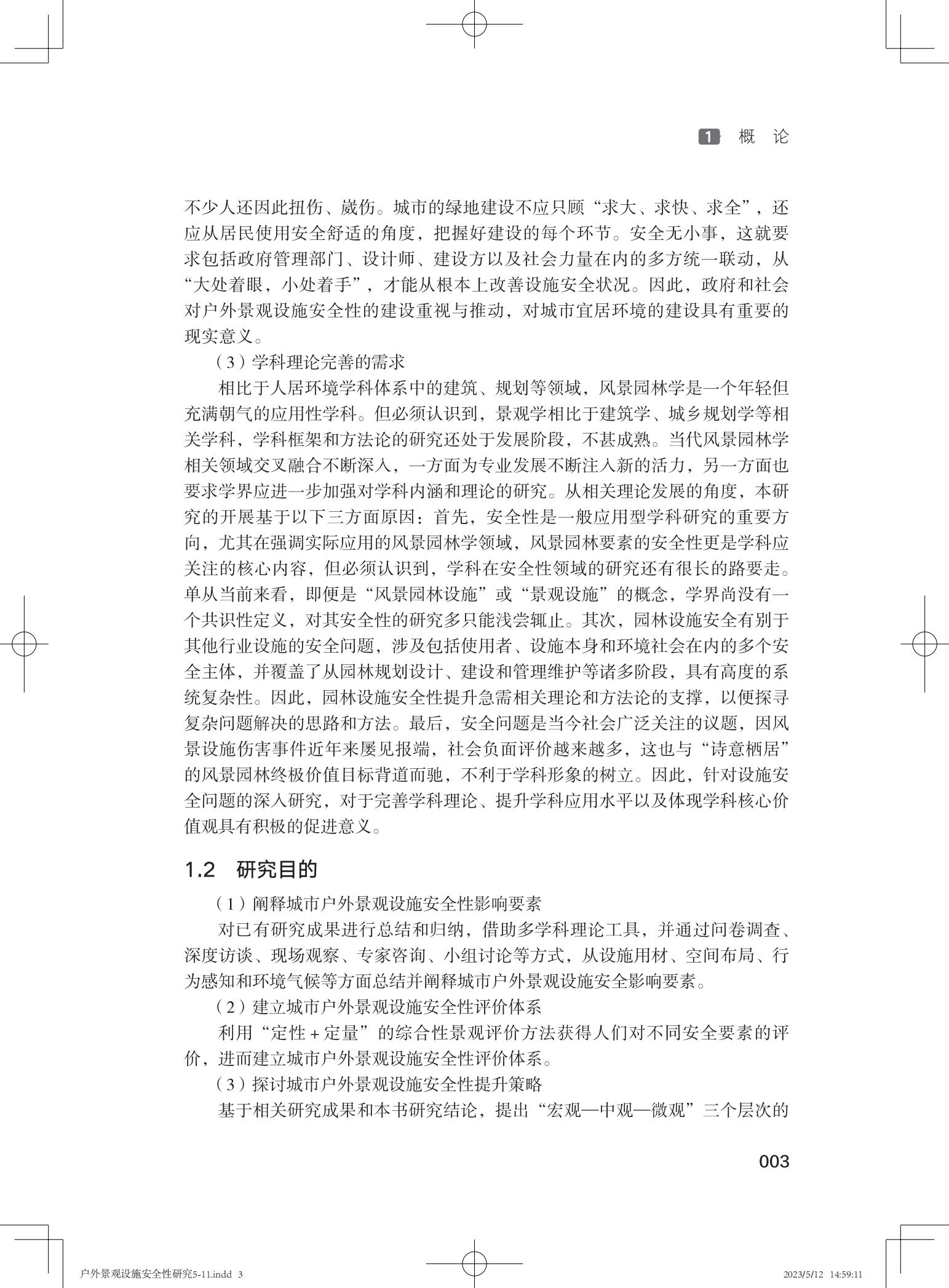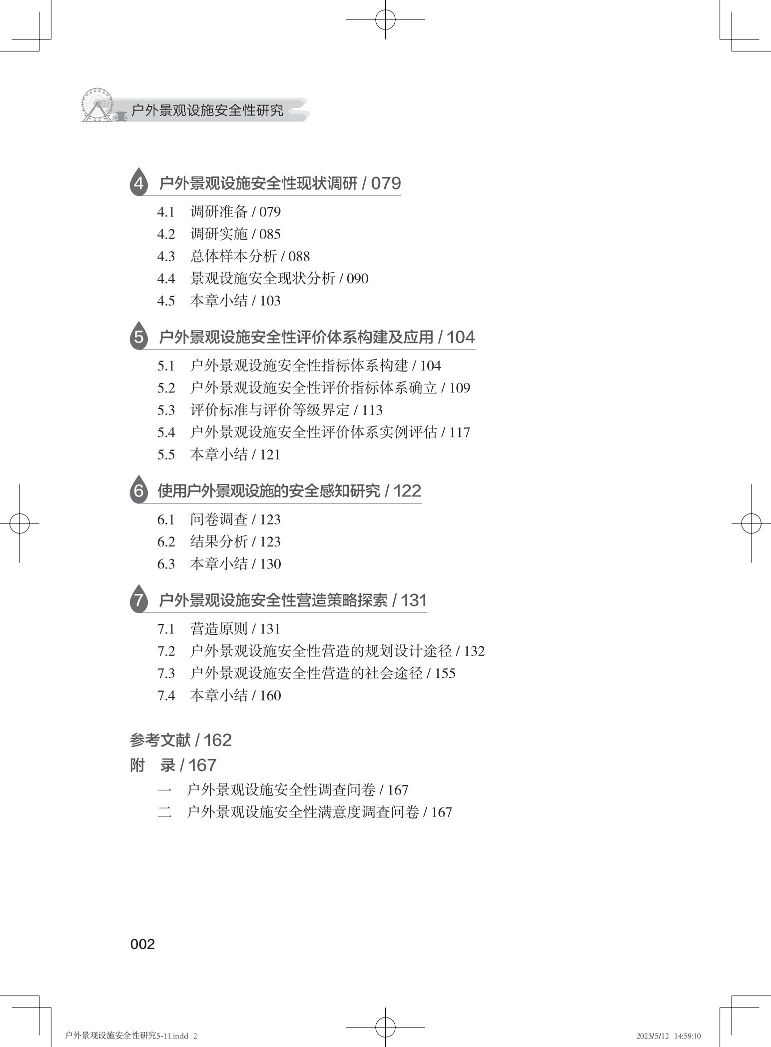 随着人们生活水平的提高,我国城市绿地空间建设正迈向一个新的阶段。绿地空间中的各类景观设施在人们的户外生活中正起着越来越不可替代的作用。类型和形式多样的景观设施既可以妆点城市环境,也能为人们提供了大量放松休闲的便利。但景观设施快速发展的同时,也引发了不少的安全性问题。本书通过对景观设施安全性内涵的剖析和发展演变历史的梳理,结合社会调查,归纳出影响景观设施安全的要素,构建出户外景观设施安全性评价体系,以此提出了户外景观设施安全建设策略。