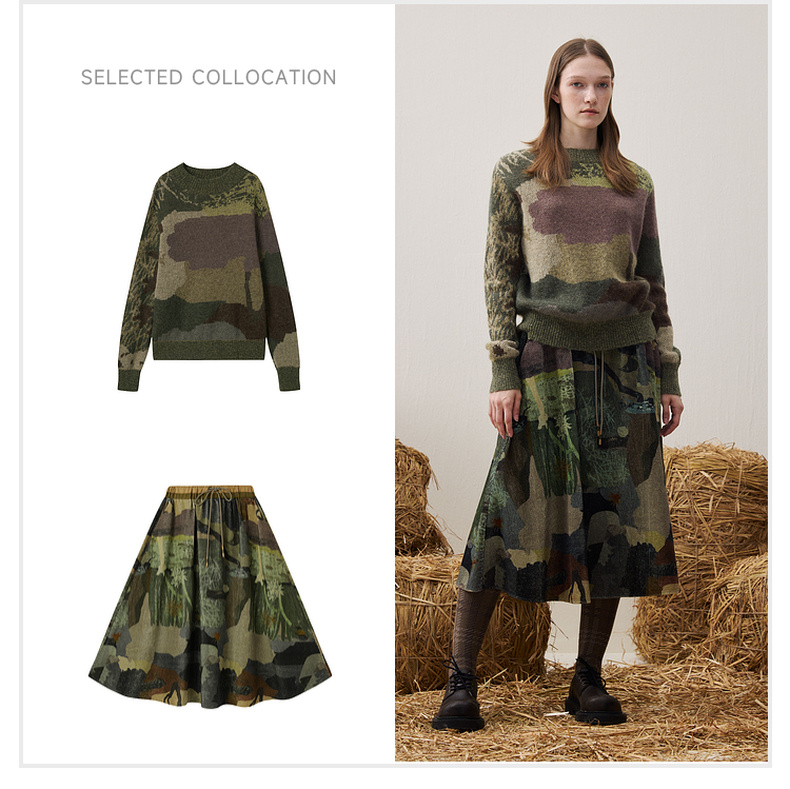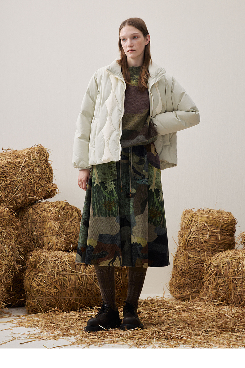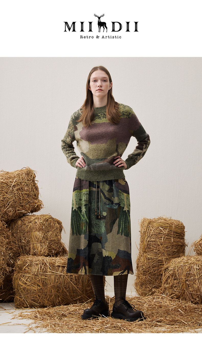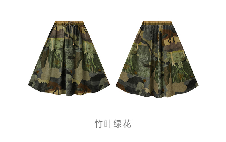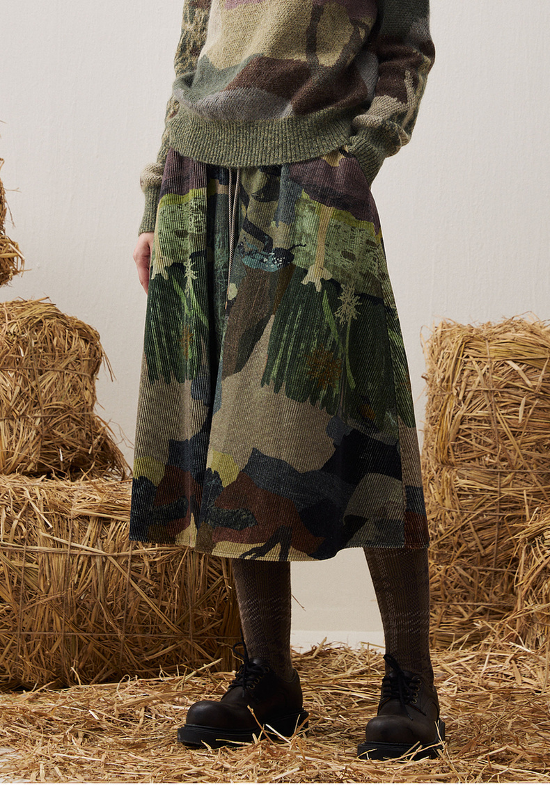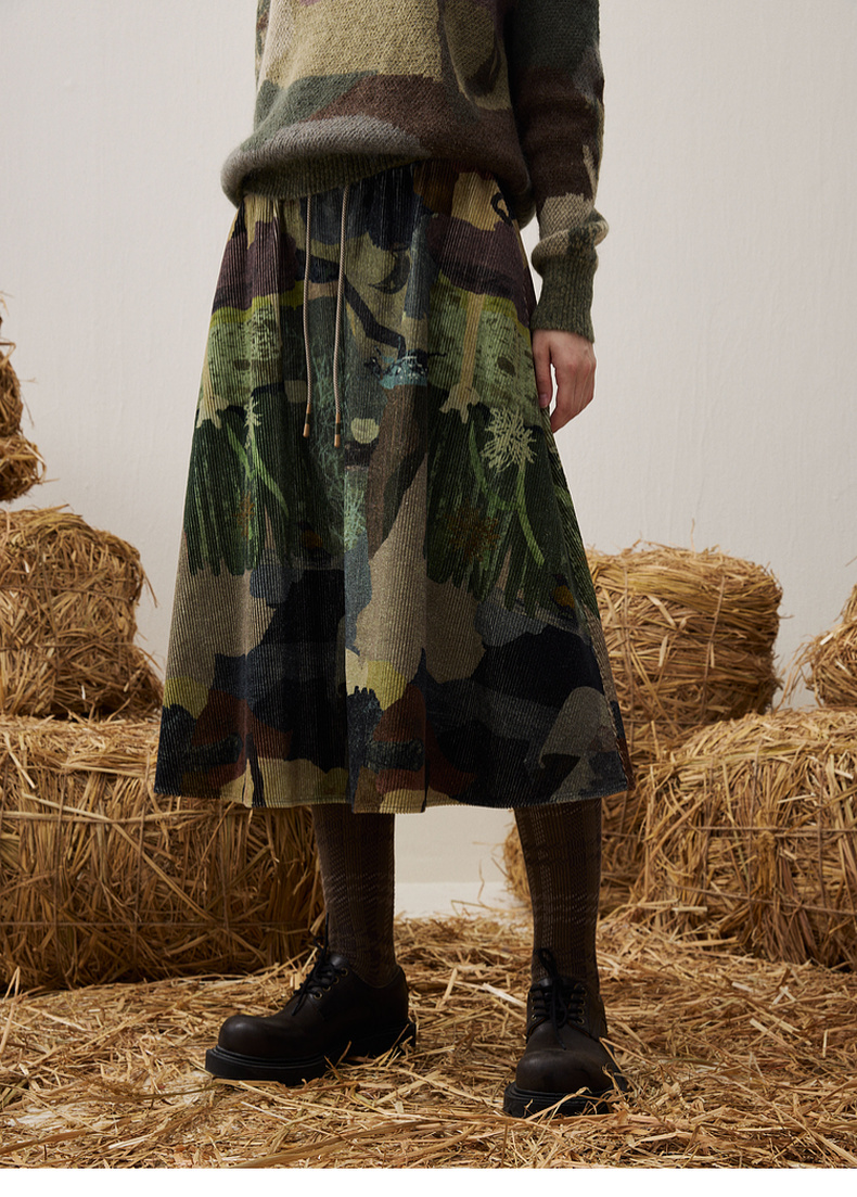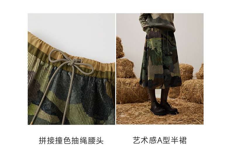 谜底印花半裙2025冬新品复古拼接撞色抽绳腰头中长裙女254MB1675