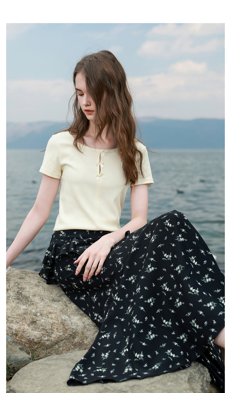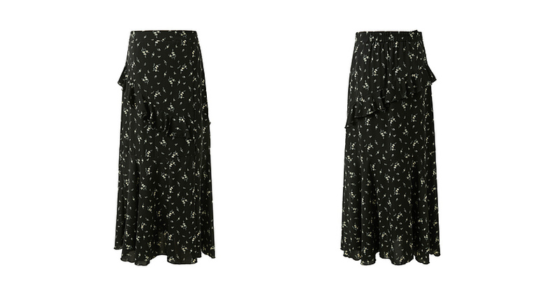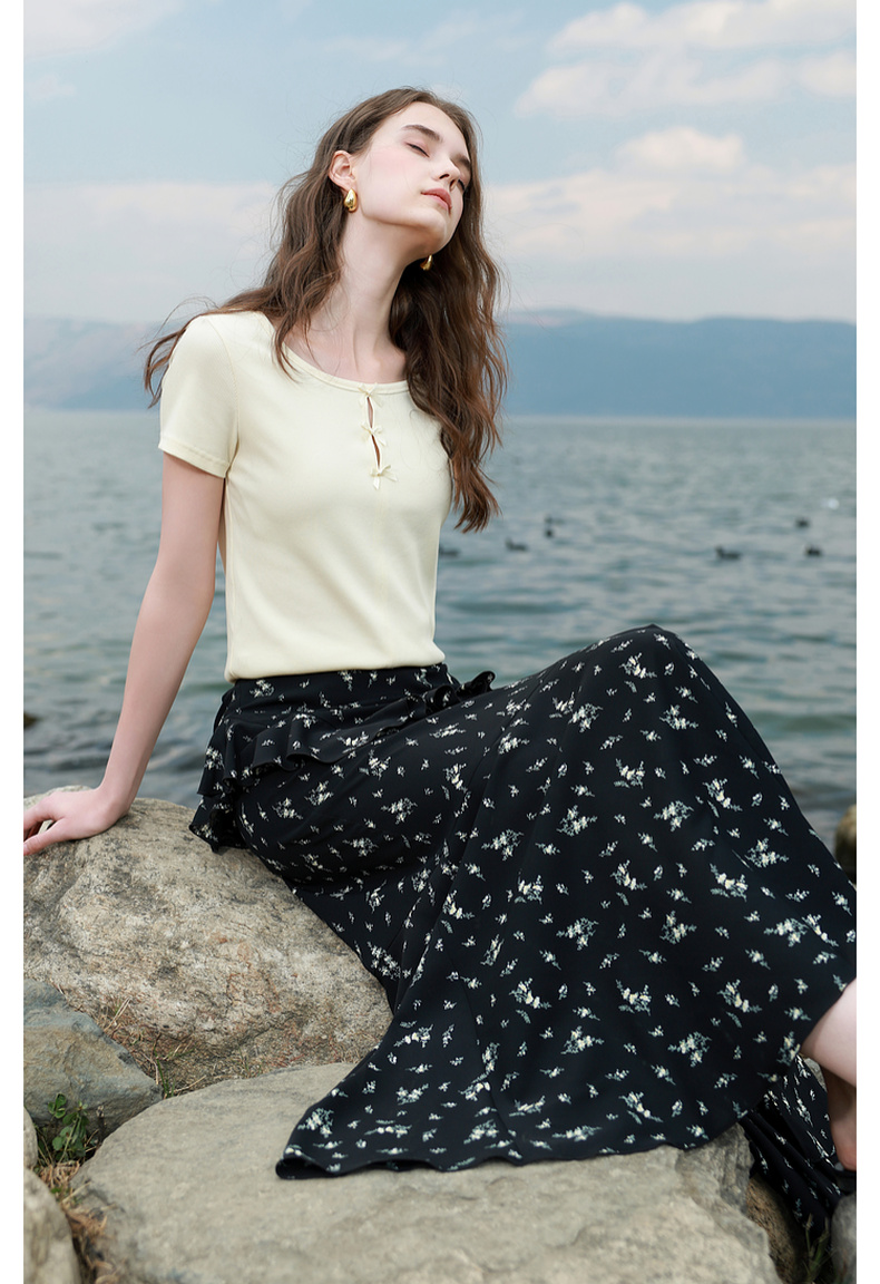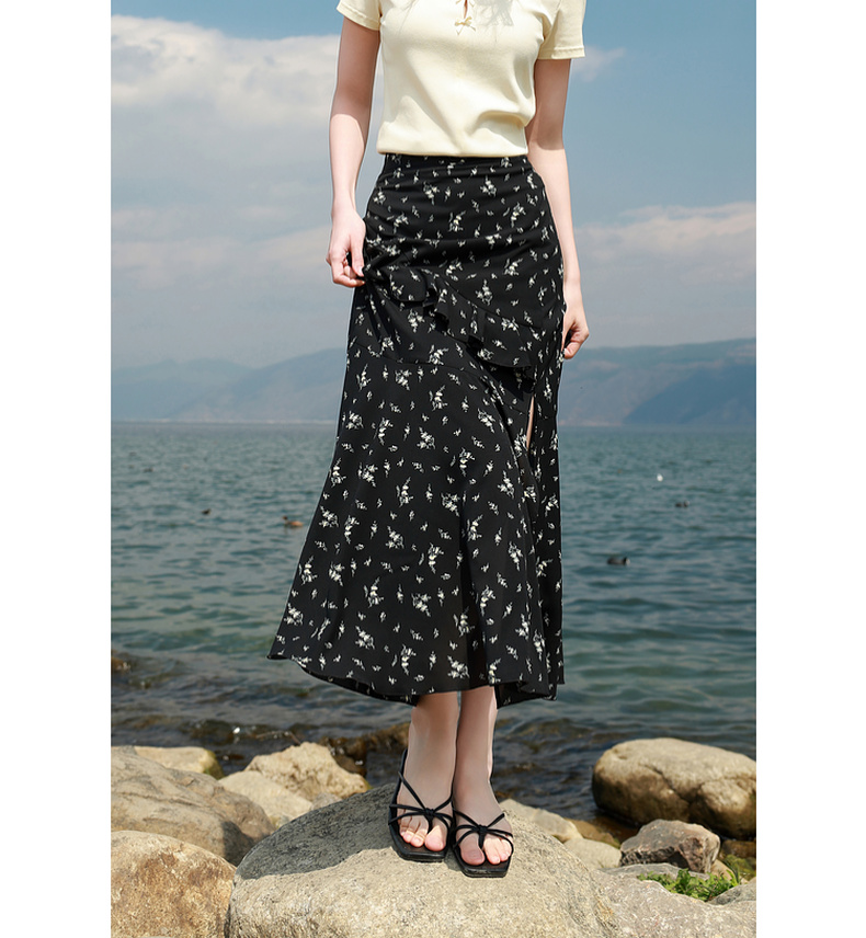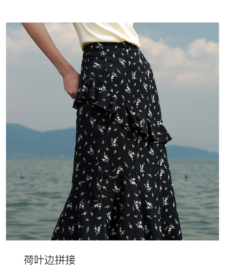 三彩2025夏季新款碎花半身裙荷叶边开叉鱼尾裙浪漫长裙M