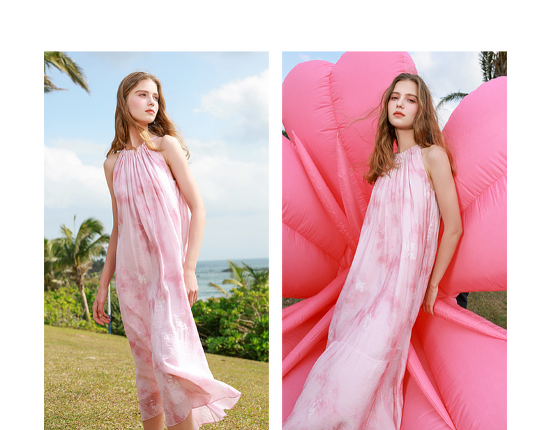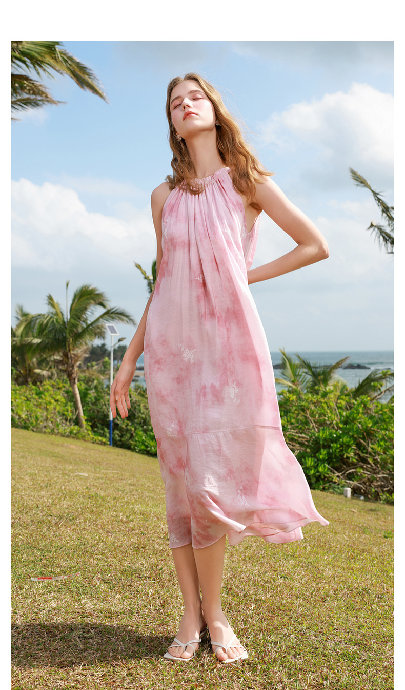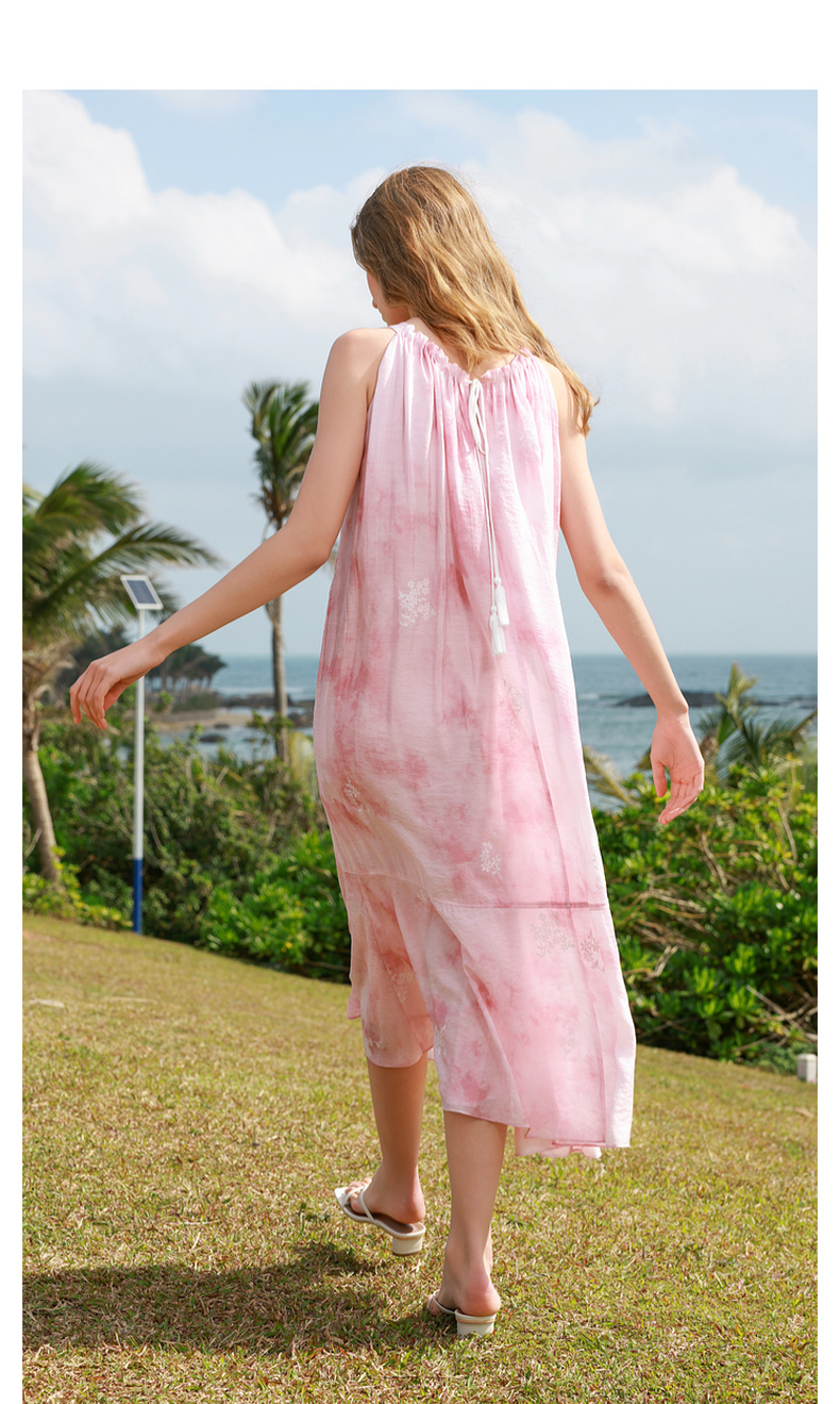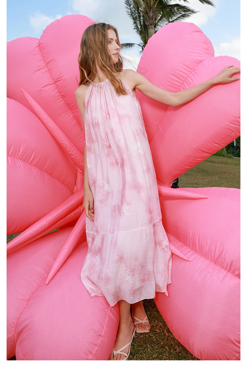 【小樱花】三彩2025春季新款挂脖连衣裙樱花无袖长裙宽松浪漫度假M