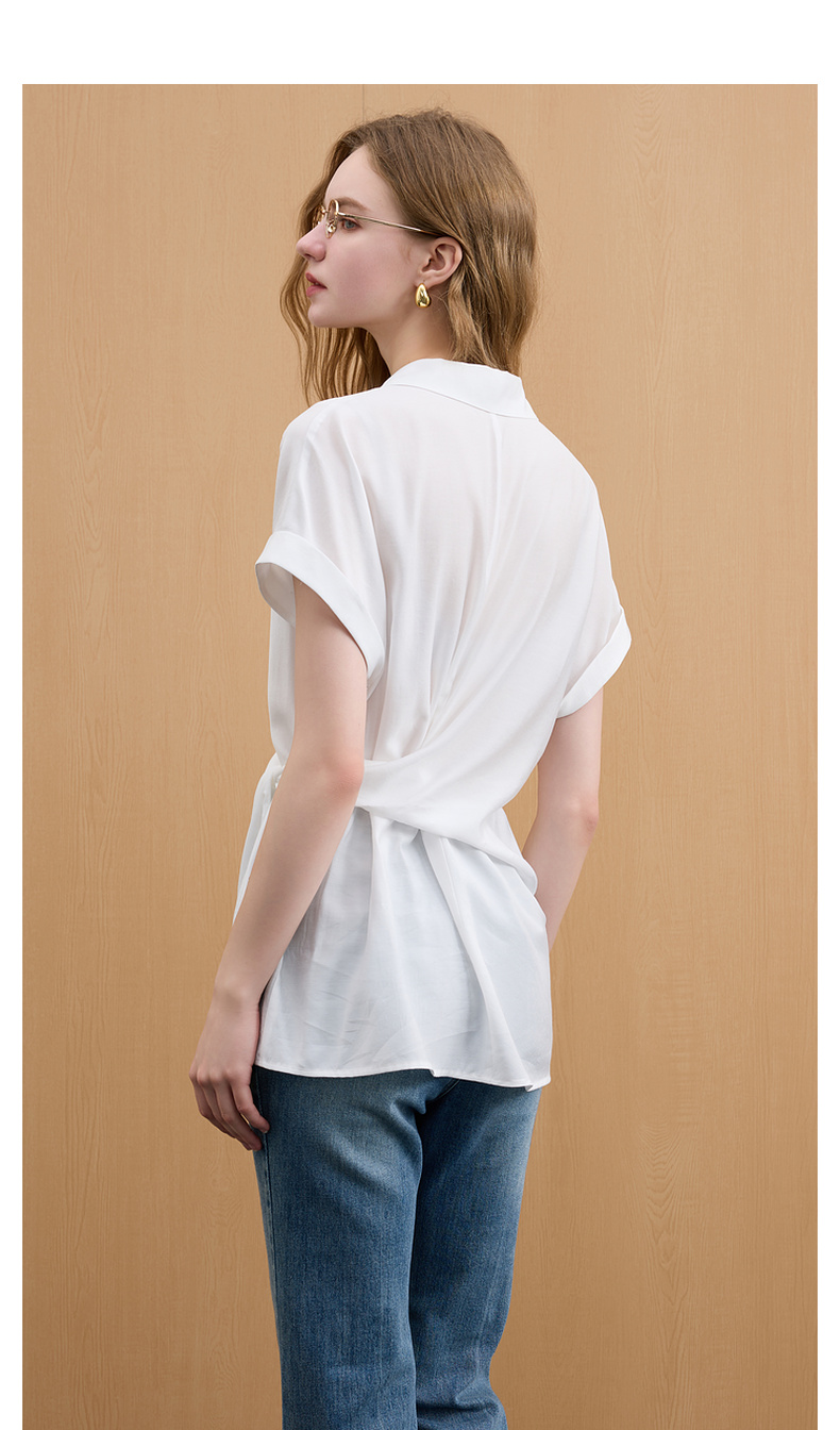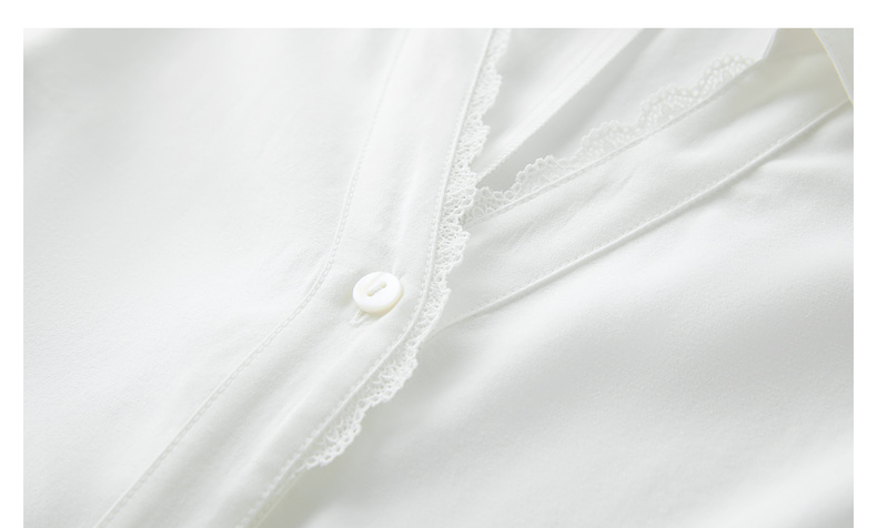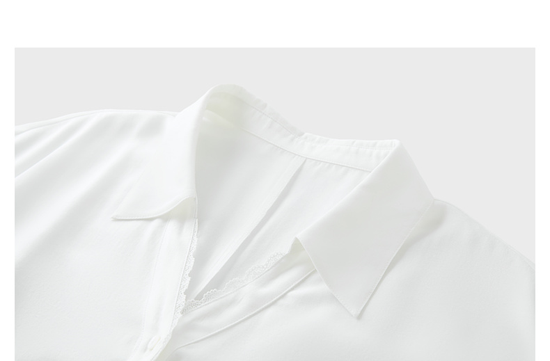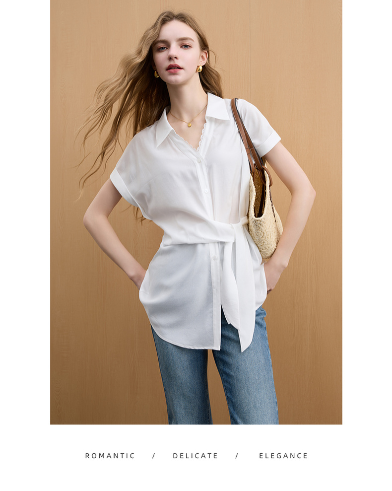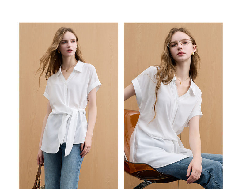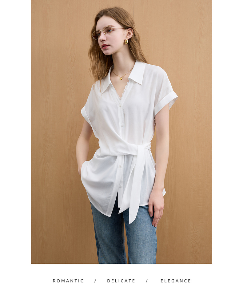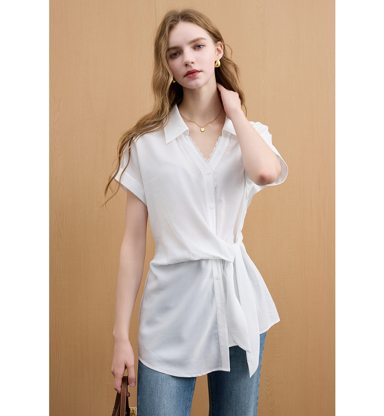 三彩2025夏季新款花边V翻领衬衫短袖上衣宽松设计感气质M