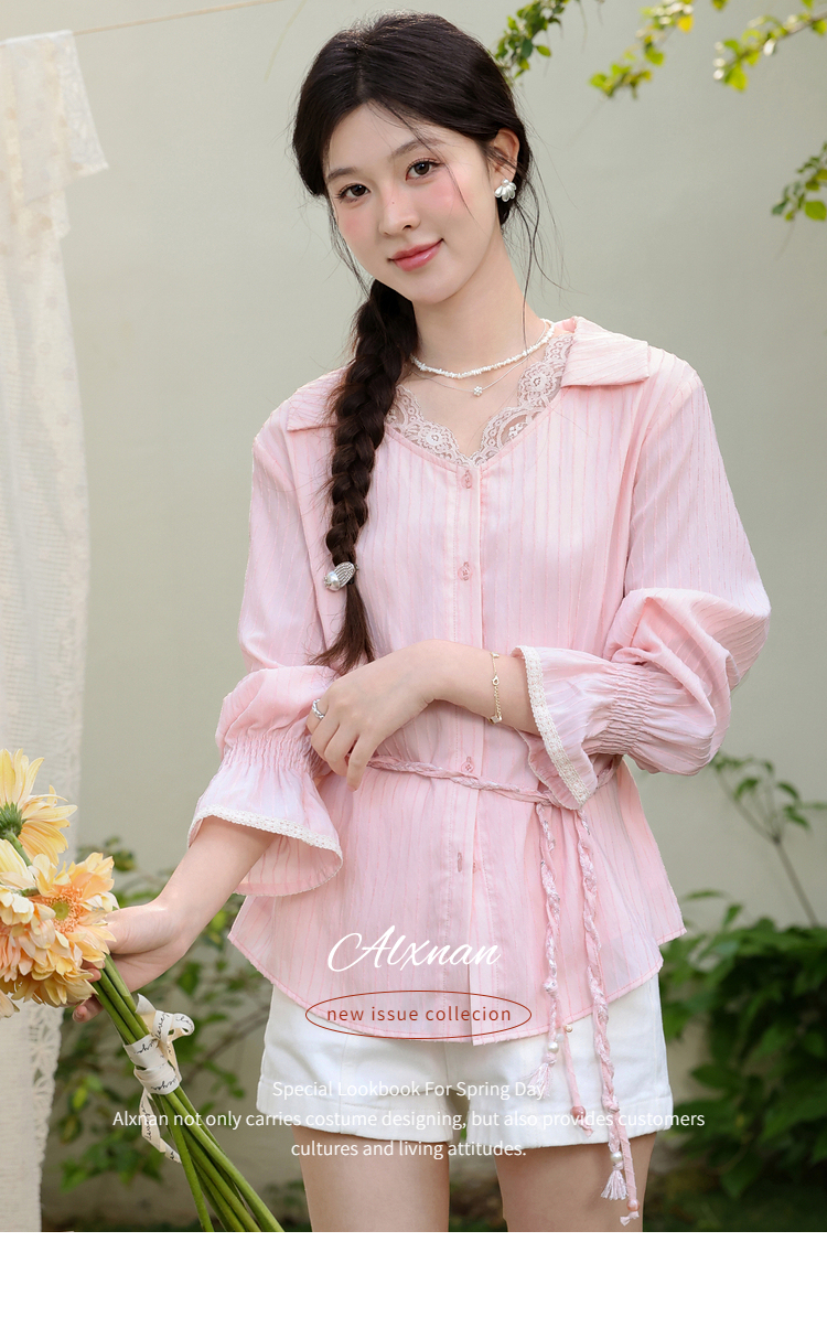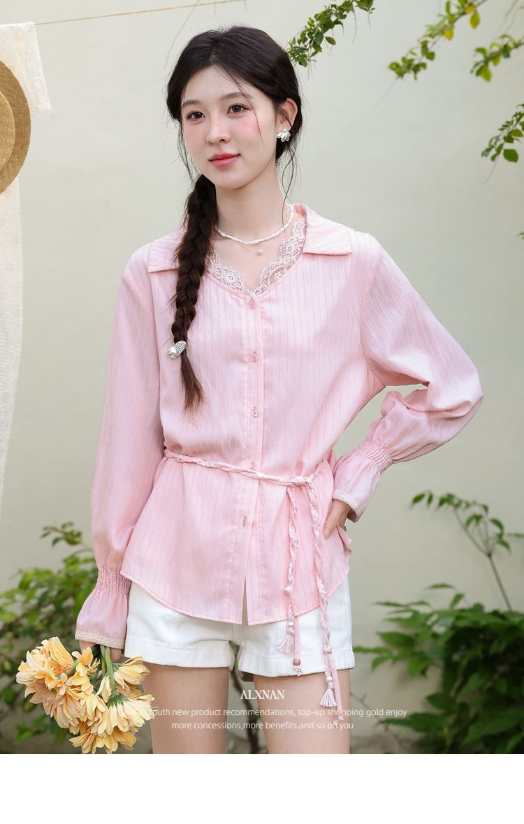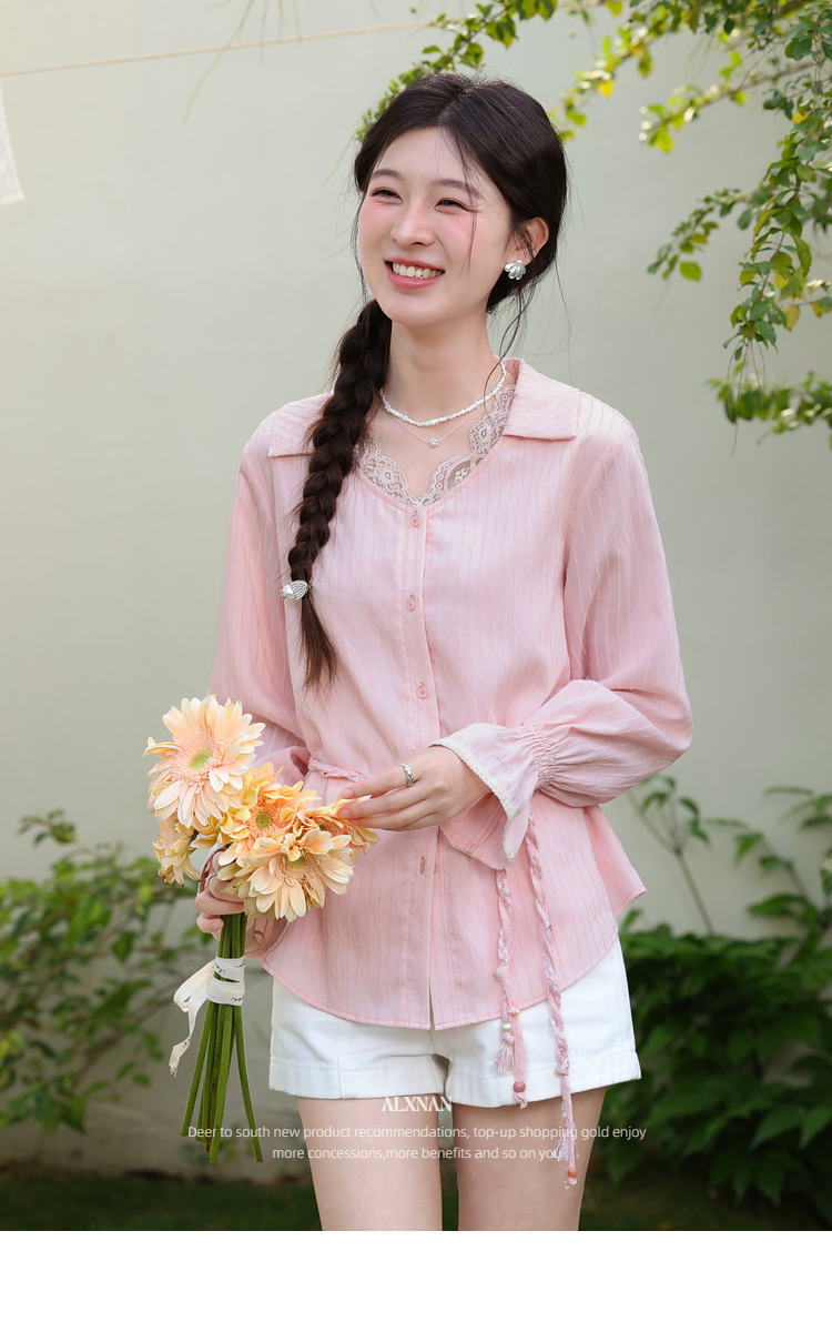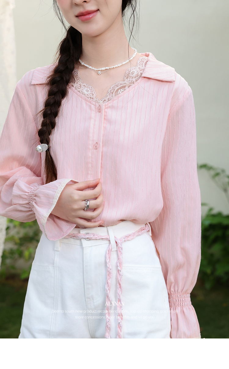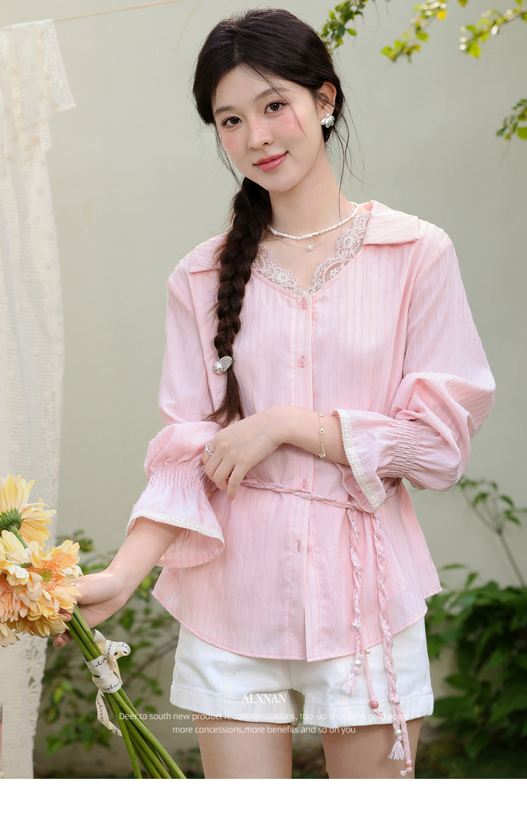 鹿向南「云赏轻语」粉色条纹蕾丝衬衫女春季洋气收腰长袖小衫上衣