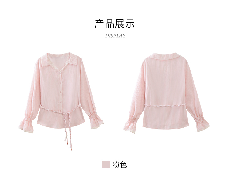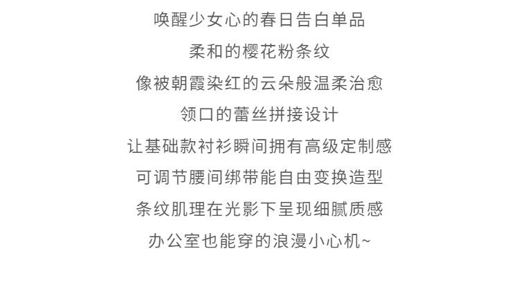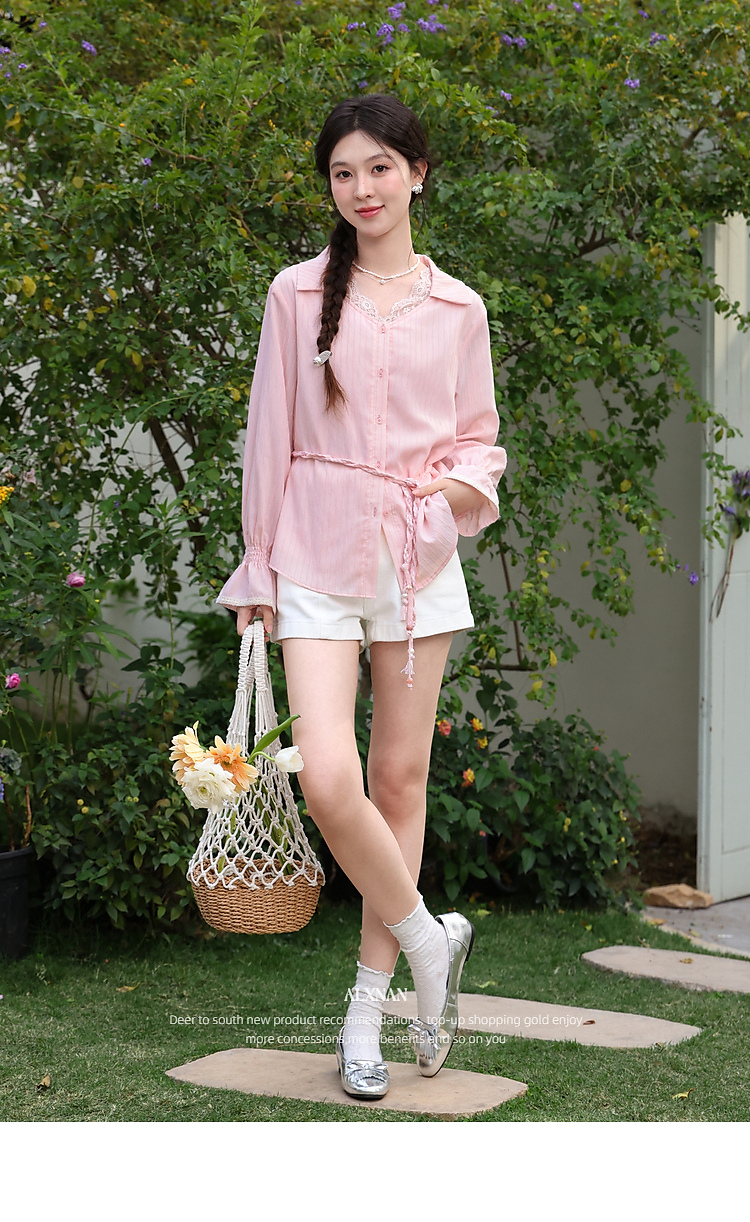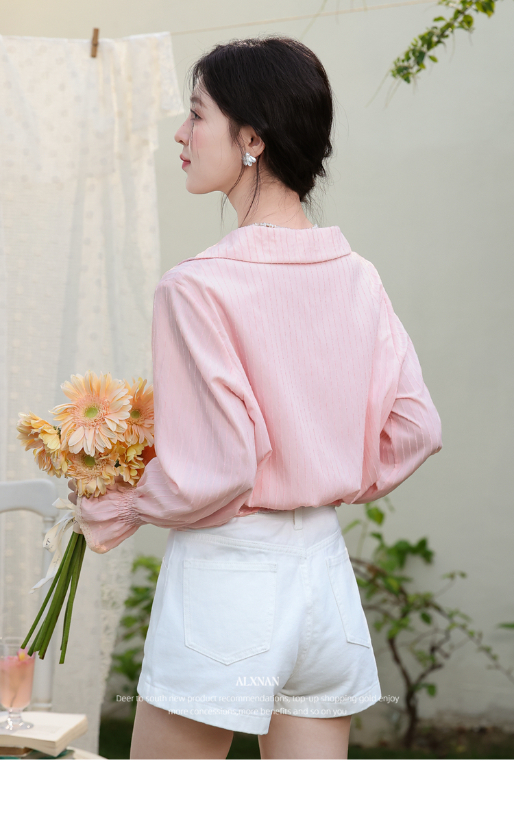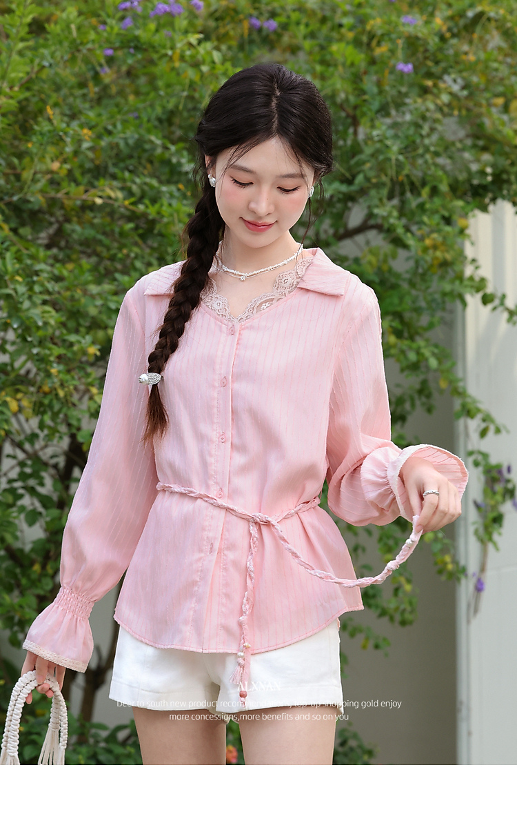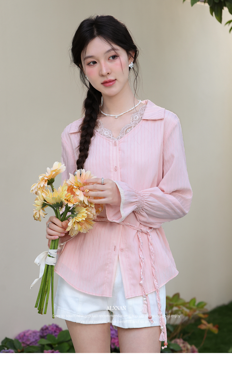 鹿向南「云赏轻语」粉色条纹蕾丝衬衫女春季洋气收腰长袖小衫上衣