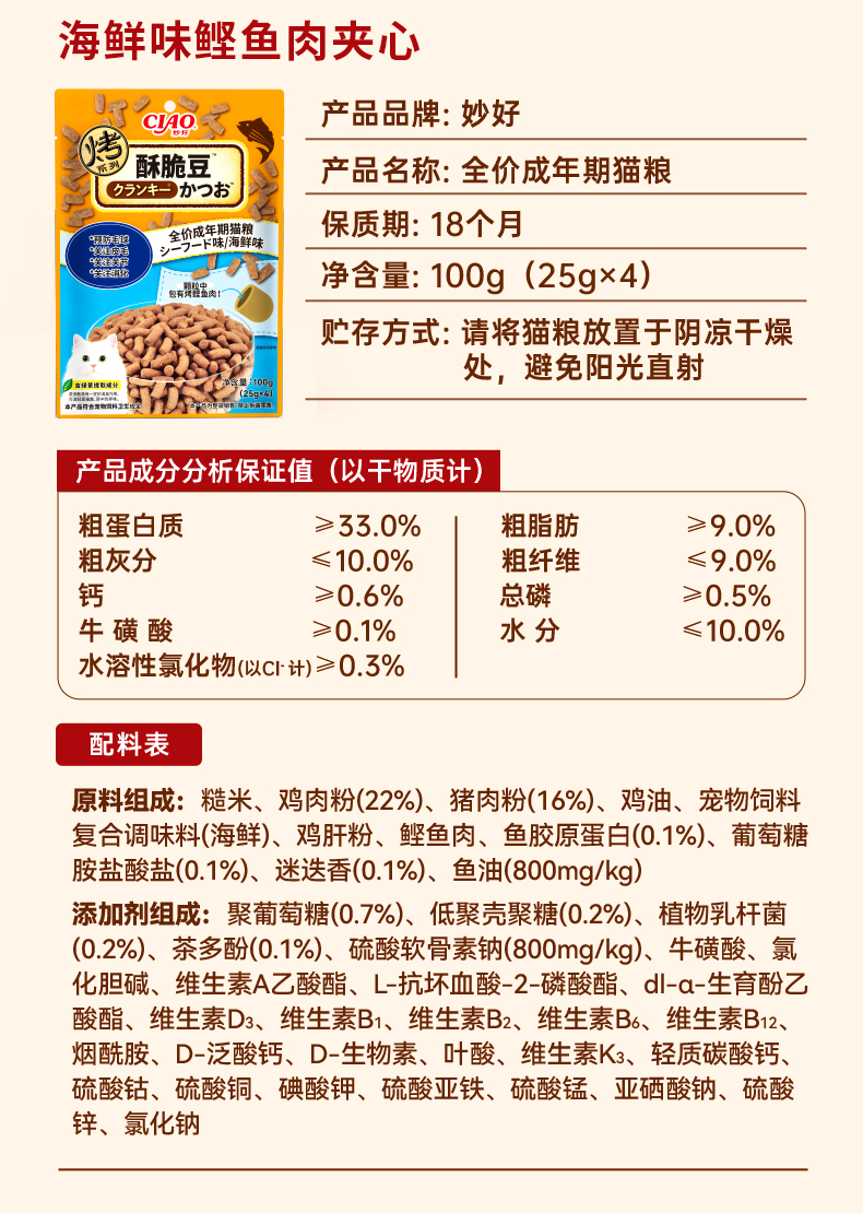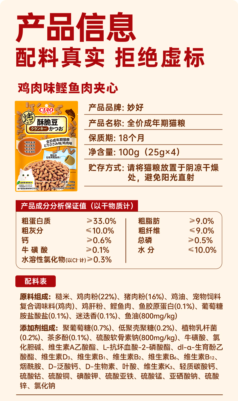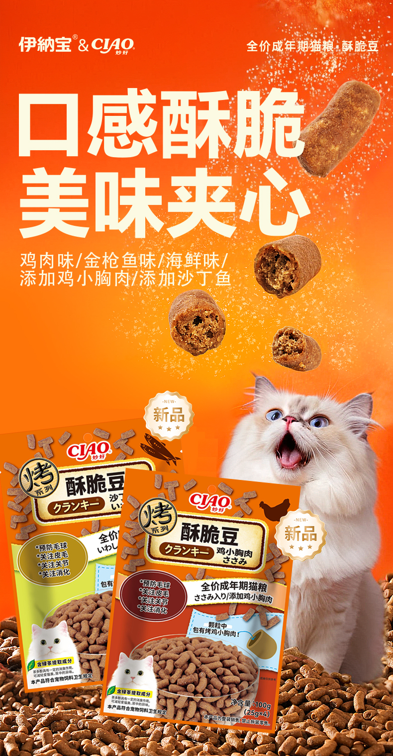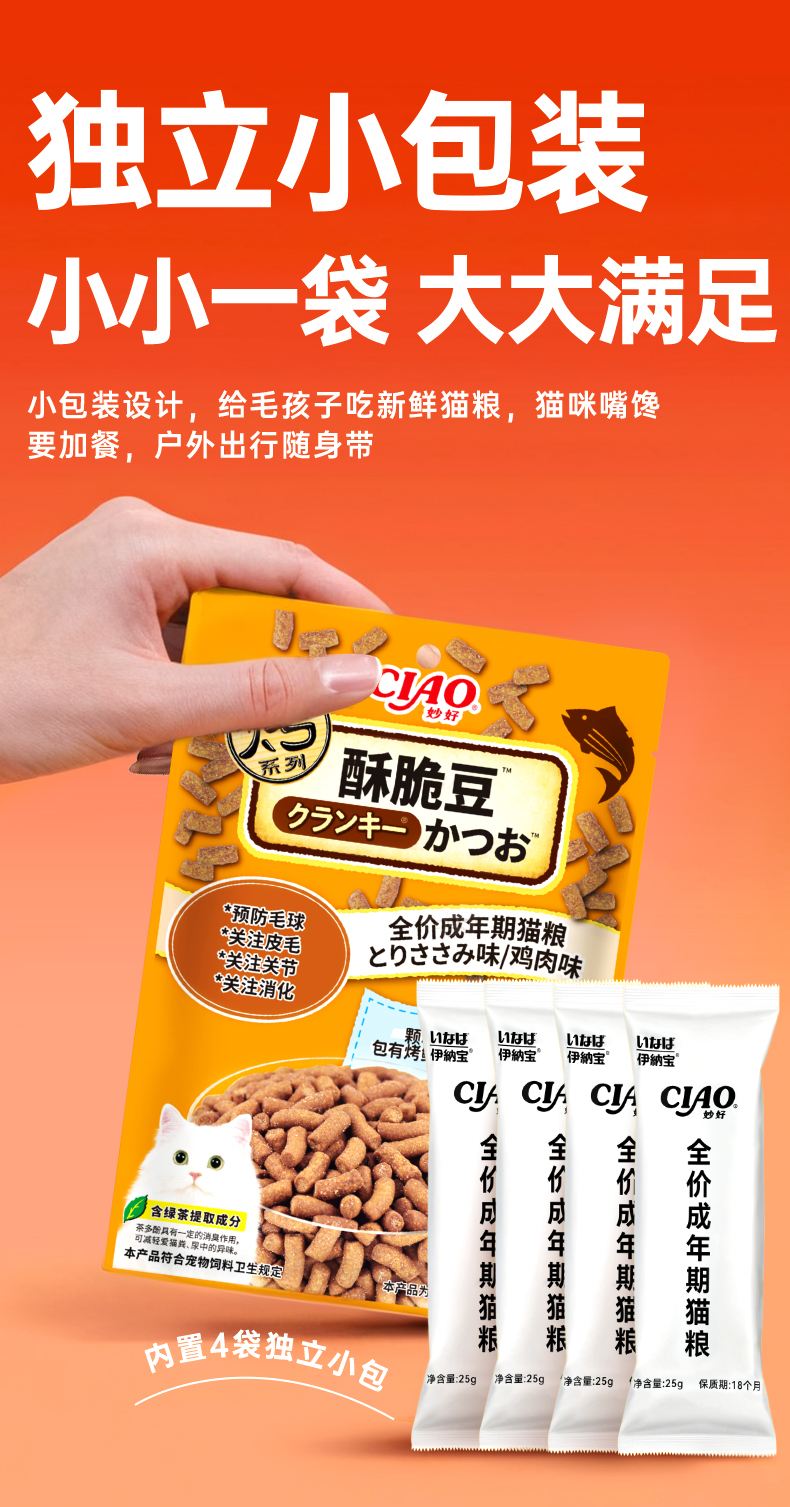 伊纳宝猫干粮全价猫粮鸡肉鱼肉宠物猫粮酥脆豆夹心通用【预防毛球】鸡肉味/金枪鱼味25g*4*48包/箱