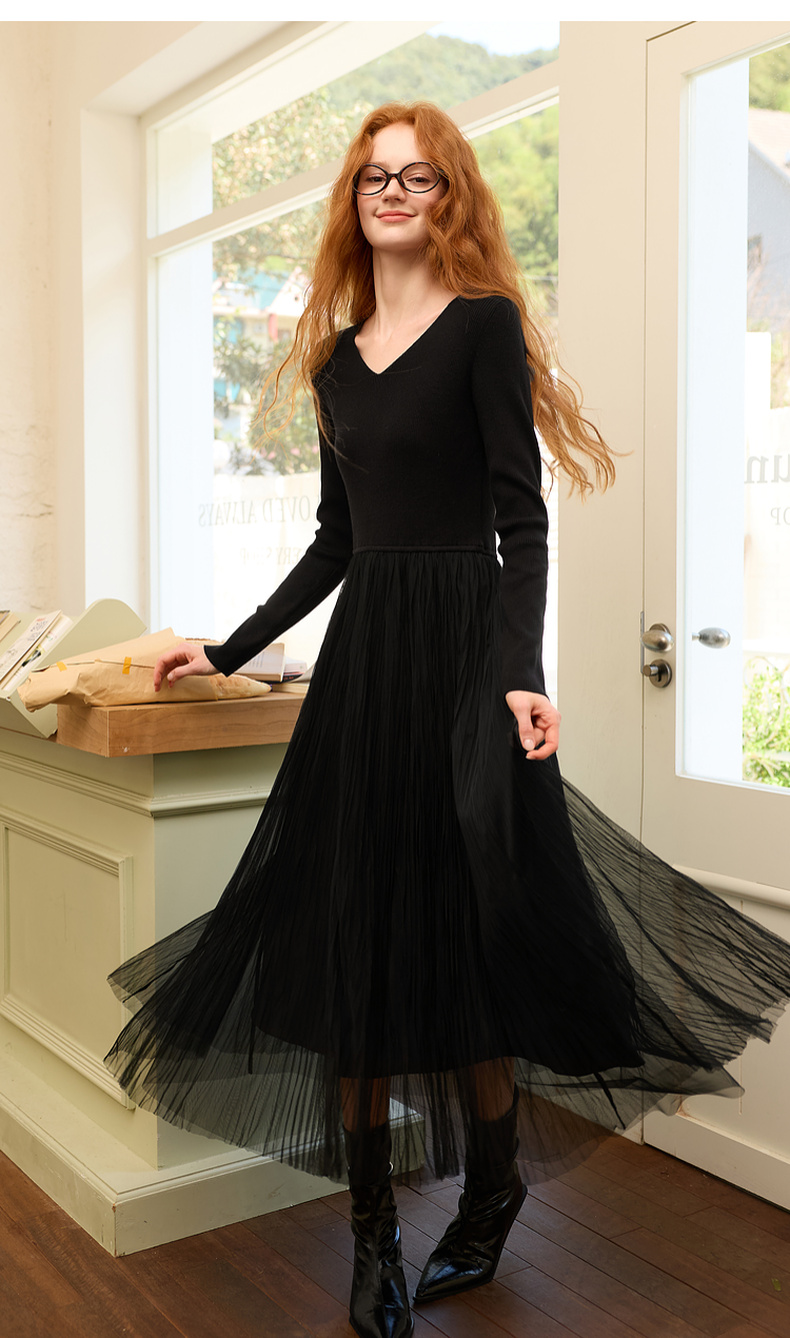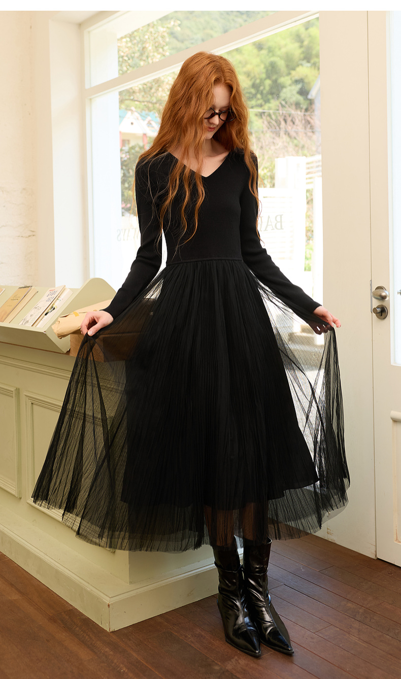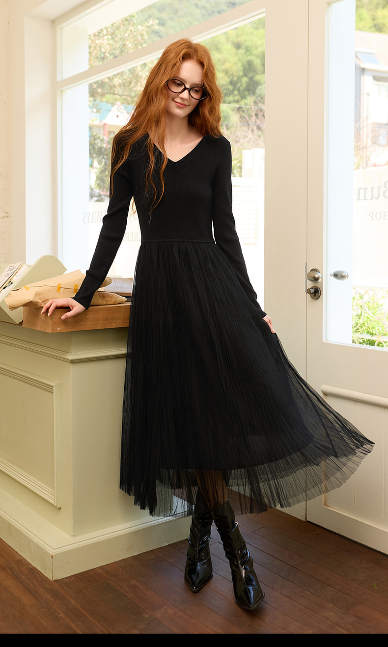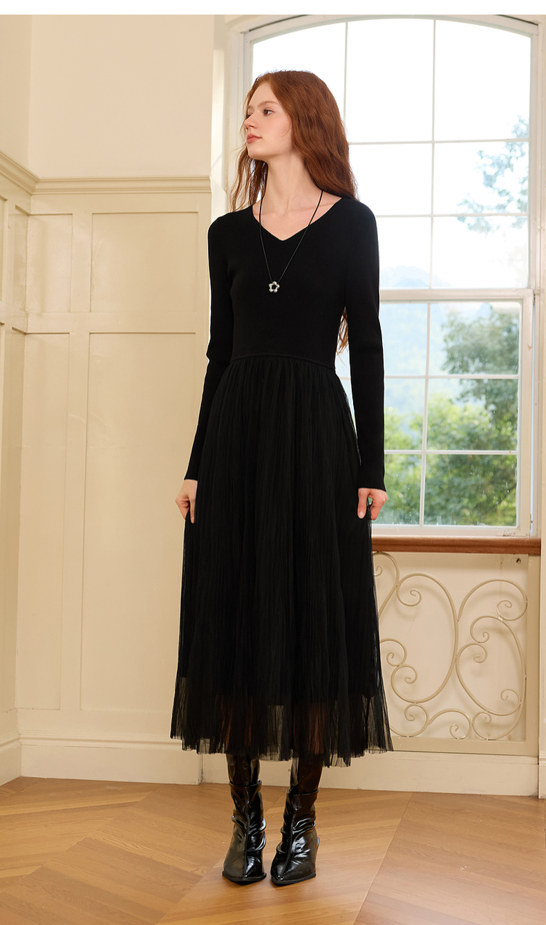三彩2025冬季新款针织裙拼接网纱大摆连衣裙收腰长裙V领长袖M