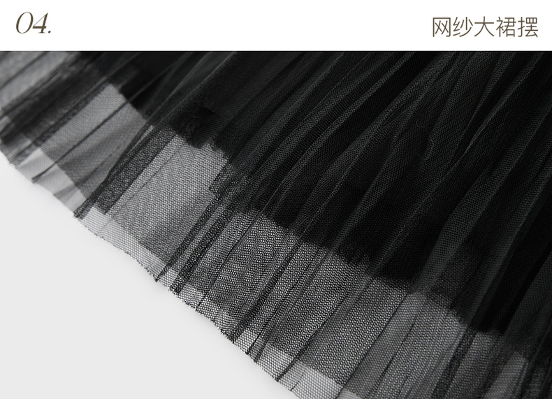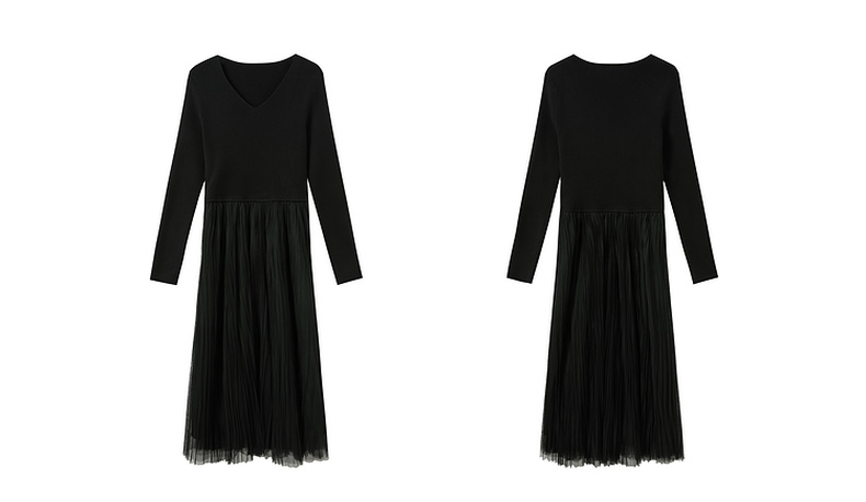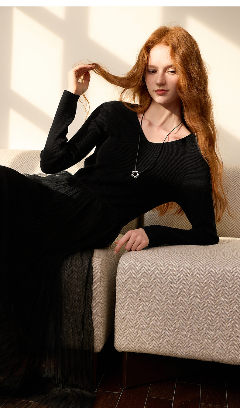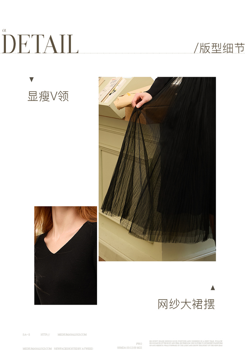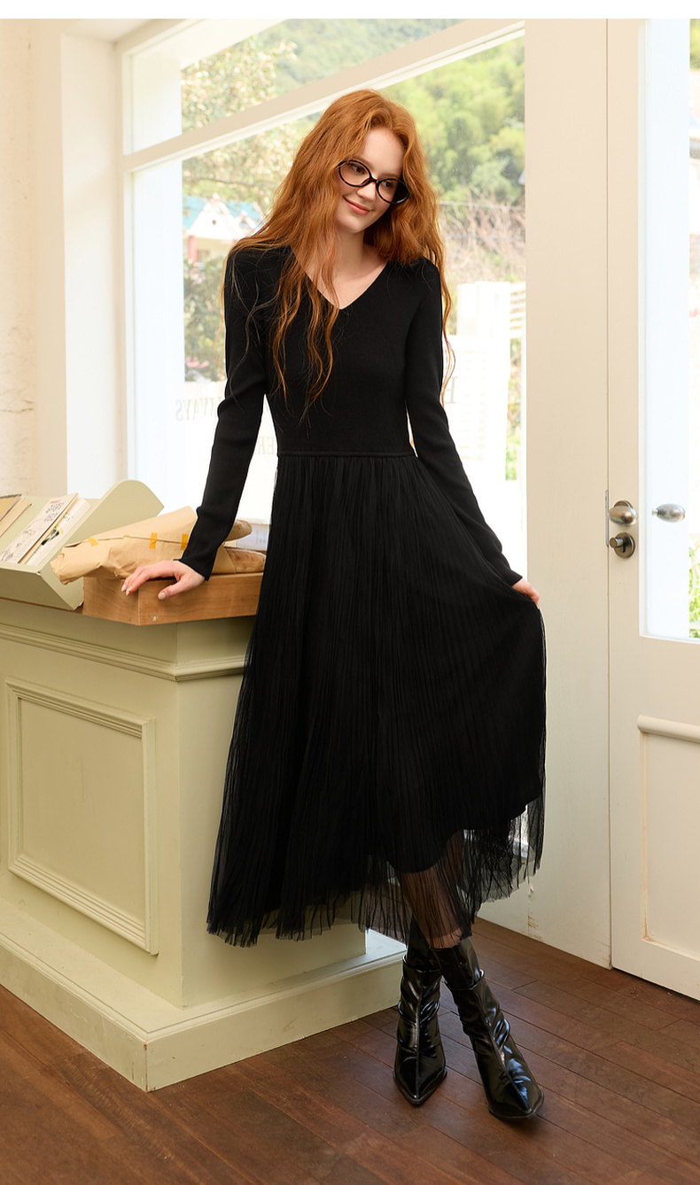 三彩2025冬季新款针织裙拼接网纱大摆连衣裙收腰长裙V领长袖M