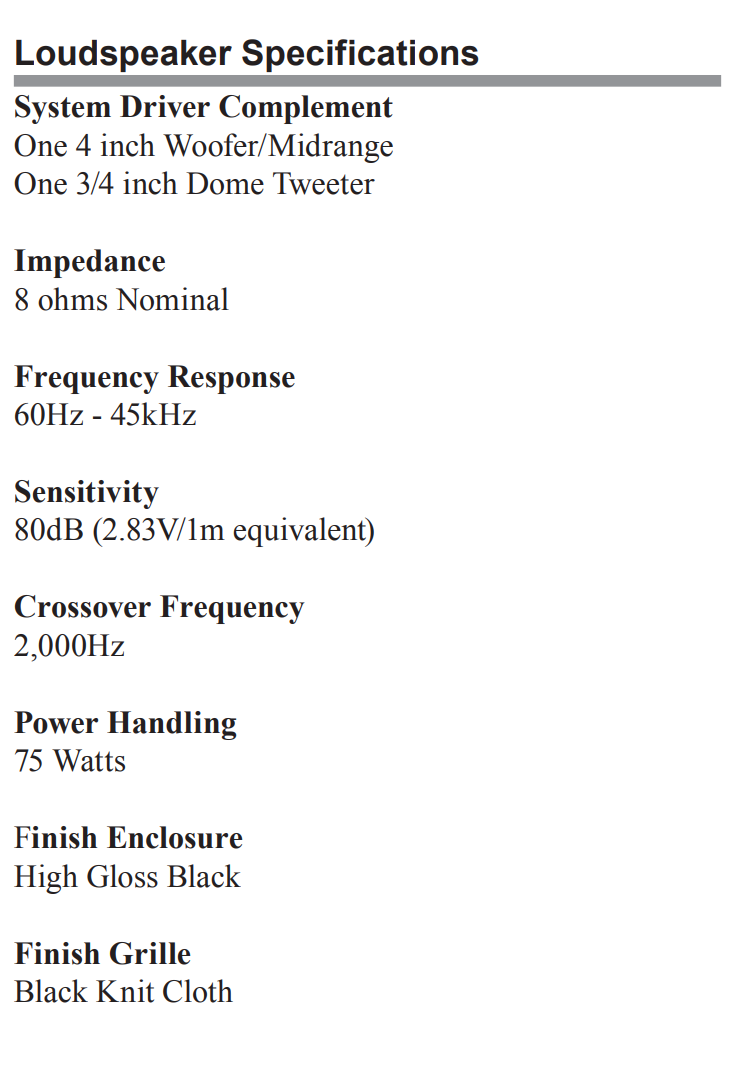 为了实现高水平的性能,这款扬声器配备了紧凑的铸铝箱体旨在抑制共振,采用奢华的高光泽钢琴黑装饰。定制设计的直径为 4 英寸的中低音喇叭,拥有低至 45hz 的响应,一个 3/4" 钛金属圆顶高音喇叭,并展现出深沉、宽阔的声场,为听众呈现引人入胜、触手可及的真实感。
