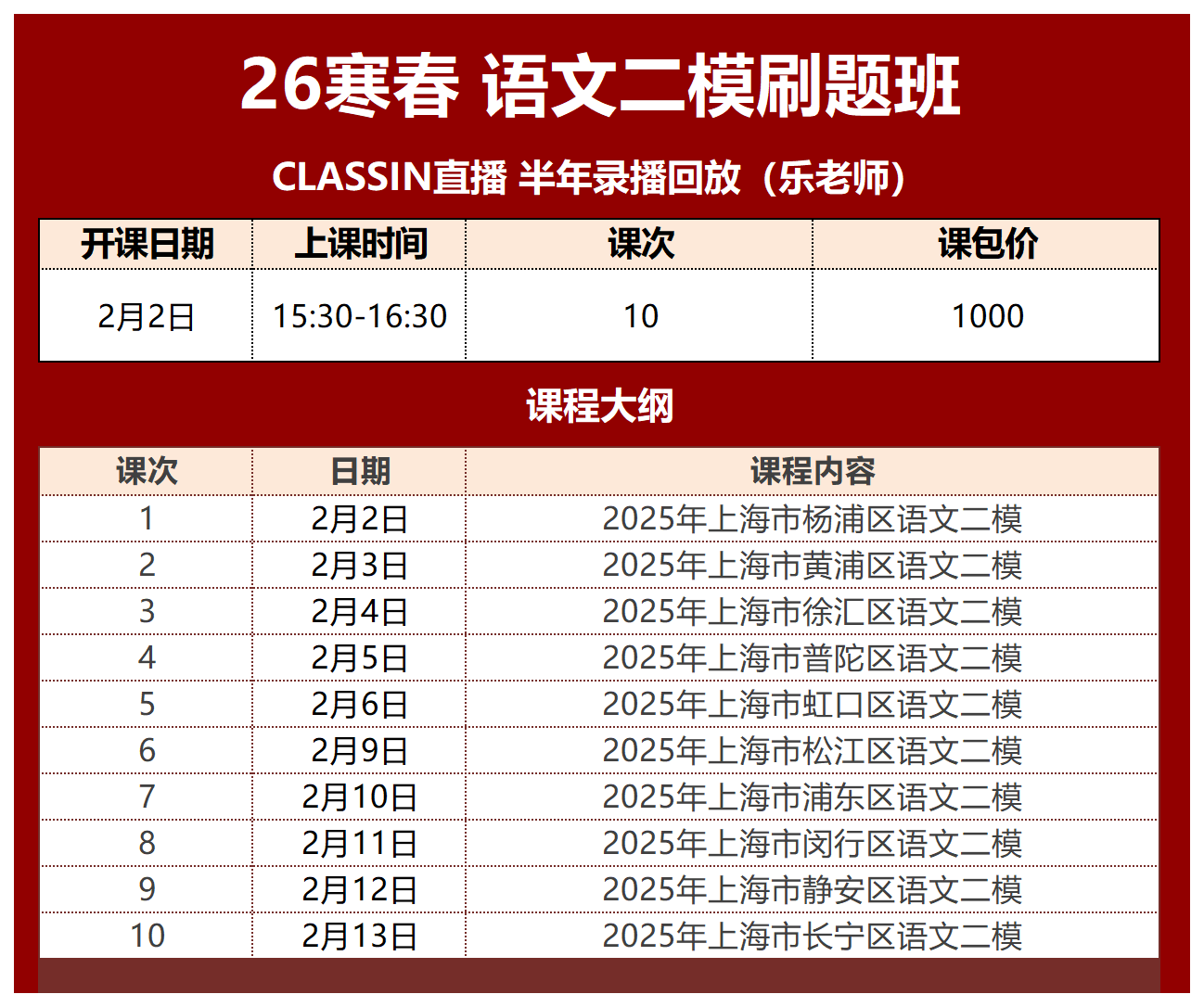 选取2025年10个教育强区的语文二模卷,在讲解过程中,深入剖析其高频考点和易错点。从文言文的翻译技巧,到现代文的深度解读和答题规范,每一处细节都不放过,让你对二模语文的考试内容了如指掌。