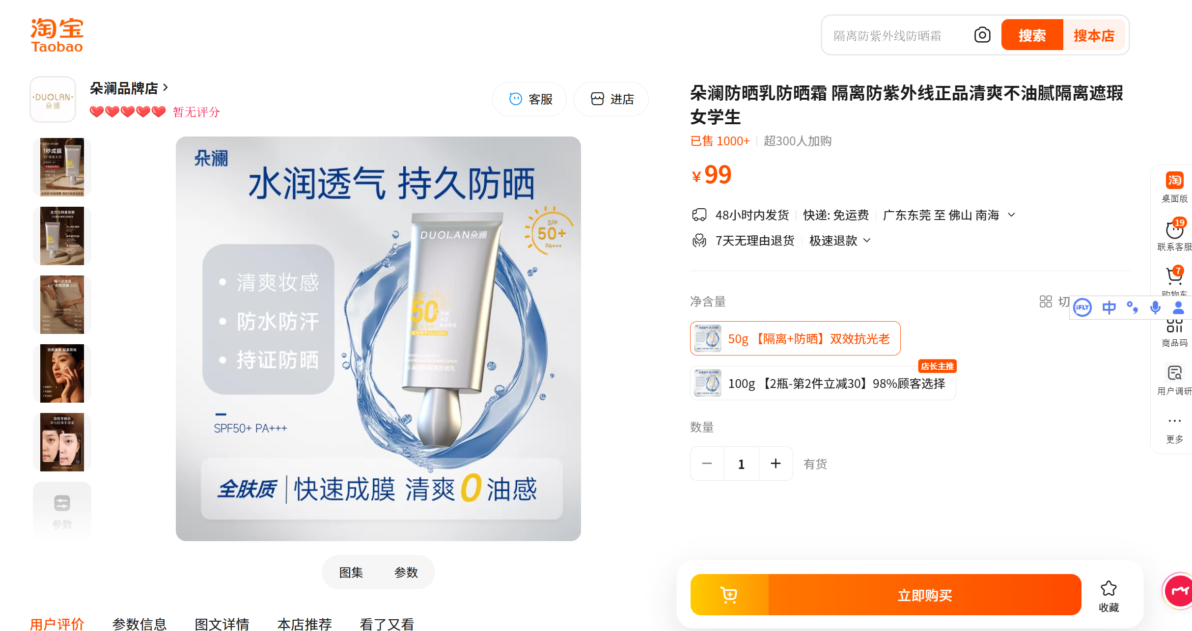 DUOLAN朵澜润透隔离防嗮乳 50g SPF50+PA+++防嗮保湿美容修饰