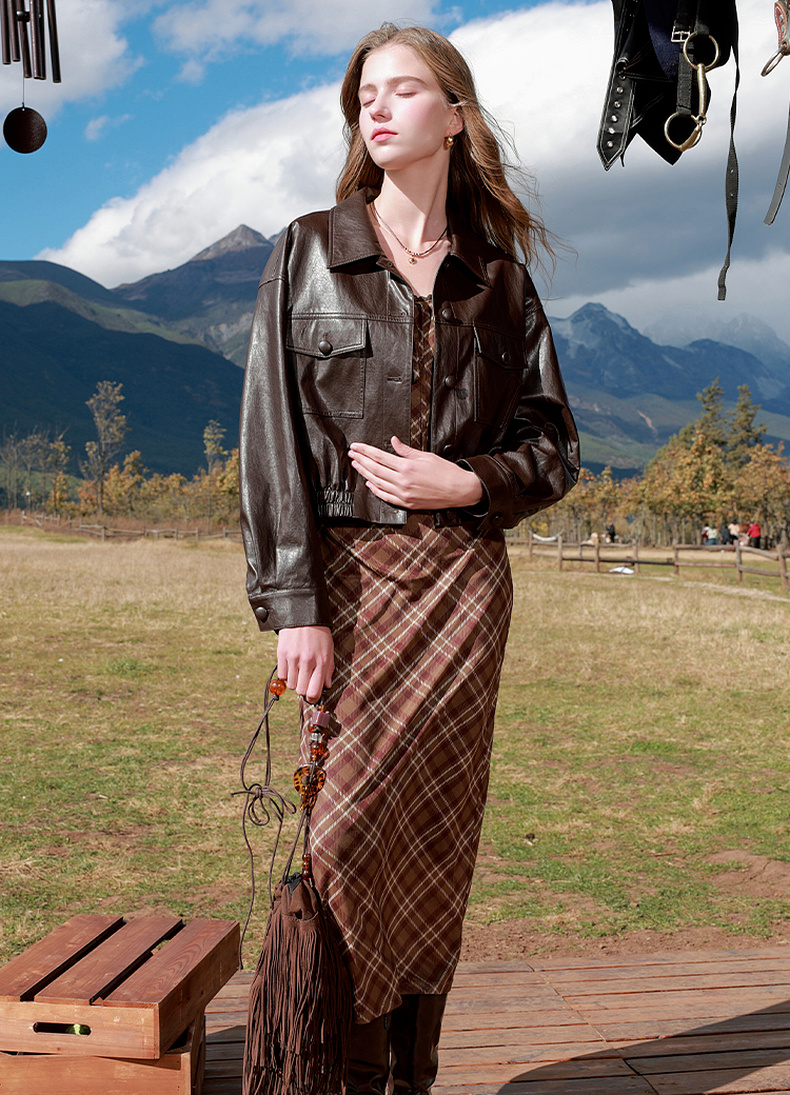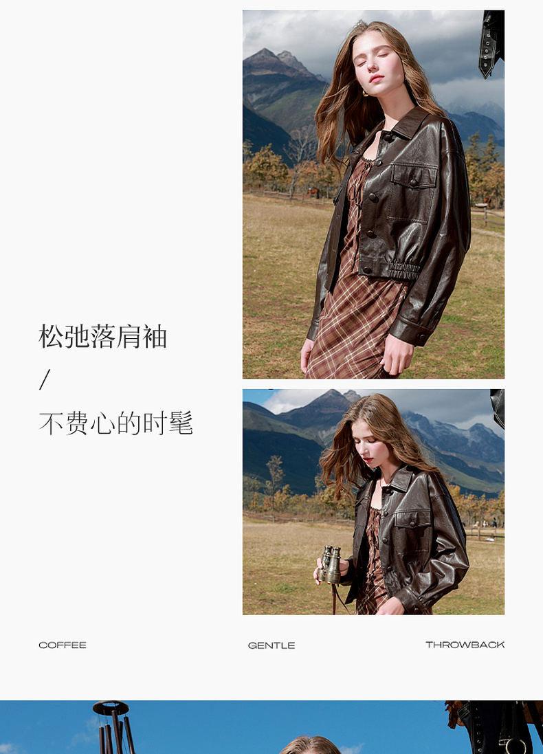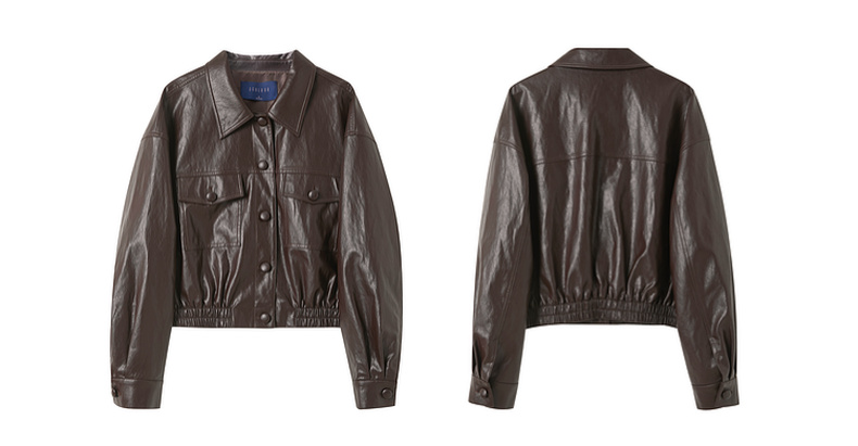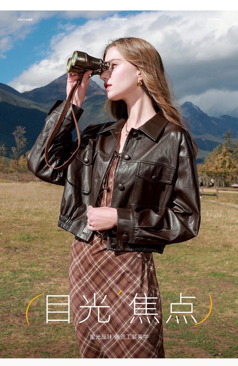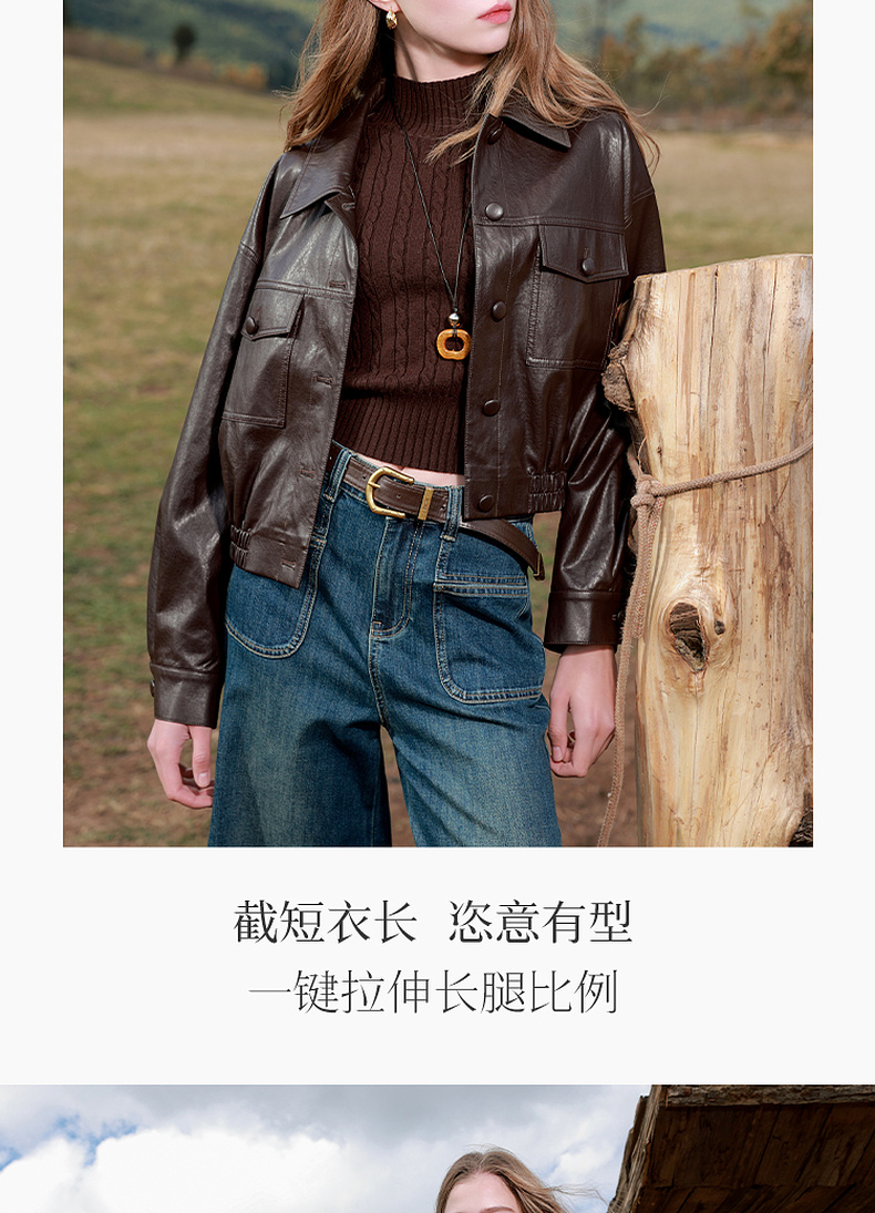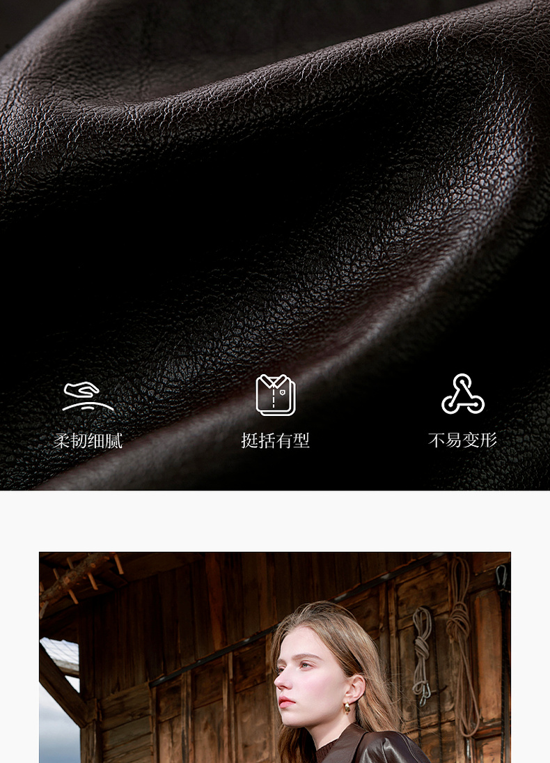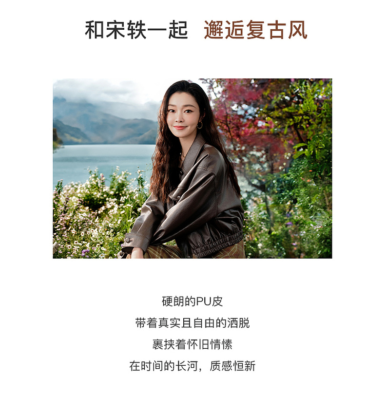 【宋轶同款】三彩2025秋季新款PU皮衣外套翻领宽松落肩袖上衣开衫皮夹克M