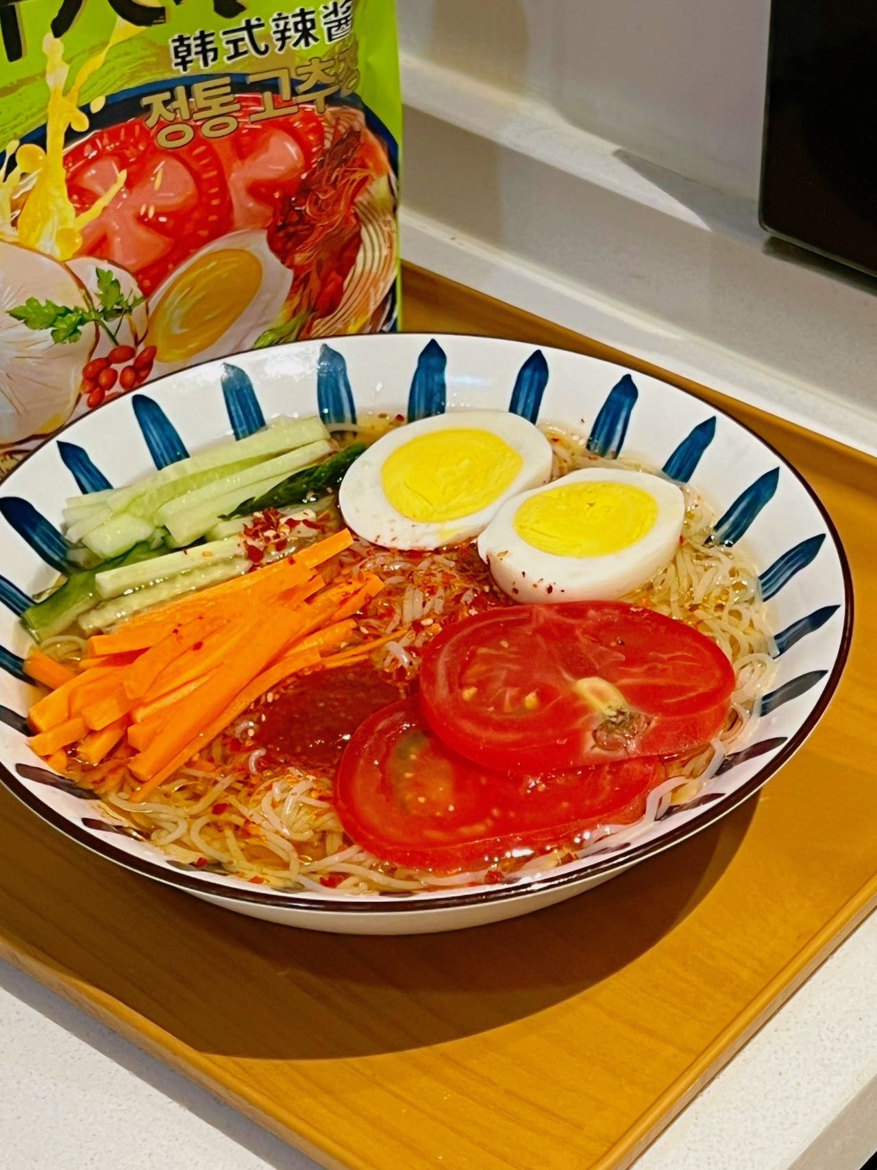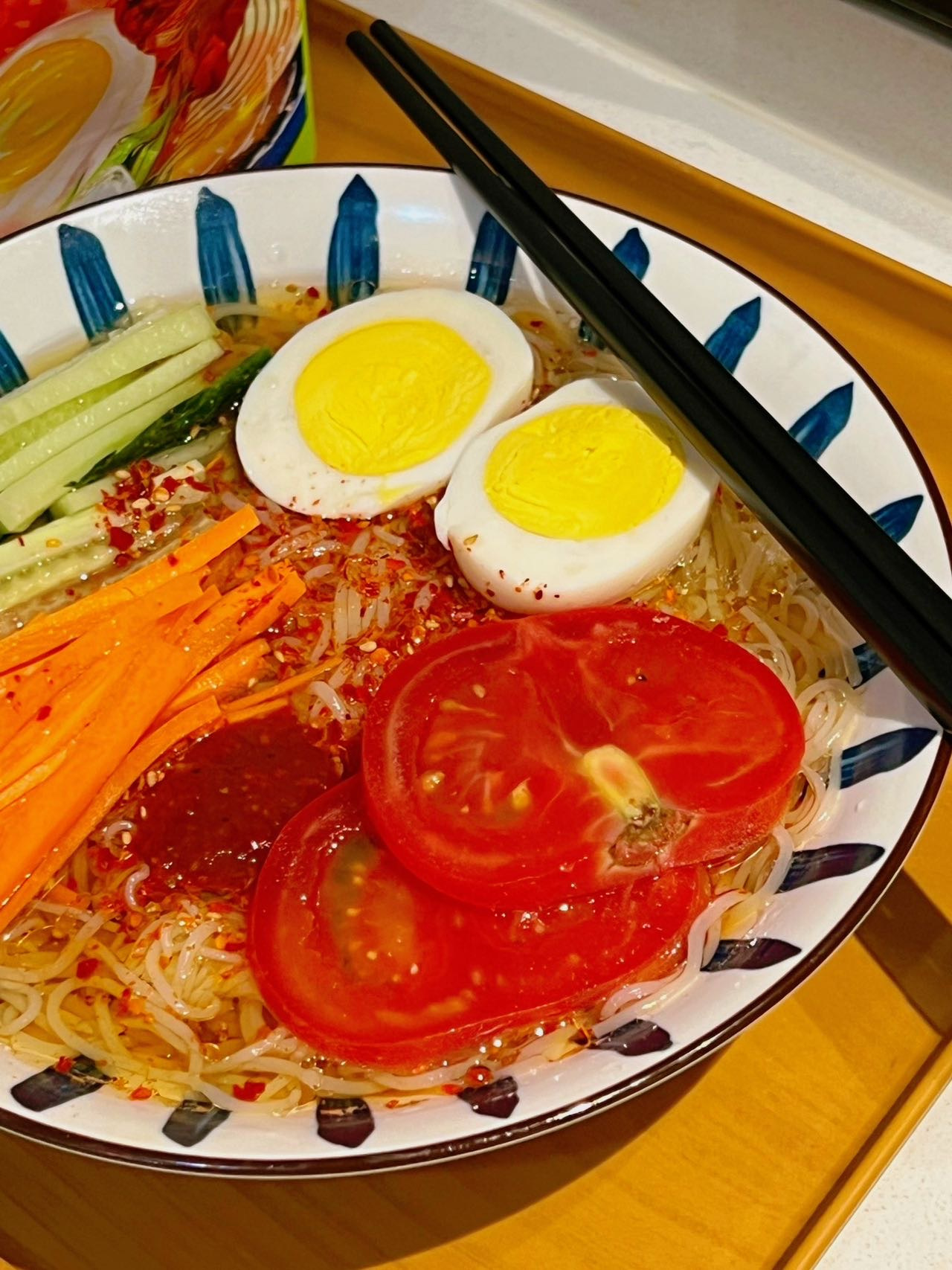 我告诉你们 一定要准备这些配菜:黄瓜切丝,圣女果对半切(西红柿切片),香菜切末,泡菜切块,鸡蛋煮白煮蛋后对半切 有条件的可以加牛肉片 ~ 真的好吃~16膳Q弹梨汁儿冷面 吃完还想继续吃~
