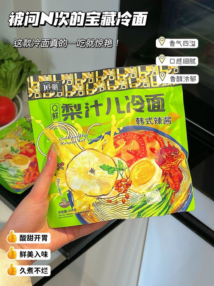 我觉得16膳Q弹梨汁儿冷面真的好值得!感觉是我吃过得好吃的冷面❗ 吃凉面,对着面吹一口这是什么该死的仪式感 ✅即食面条篇: 相比米饭、馒头要搭配下饭菜才可以的主食,面条简直方便 每天被纷繁的工作牵绊 真的需要一碗凉面提提神 面条劲道,味道鲜美浓郁 这才是便捷美食的正确打开方式