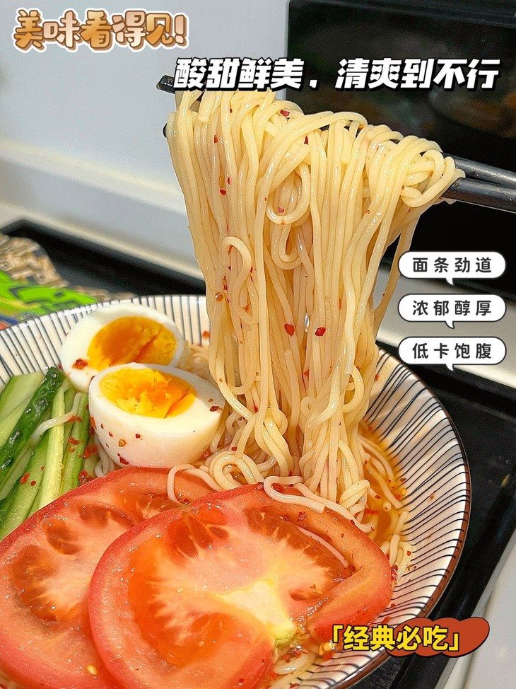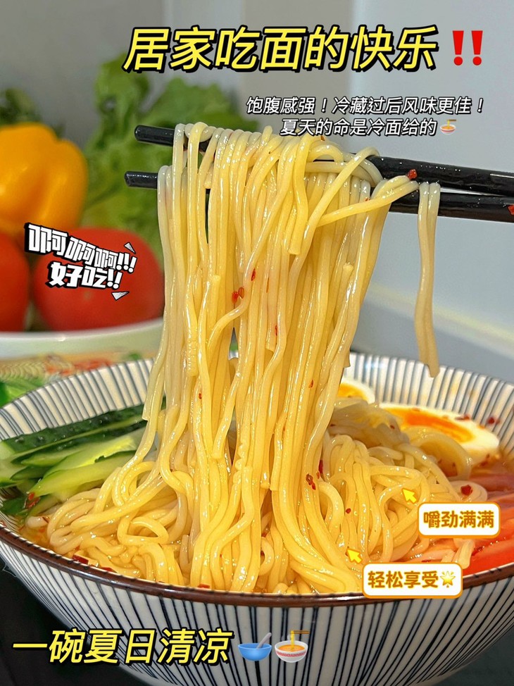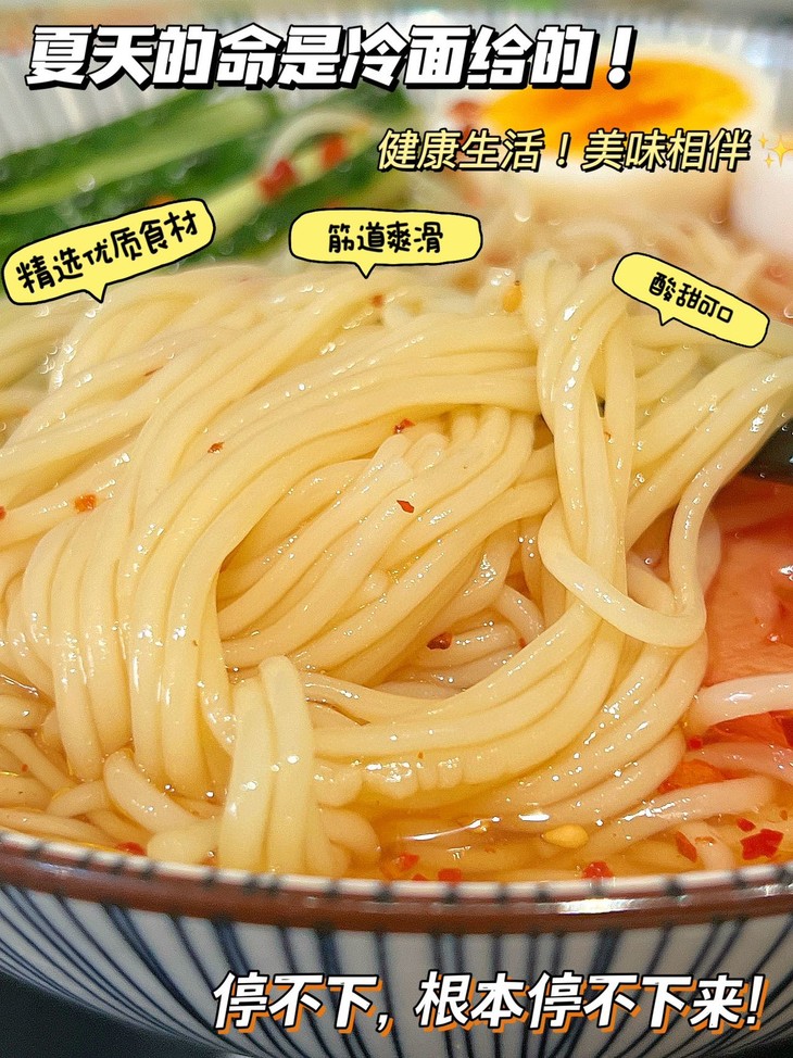 夏日街头的烧烤摊儿上需要一碗冷面,冬天热乎的炕头上也需要一碗带着冰碴的冷面,宅家看剧的时候需要一碗冷面,外出露营的时候也需要一碗冷面,甚至只要是一想起冷面,舌尖就忍不住蠢蠢欲动。相比米饭、馒头面条方便尤其是对于嘴急又犯懒的朋友,冷面就是美食的正确打开方式,每天被纷繁的工作牵绊,真的需要一碗凉面提提神,面条劲道,味道鲜美浓郁,这才是便捷美食的正确打开方式~总之,在燥热的盛夏,一碗冷冷的面总能让食欲大振、暑气顿消。天热心烦,多少人有了这碗凉面垫底,就能把夏天过得有滋有味。