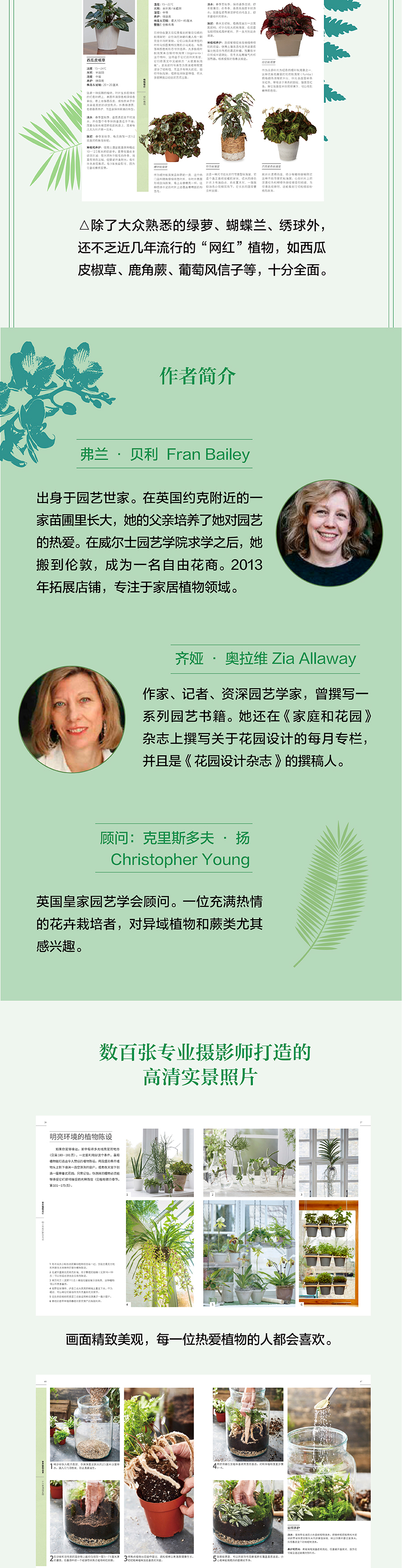 【作者简介】弗兰·贝利(Fran Bailey)出身于园艺世家。在英国约克附近的一家苗圃里长大,她的荷兰裔父亲培养了她对所有园艺相关事物的热爱。在威尔士园艺学院求学之后,她搬到伦敦,成为一名自由花商。2006年开设家花店,2013年拓展店铺,专注于家居植物领域。