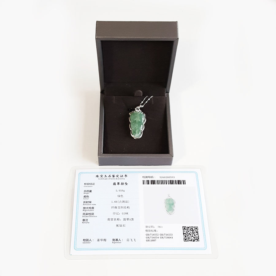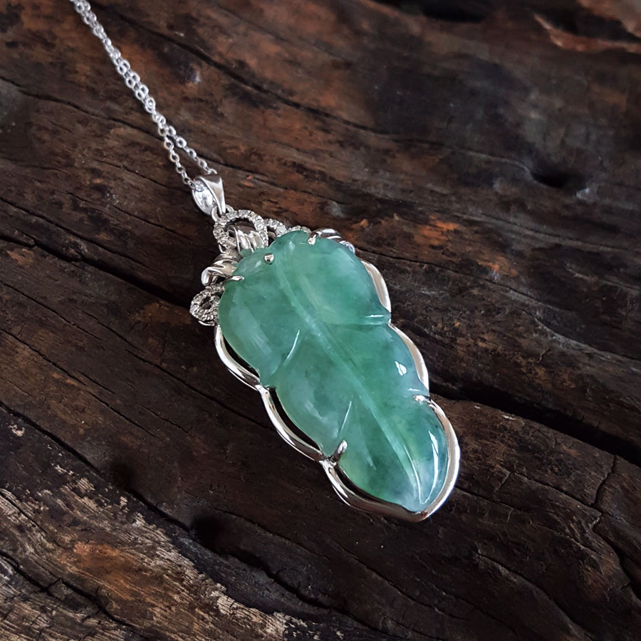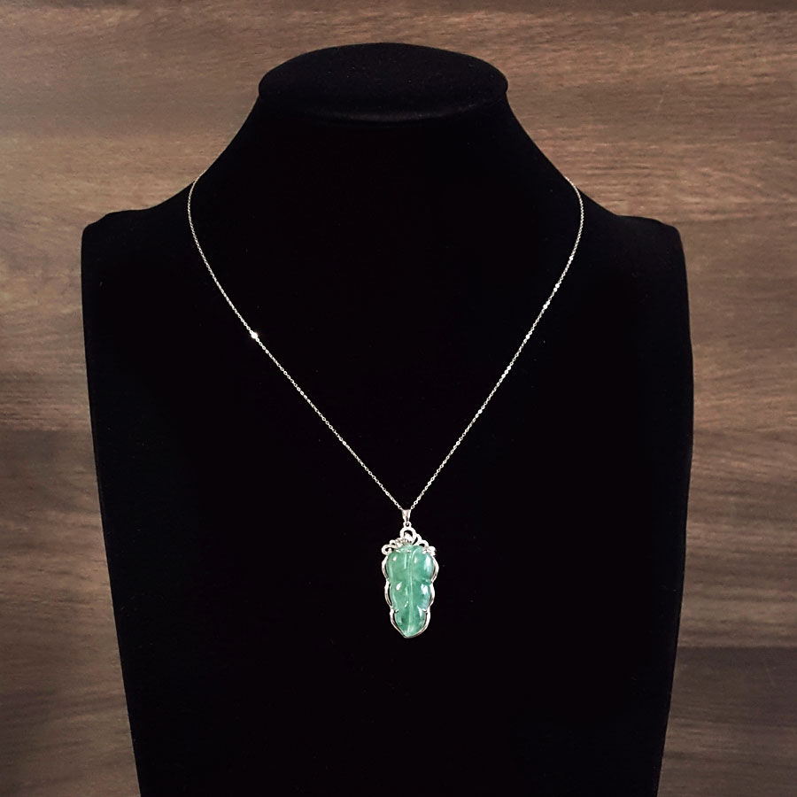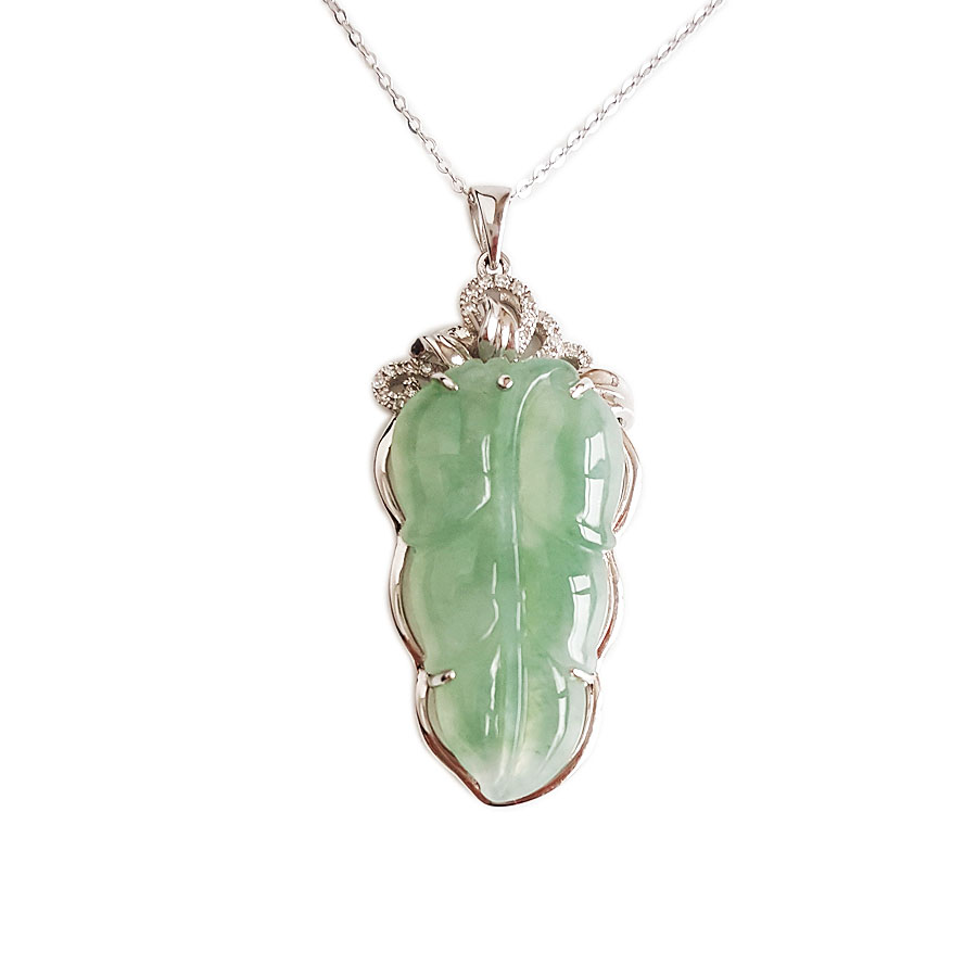名称 | AU750白金镶钻镶天然细腻冰种叶子(金枝玉叶)翡翠吊坠项链 |