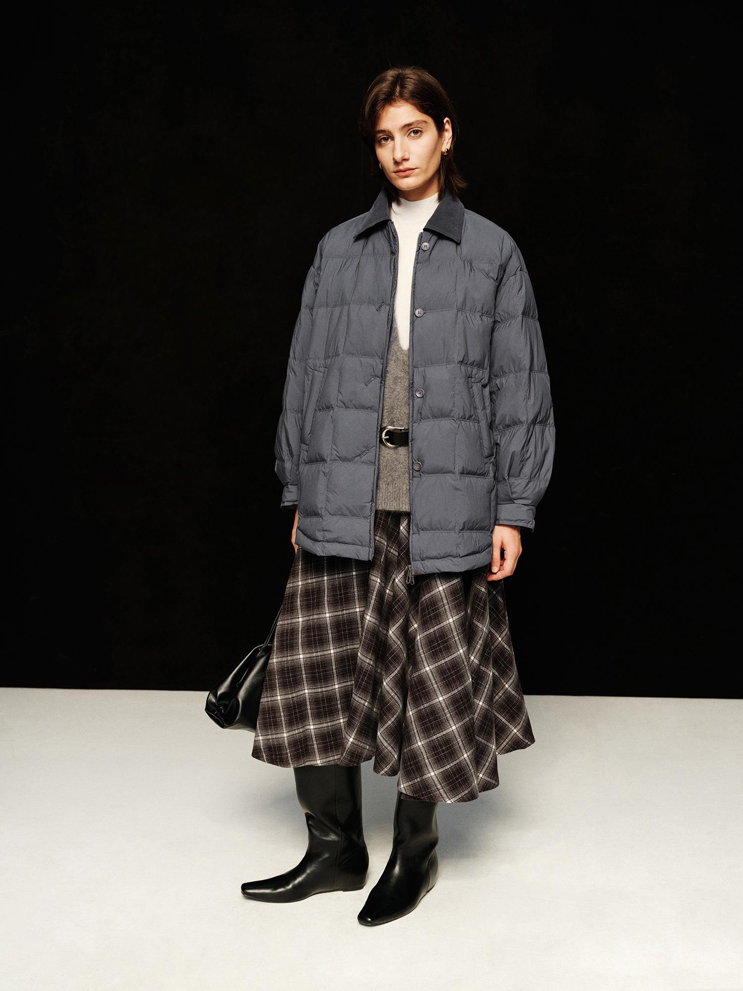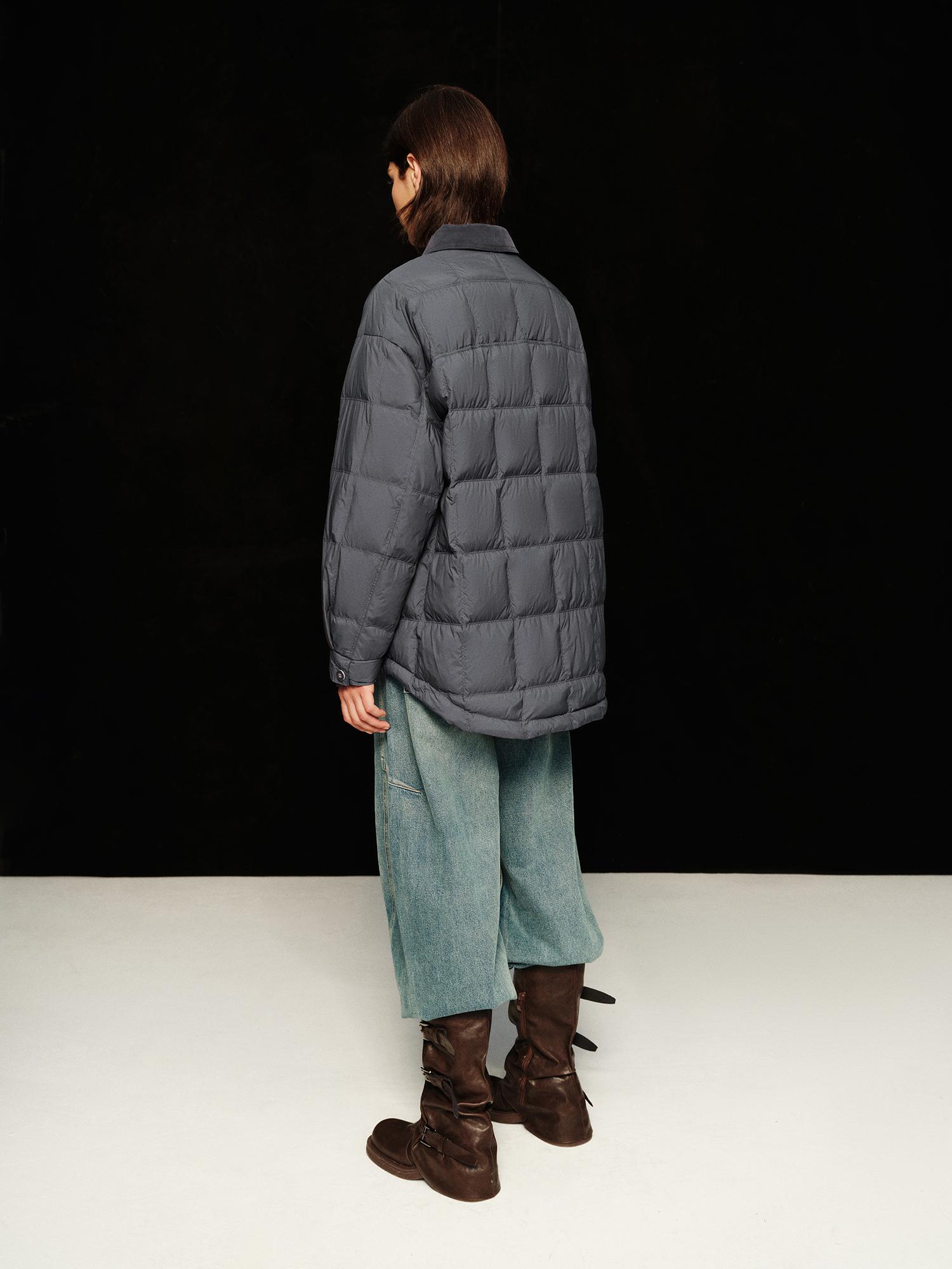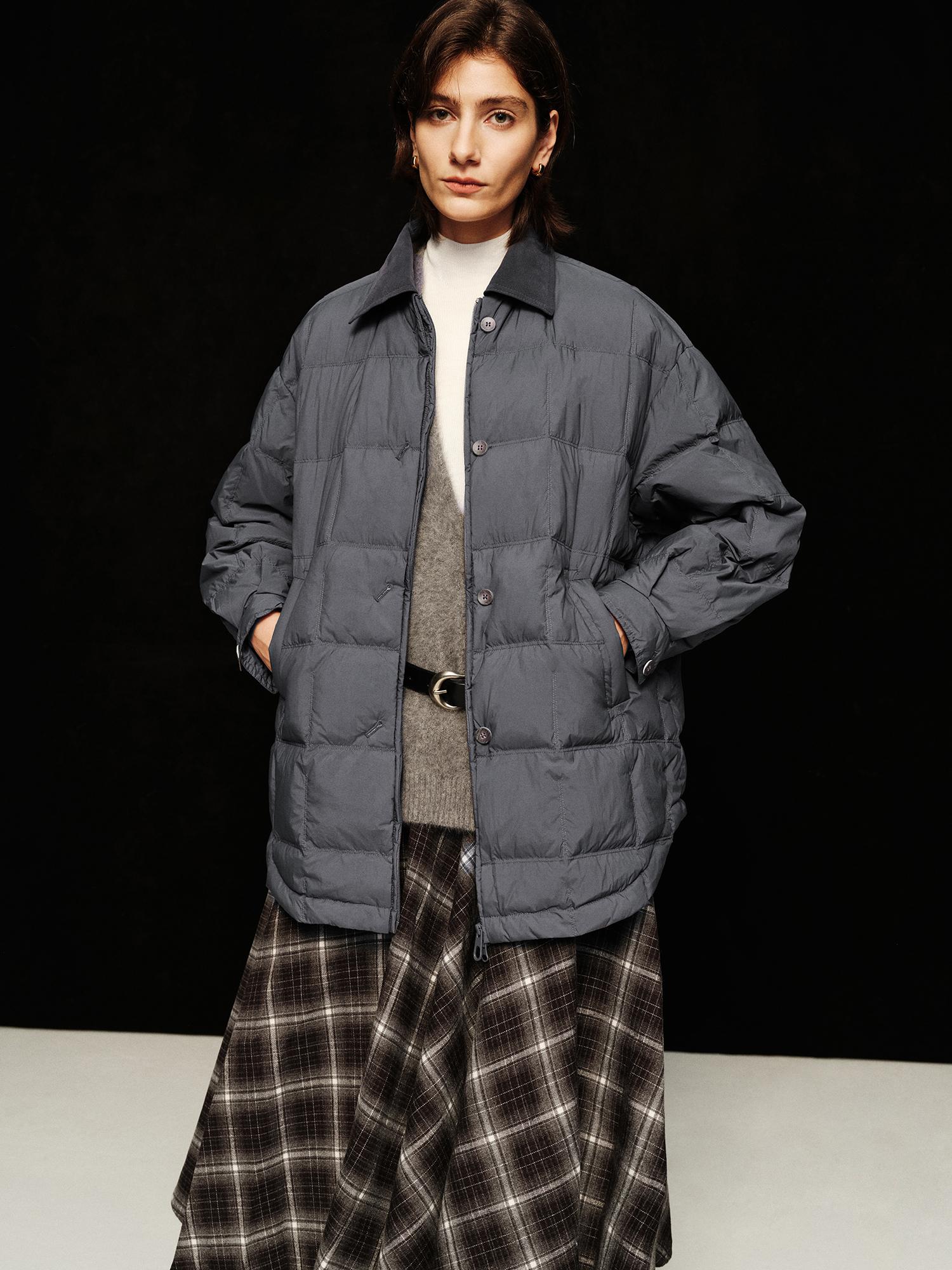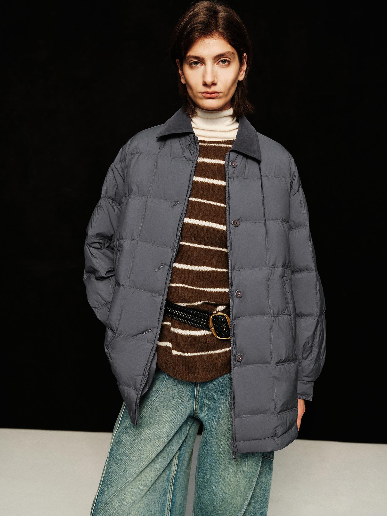 N°28 90白鸭绒羽绒服女秋冬新款撞色pu皮翻领中长款宽松保暖外套8955A1R105
