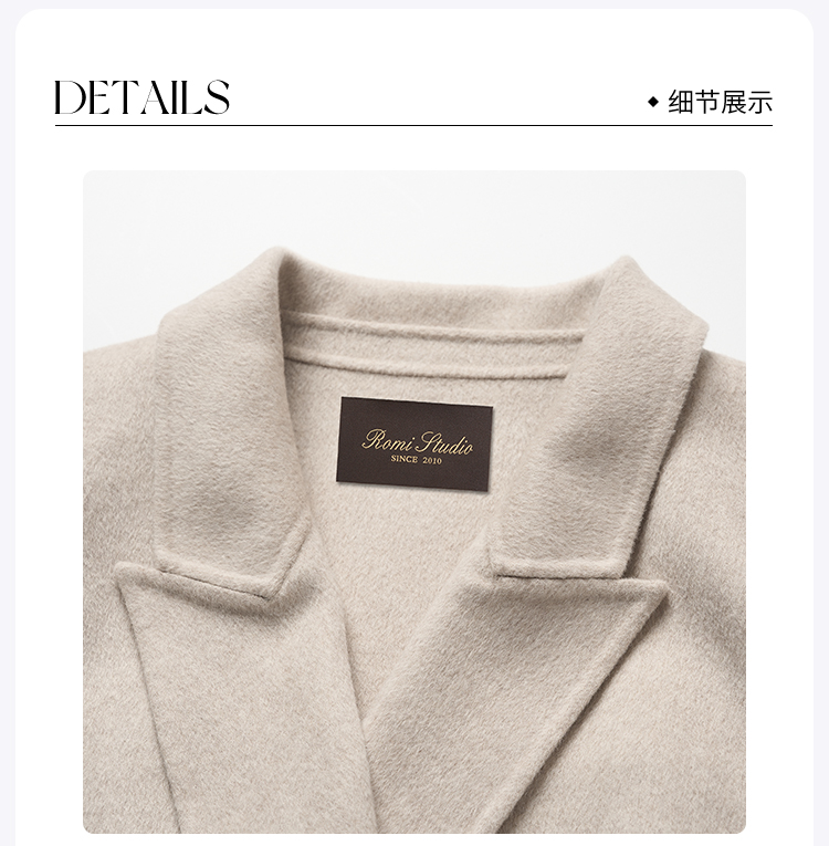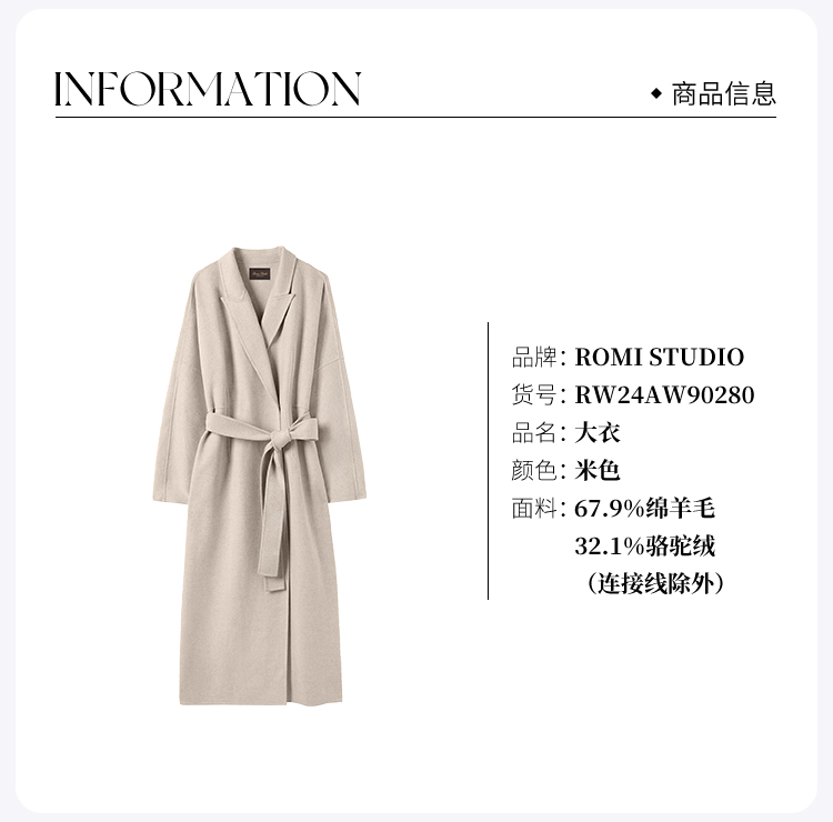ROMI STUDIO“棕标甄选”骆驼绒绵羊毛混纺收腰毛呢大衣RW24AW90280