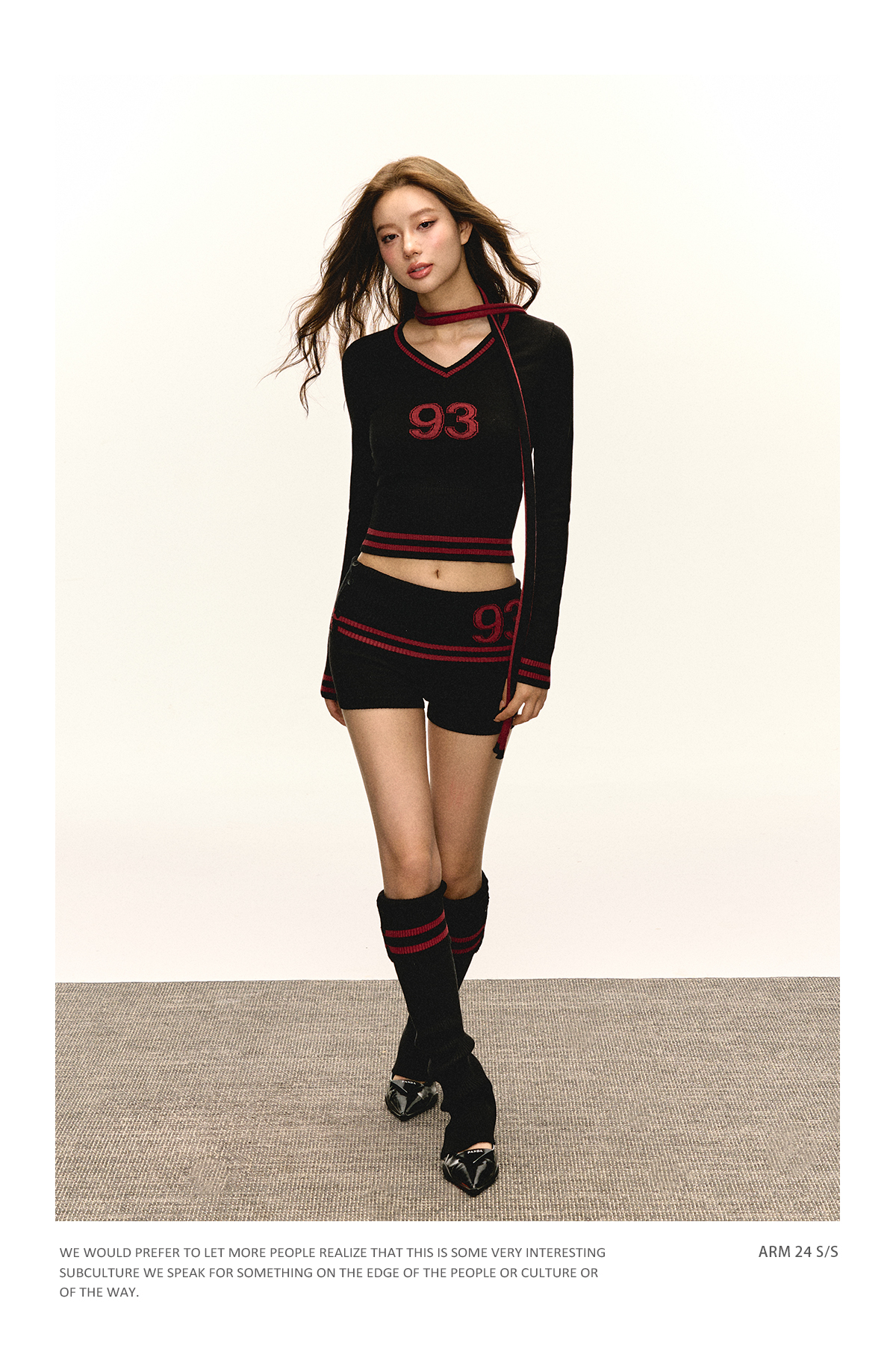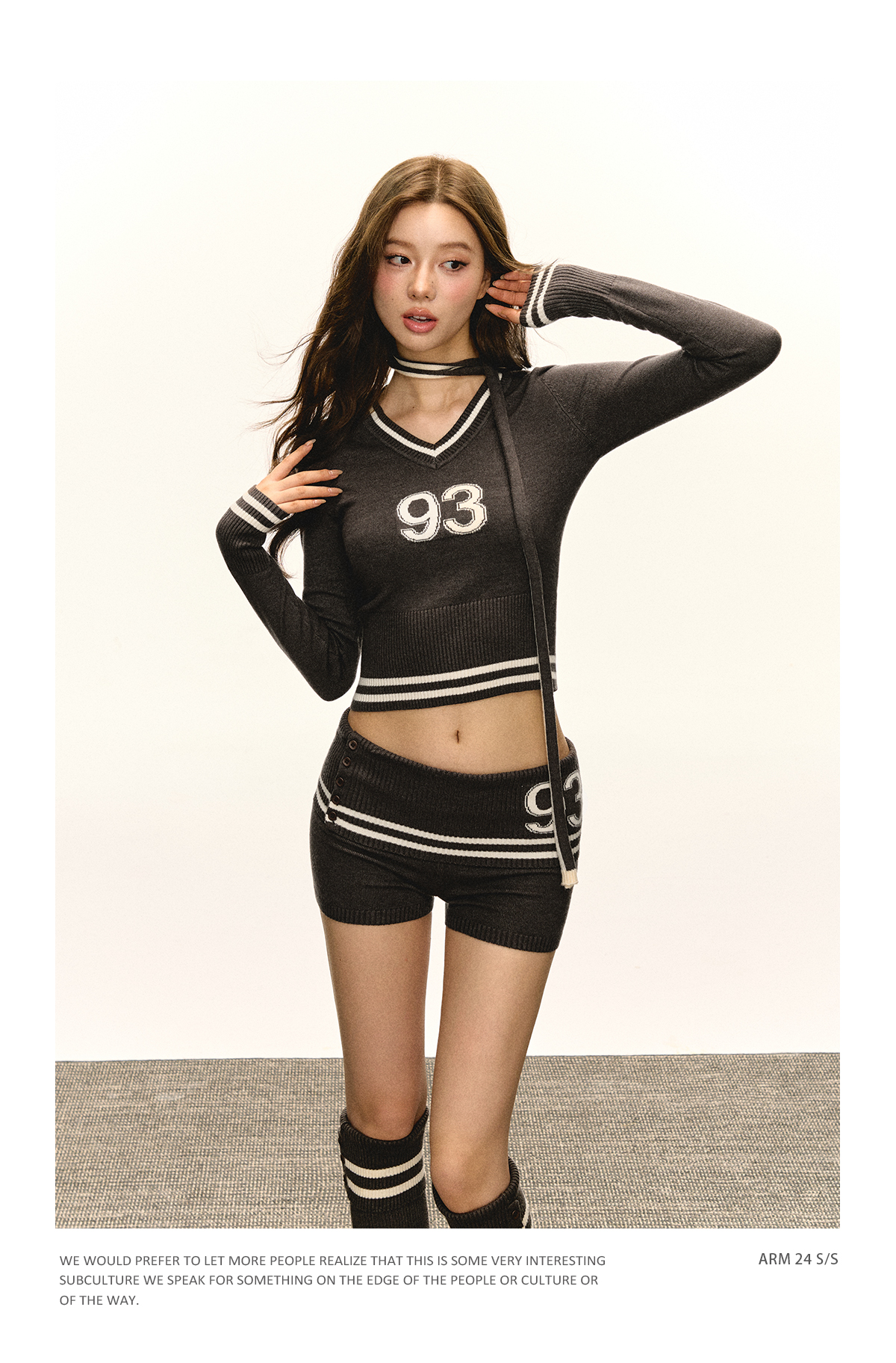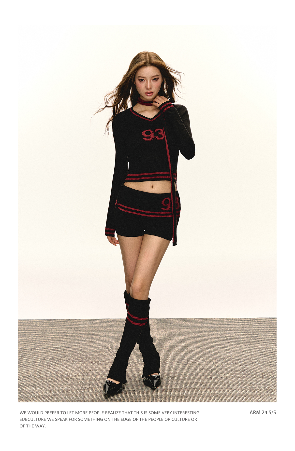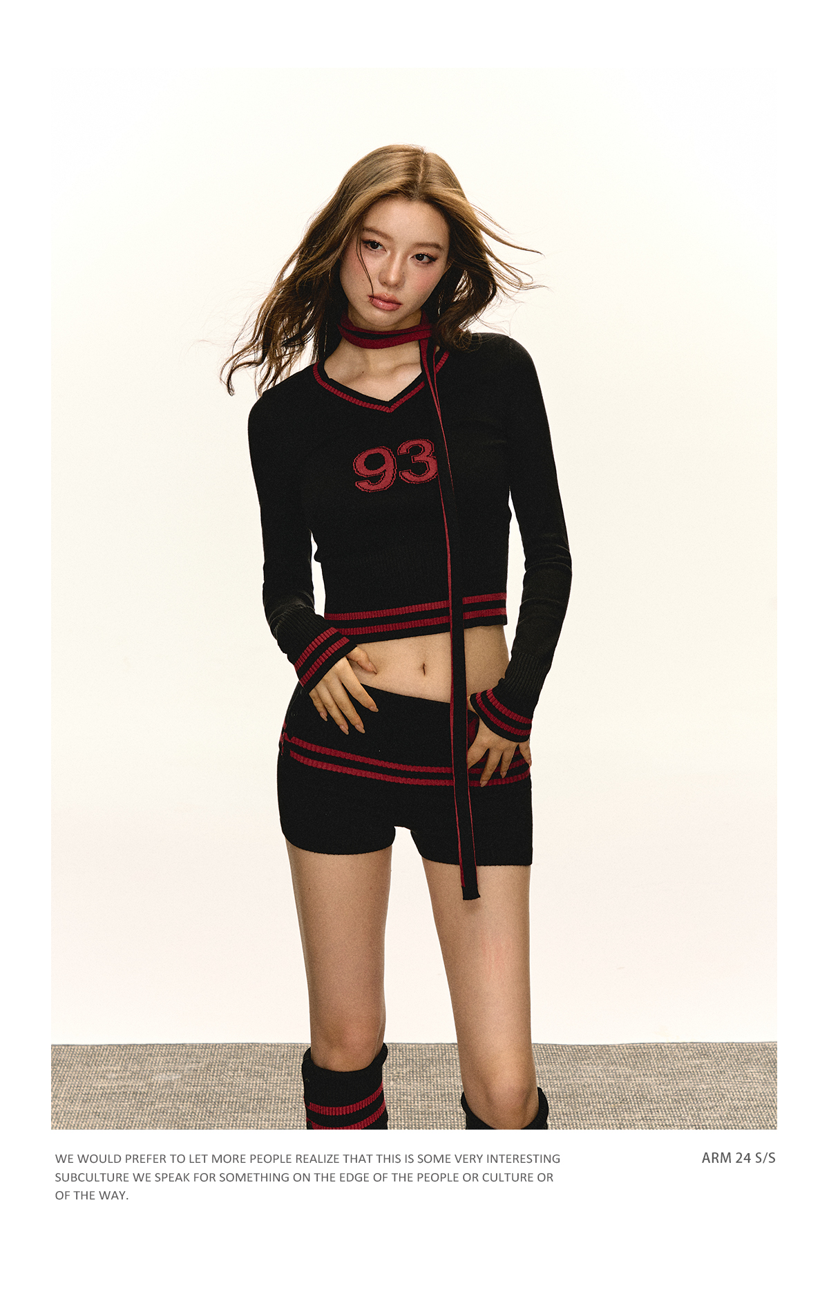 Ariseism 美式复古紧身V领短款针织衫短裤女四件套套装女春季新款