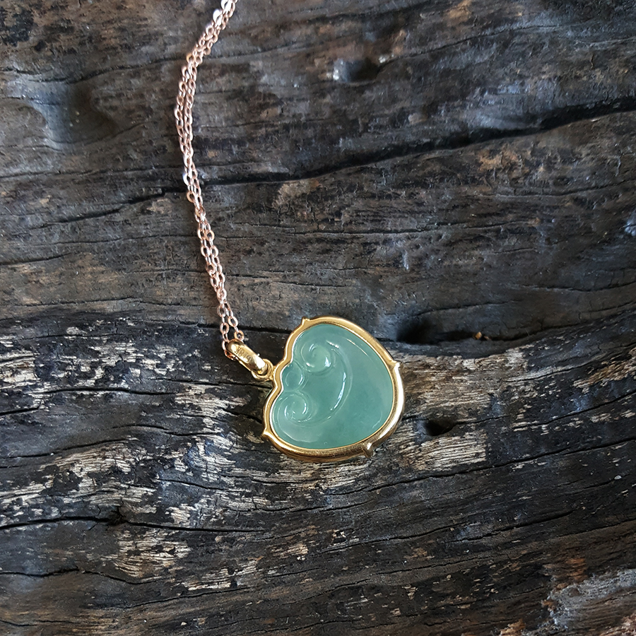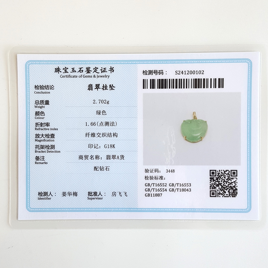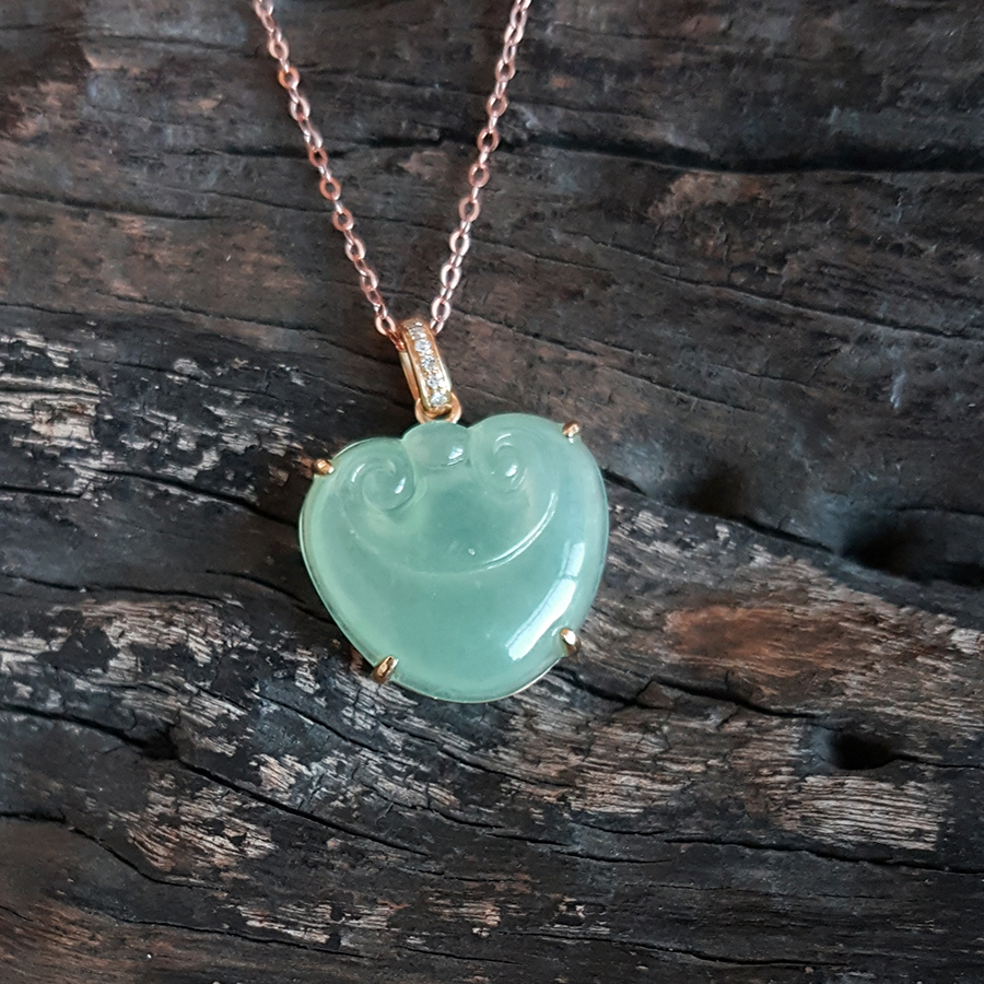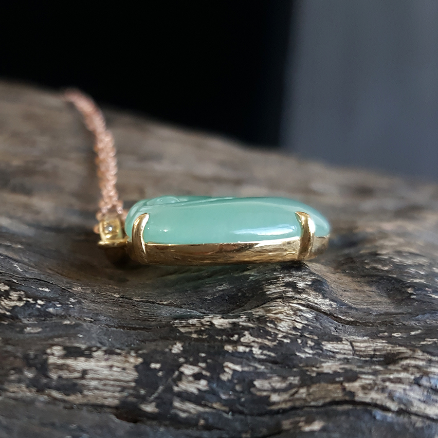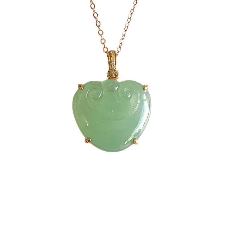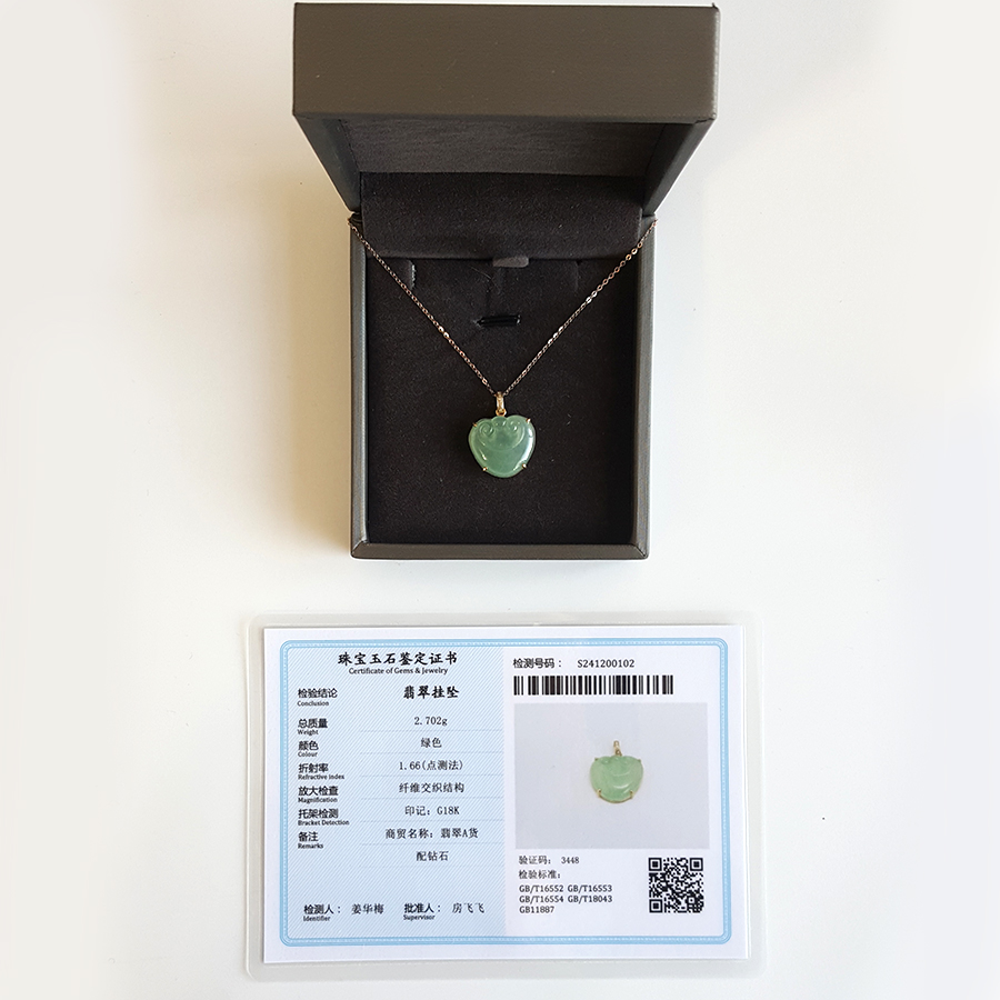 名称 | AU750黄金镶钻镶天然冰种绿色如意造型翡翠吊坠项链 |