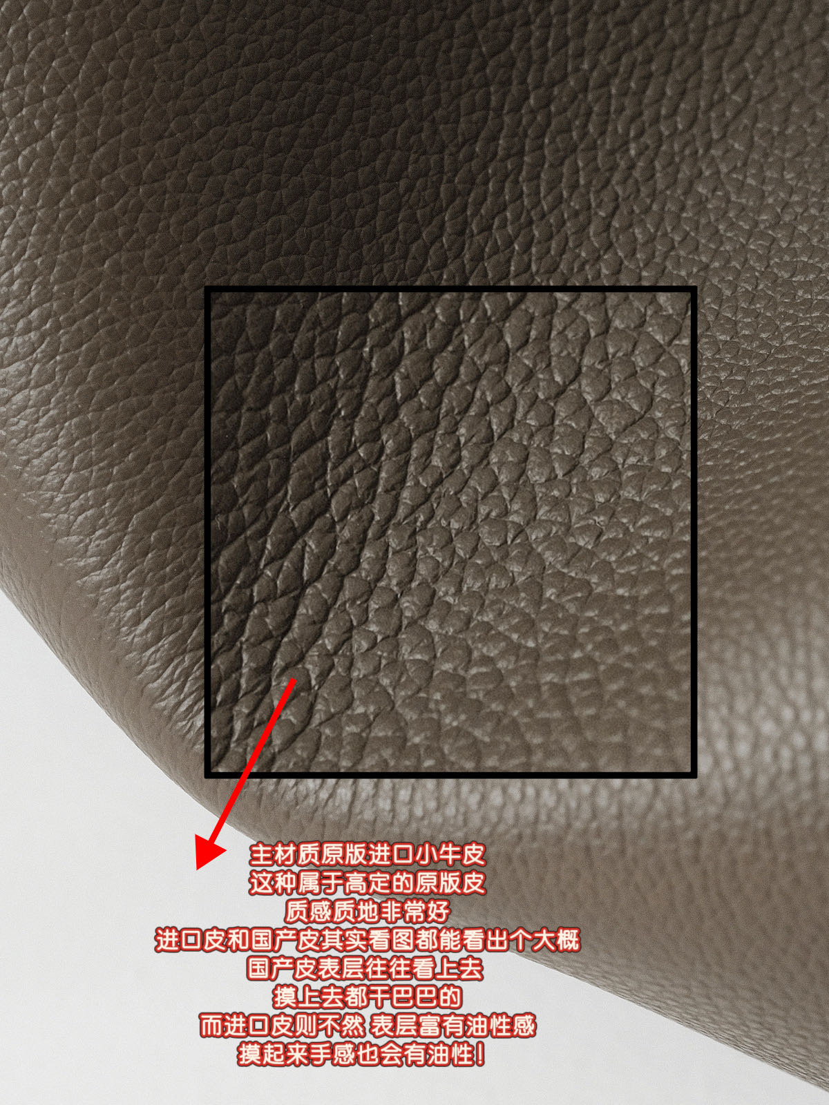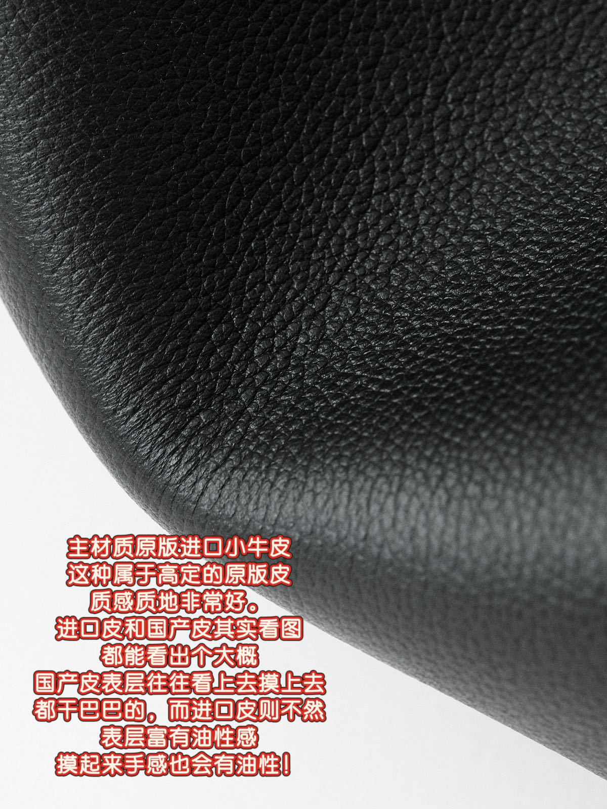 主材质原版进口小牛皮,这种属于高定的原版皮,质感质地非常好。进口皮和国产皮其实看图都能看出个大概,国产皮表层往往看上去摸上去都干巴巴的,而进口皮则不然,表层富有油性感,摸起来手感也会有油性!