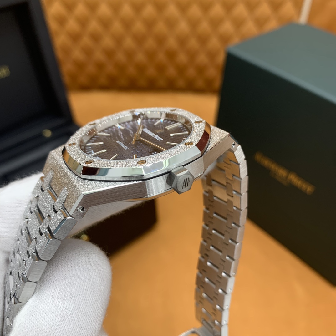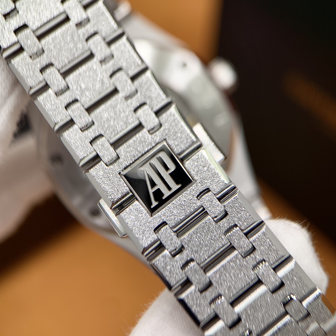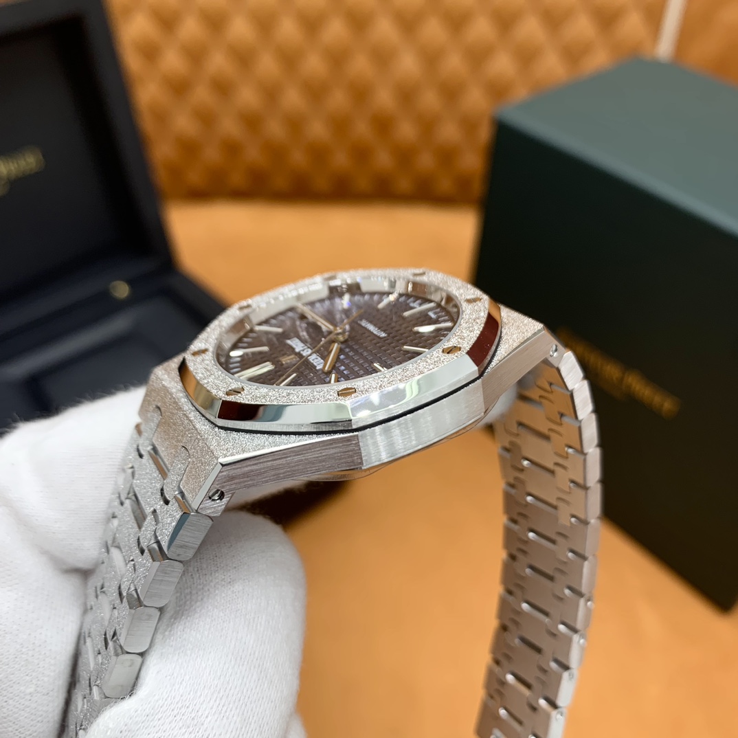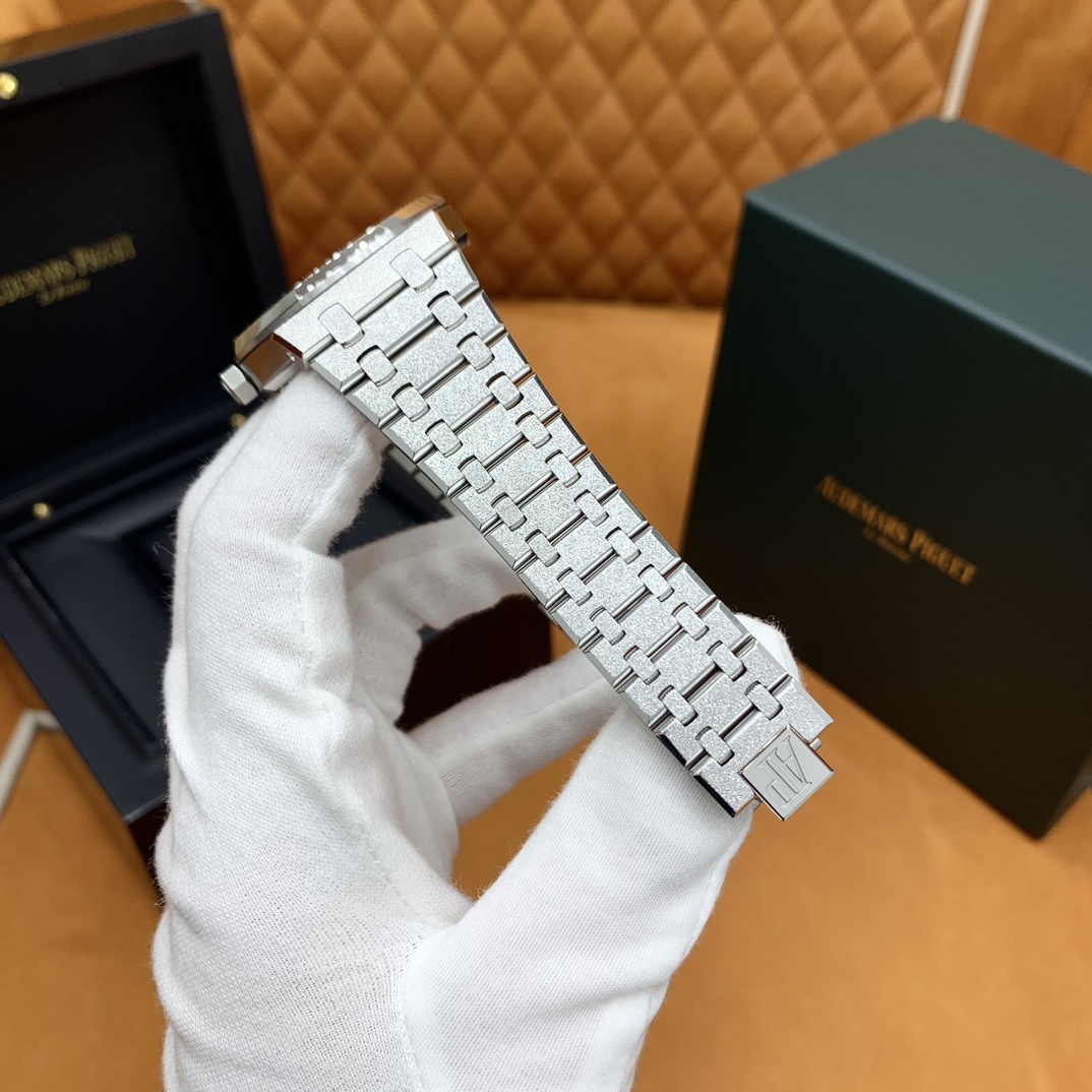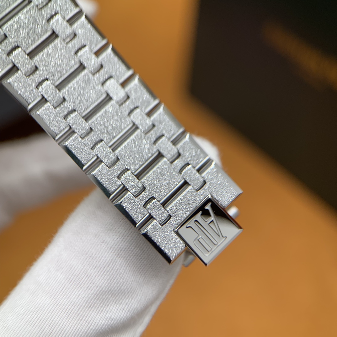 🏷️ 离岸橡树系列15410BC.GG.1224BC.01 (霜金41mm) 采用原版爱彼3120一体复刻机芯,瑞士自动陀片,陀片中轴和原版一致,原版三角避震器,瑞士级精工打磨,刻字清晰不磨损,纹理细腻,一丝不苟,日历系统和原版一致。 霜金限量款,真的有种独一无二的魅力!全球限量200枚,还原佛罗伦萨工艺打造的霜金纹理,犹如钻石般璀璨,简直是颜值与工艺的双重巅峰! 八角形的表壳,极具硬朗运动风格,侧面高亮抛光和正面的霜金效果交错对应,呈现出一种高级感。霜金表带,折叠式表扣,实用耐看,霜金工艺做得很细腻,细节都跟足了原版~ 盘面饼干纹路 字面 logo做工颜色和原版放一起看不出有什么区别,可以说挑不出任何毛病👌🏻 这表上手效果超级高级,适合那些注重细节和独特品味的小哥哥!心动就赶紧入手! 尺寸:41X9.8mm