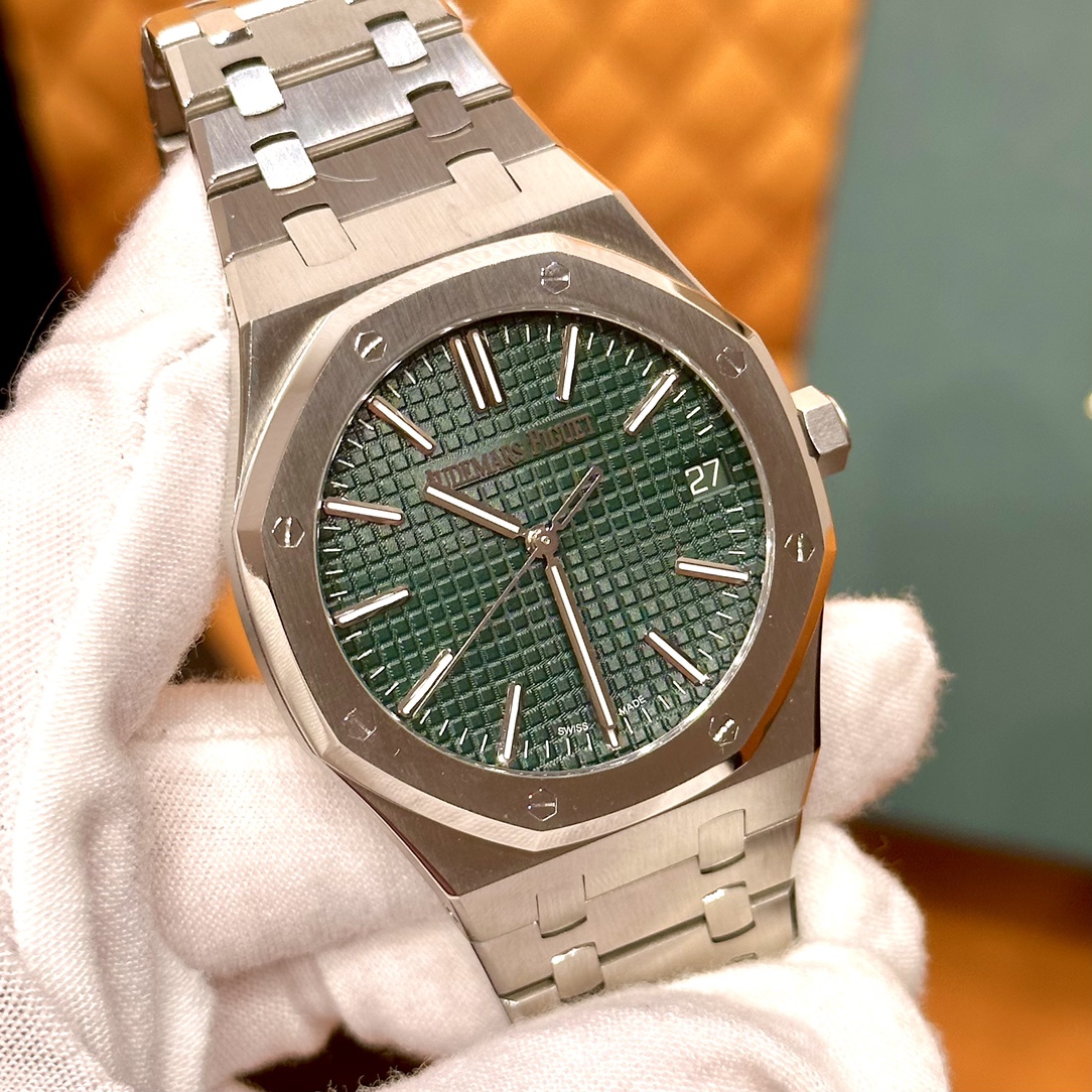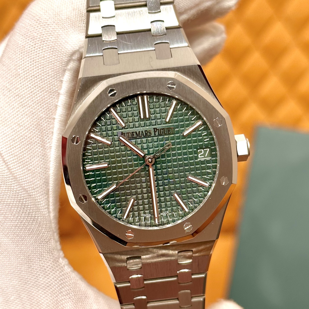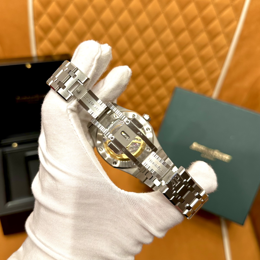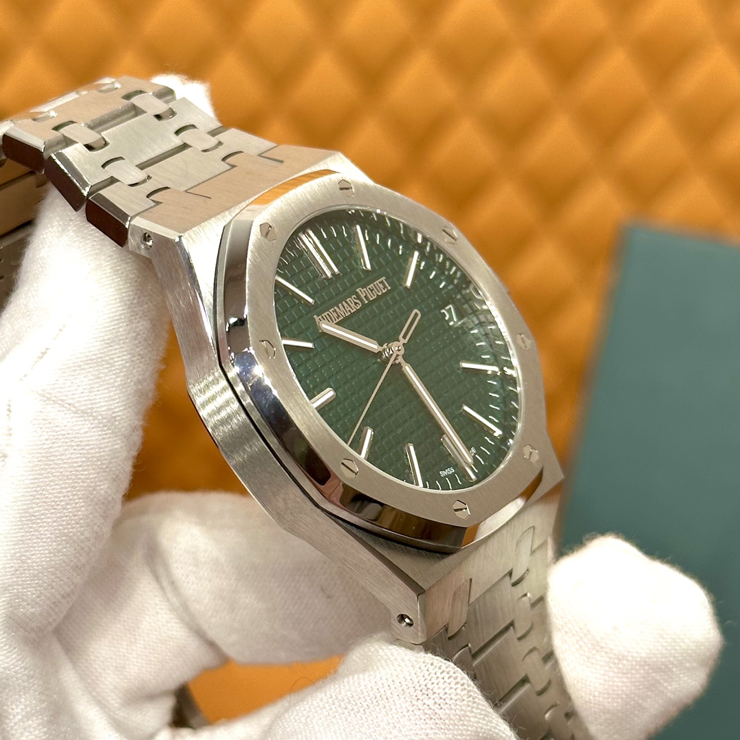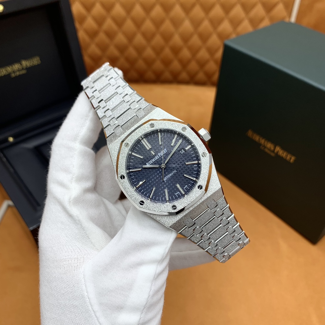 🏷️ 离岸橡树系列15410BC.GG.1224BC.01 (霜金41mm) 采用原版爱彼3120一体复刻机芯,瑞士自动陀片,陀片中轴和原版一致,原版三角避震器,瑞士级精工打磨,刻字清晰不磨损,纹理细腻,一丝不苟,日历系统和原版一致。 霜金限量款,真的有种独一无二的魅力!全球限量200枚,还原佛罗伦萨工艺打造的霜金纹理,犹如钻石般璀璨,简直是颜值与工艺的双重巅峰! 八角形的表壳,极具硬朗运动风格,侧面高亮抛光和正面的霜金效果交错对应,呈现出一种高级感。霜金表带,折叠式表扣,实用耐看,霜金工艺做得很细腻,细节都跟足了原版~ 盘面饼干纹路 字面 logo做工颜色和原版放一起看不出有什么区别,可以说挑不出任何毛病👌🏻 这表上手效果超级高级,适合那些注重细节和独特品味的小哥哥!心动就赶紧入手! 尺寸:41X9.8mm