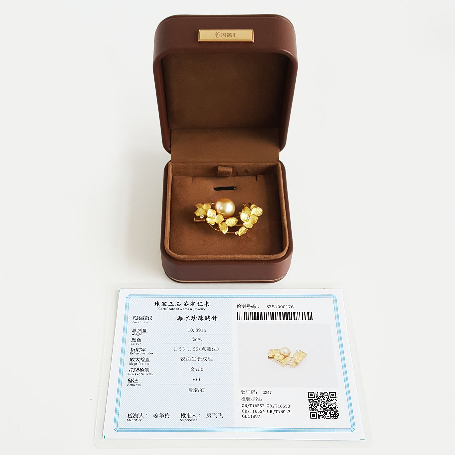 【天然正品】AU750精品黄金镶钻镶天然近圆约11.5MM金色南洋海水珍珠胸针11.5MM(皆取最大值)女士051025NJ32