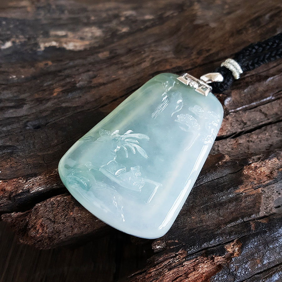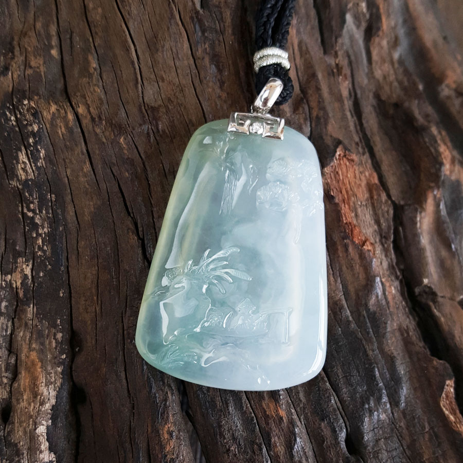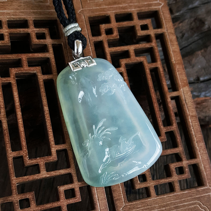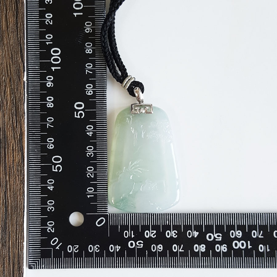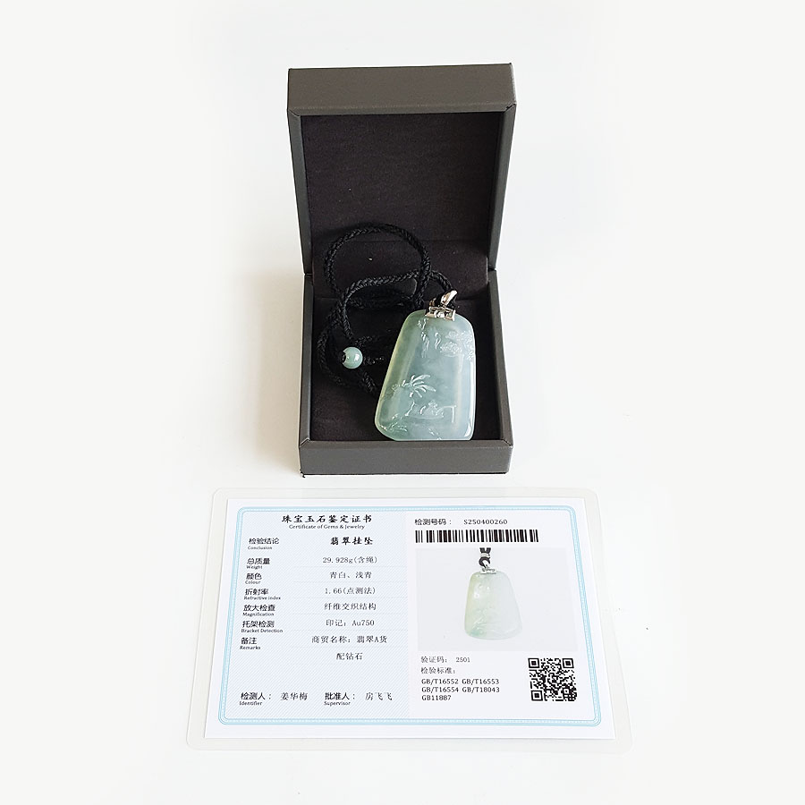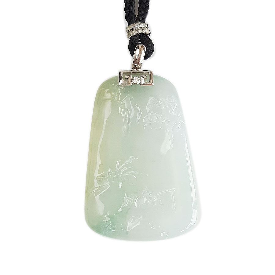 名称 | AU750收藏级白金镶钻镶天然细腻无纹裂冰种山水平安无事牌翡翠吊坠项链 |